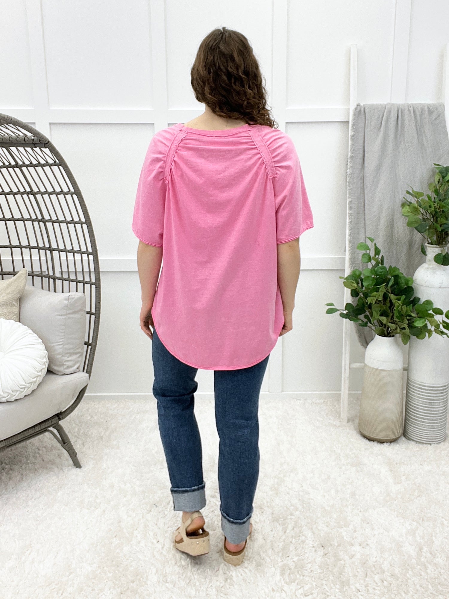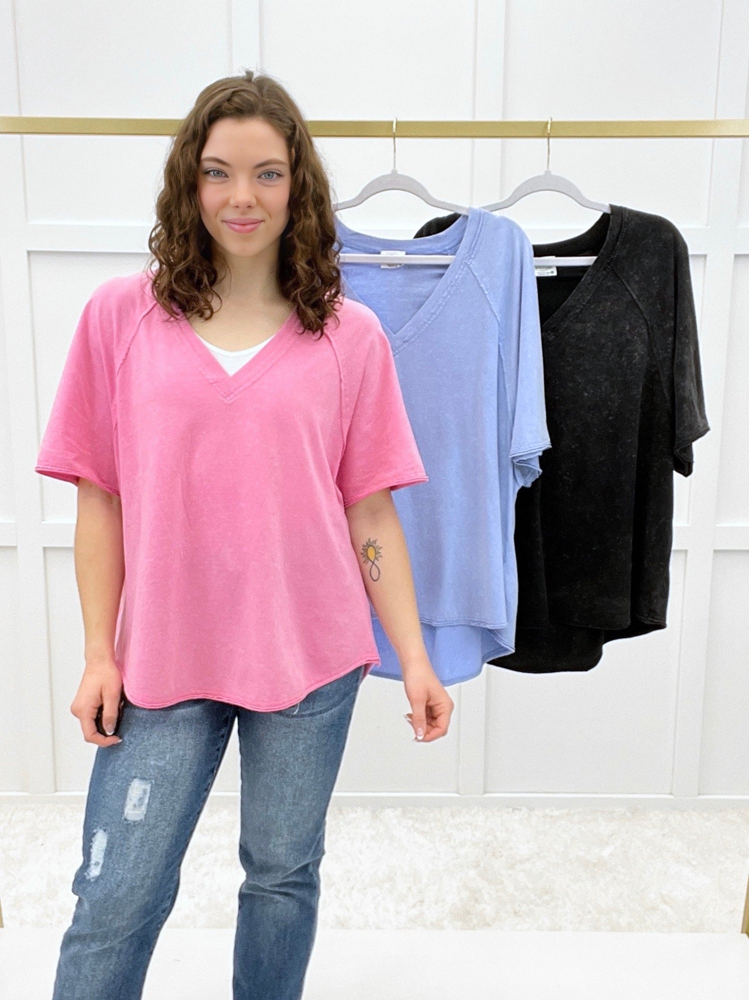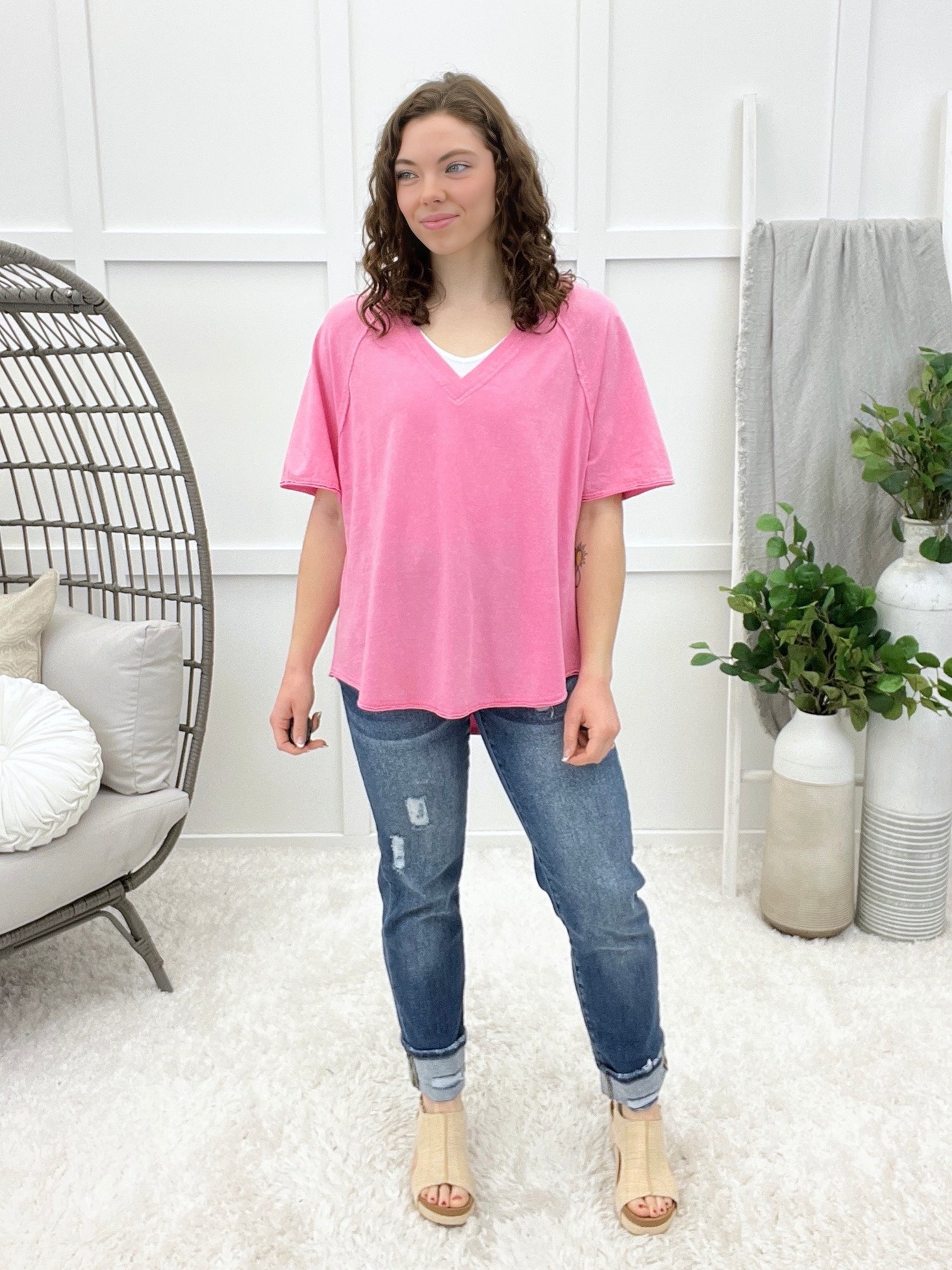 Slip into effortless style with this oversized knit top featuring a flattering V-neck and playful raw edge details that give major laid-back vibes. The mineral-washed fabric adds that perfectly lived-in look, while the back shirring detail creates a subtle cinch that keeps things interesting. Short sleeves and a relaxed fit make it your new go-to for casual days that still feel put-together.