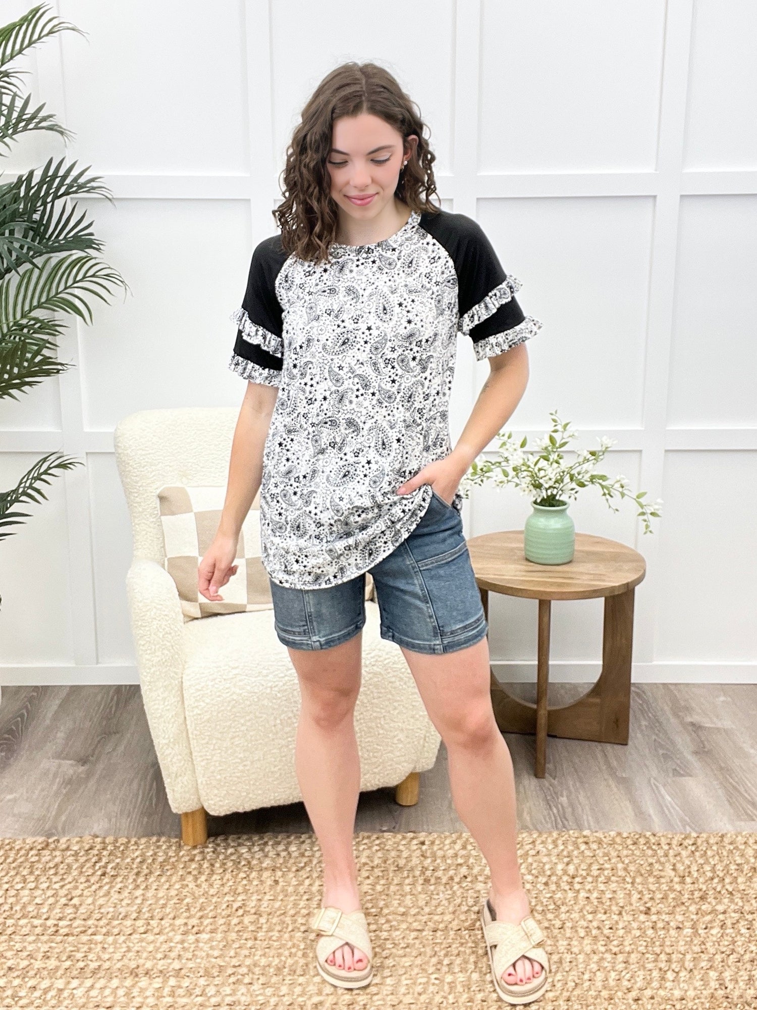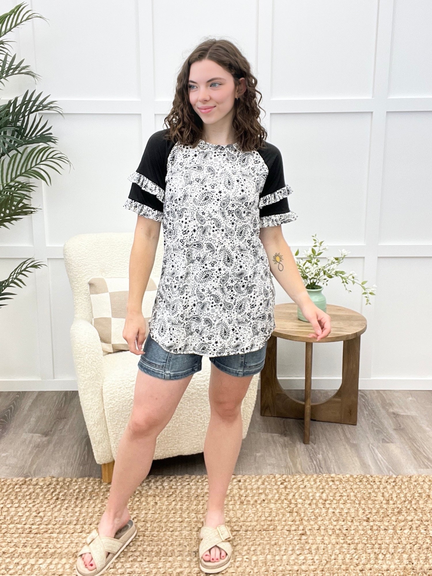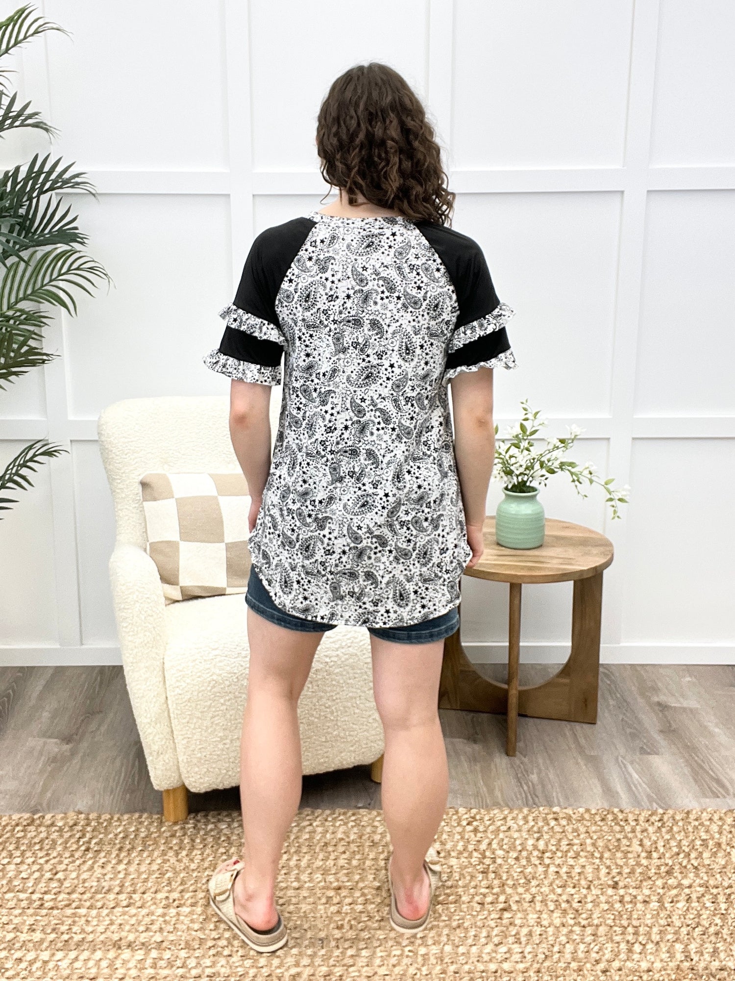 Dance through your day in this delightful ribbed knit top! The charming paisley print adds a splash of personality, while playful tiered ruffle sleeves bring boutique-chic flair to your wardrobe. Breathable fabric keeps you comfy, and the relaxed fit with round neckline makes styling a breeze. Whether you're brunching with friends or heading to dinner, this versatile top is just what you need!