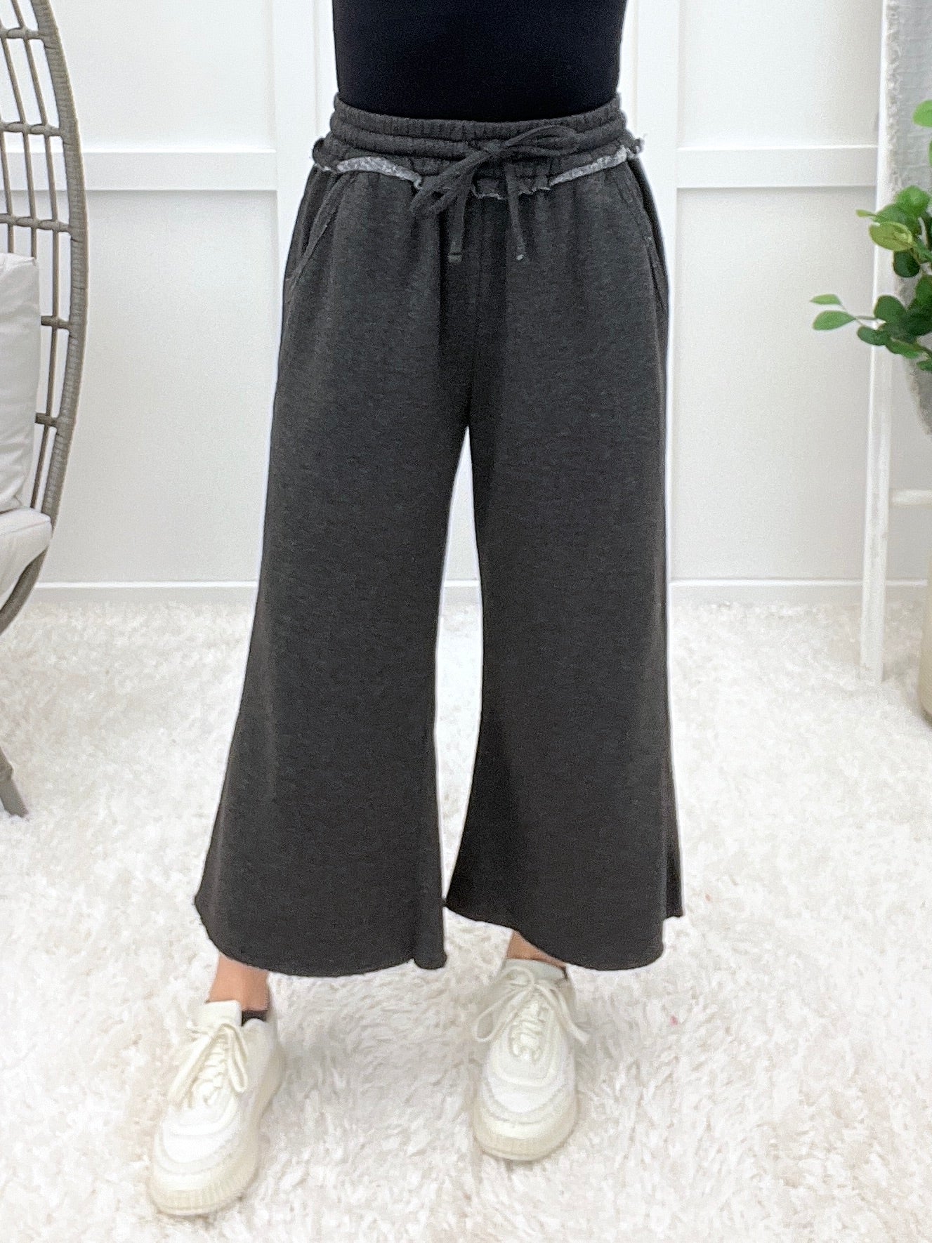 These fleece palazzo sweatpants feature a relaxed wide-leg silhouette with a comfortable drawstring waistband for easy all-day wear. Designed with pockets and a raw hem, they blend laid-back comfort with effortless style. Pair them with a casual tee and slides for lounging, travel days, or casual errands.