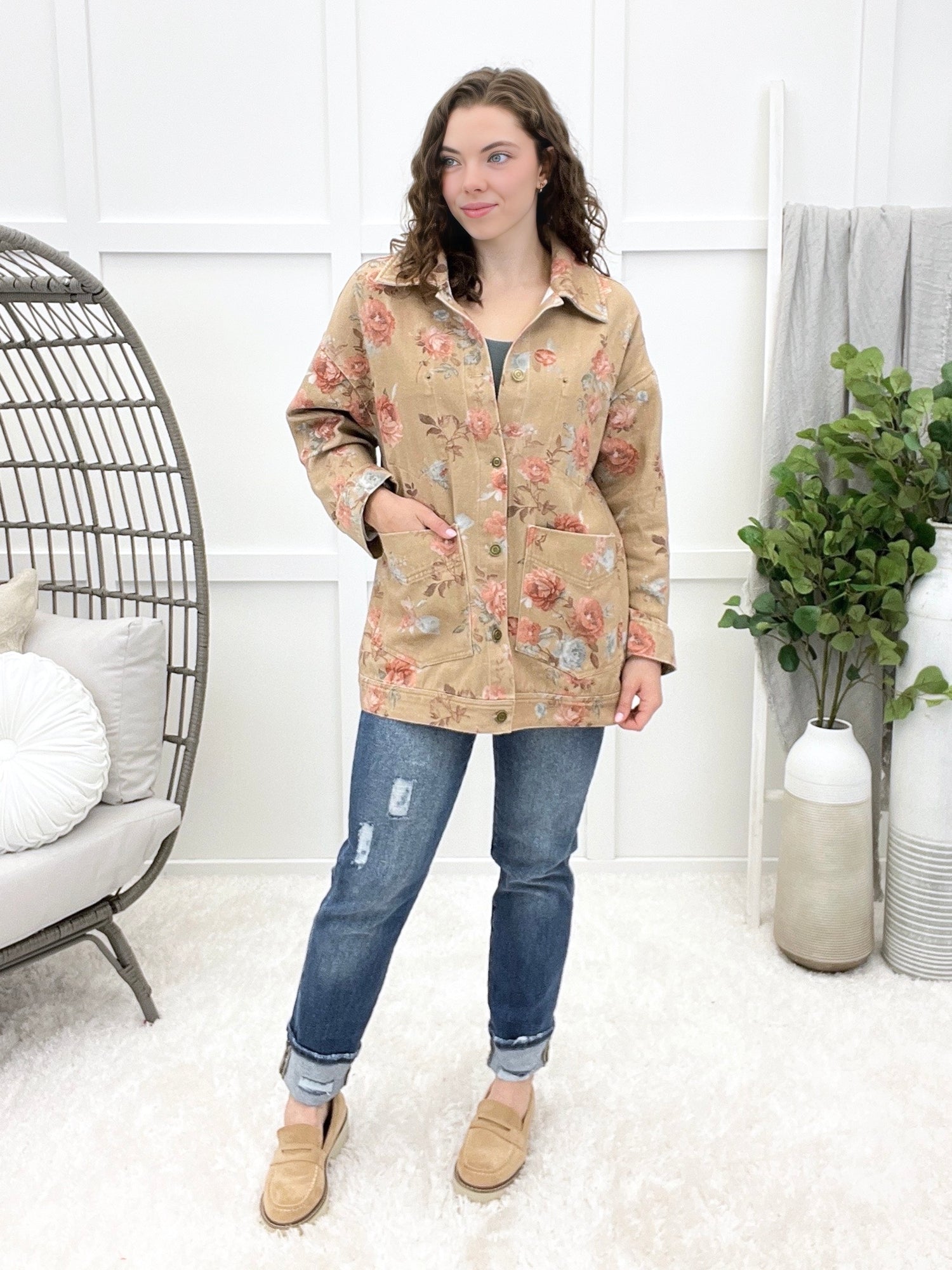 Step out in style with this stunning floral shacket! Perfect layering piece for crisp autumn days. Whether you're heading to a casual brunch or an evening stroll, this shacket adds a touch of effortless romance to any outfit.