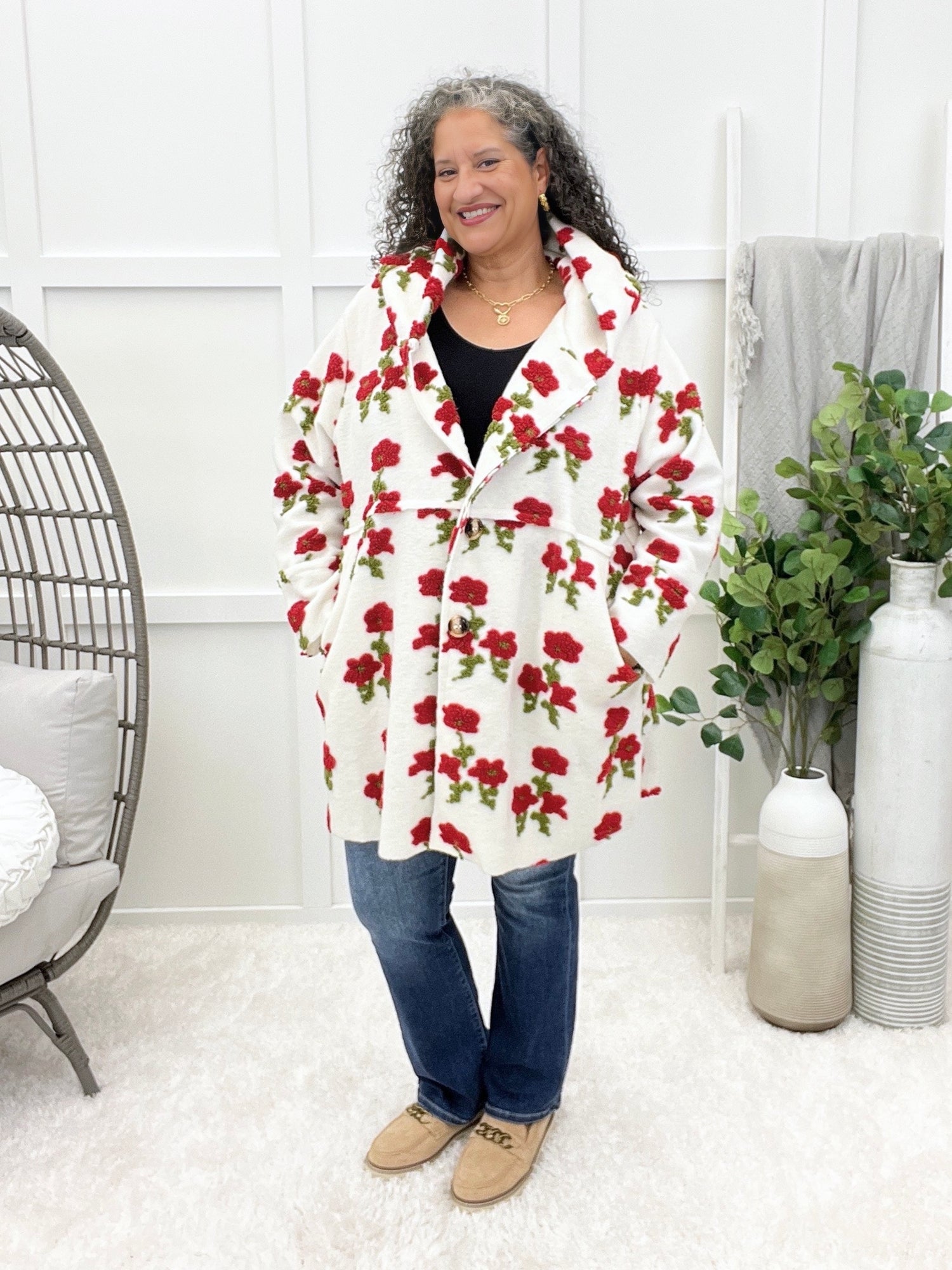 Cozy meets statement style in this chunky embroidered hooded coat with side pockets. Detailed with garden floral embroidery and a button-front design, it blends warmth with a touch of whimsy. Perfect for layering over everyday looks when you want comfort and standout charm.
