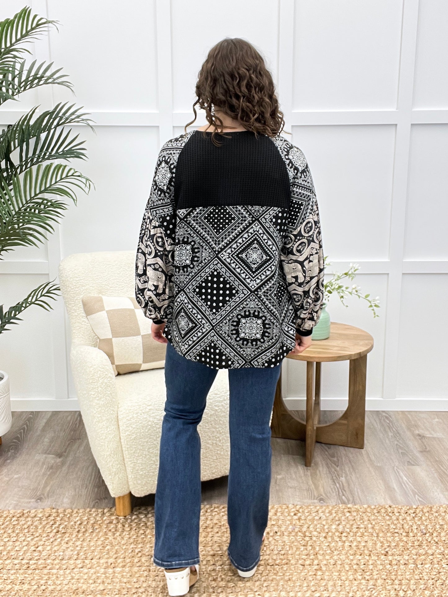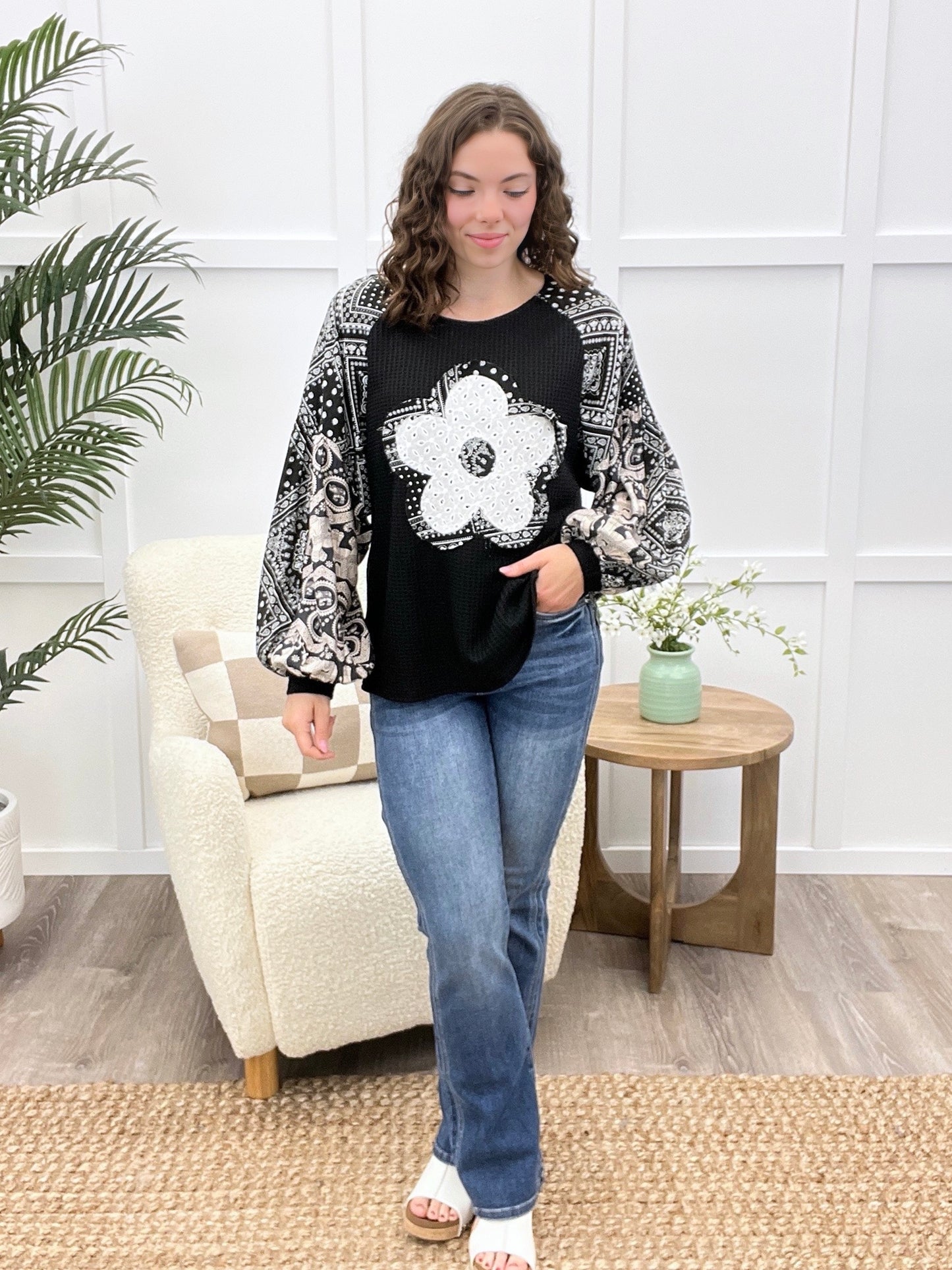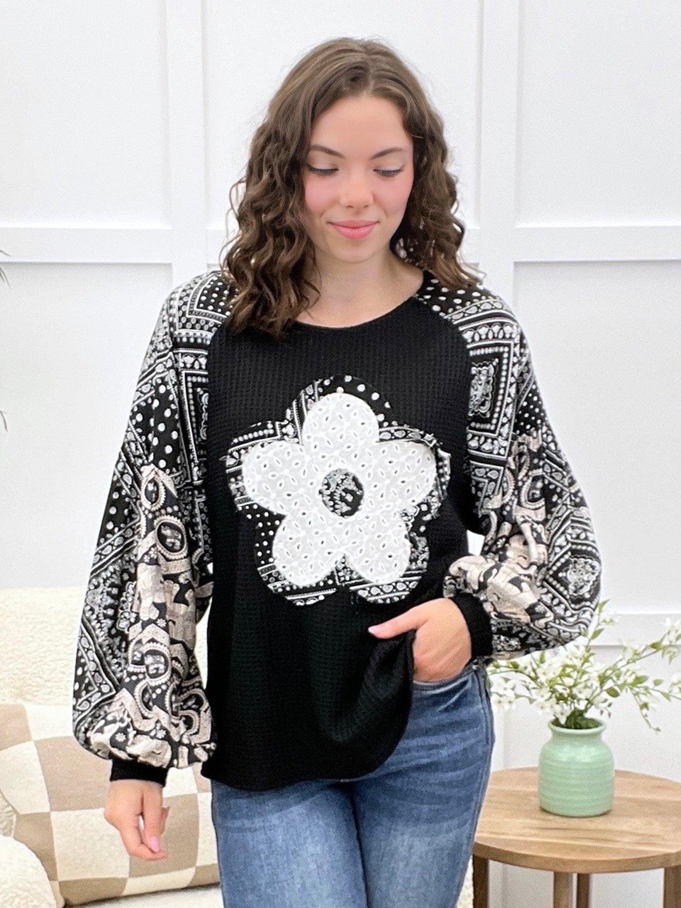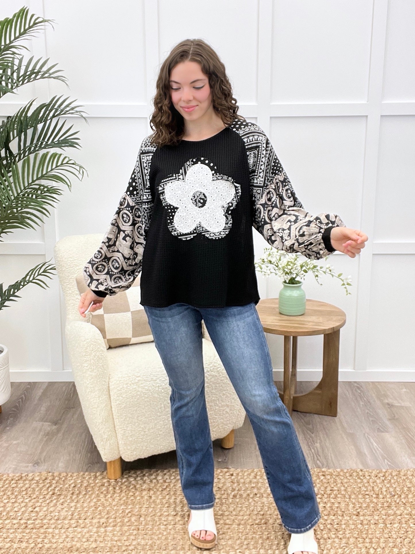 This playful and cozy pullover top features a bold floral patchwork detail and eye-catching mix-matched printed balloon long sleeves for a fun, eclectic vibe. Its relaxed fit and waffle knit fabric make it perfect for pairing with high-waisted jeans, denim skirts, or cargo pants. Layer it with a few dainty necklaces and ankle boots for an effortlessly boho-chic look.