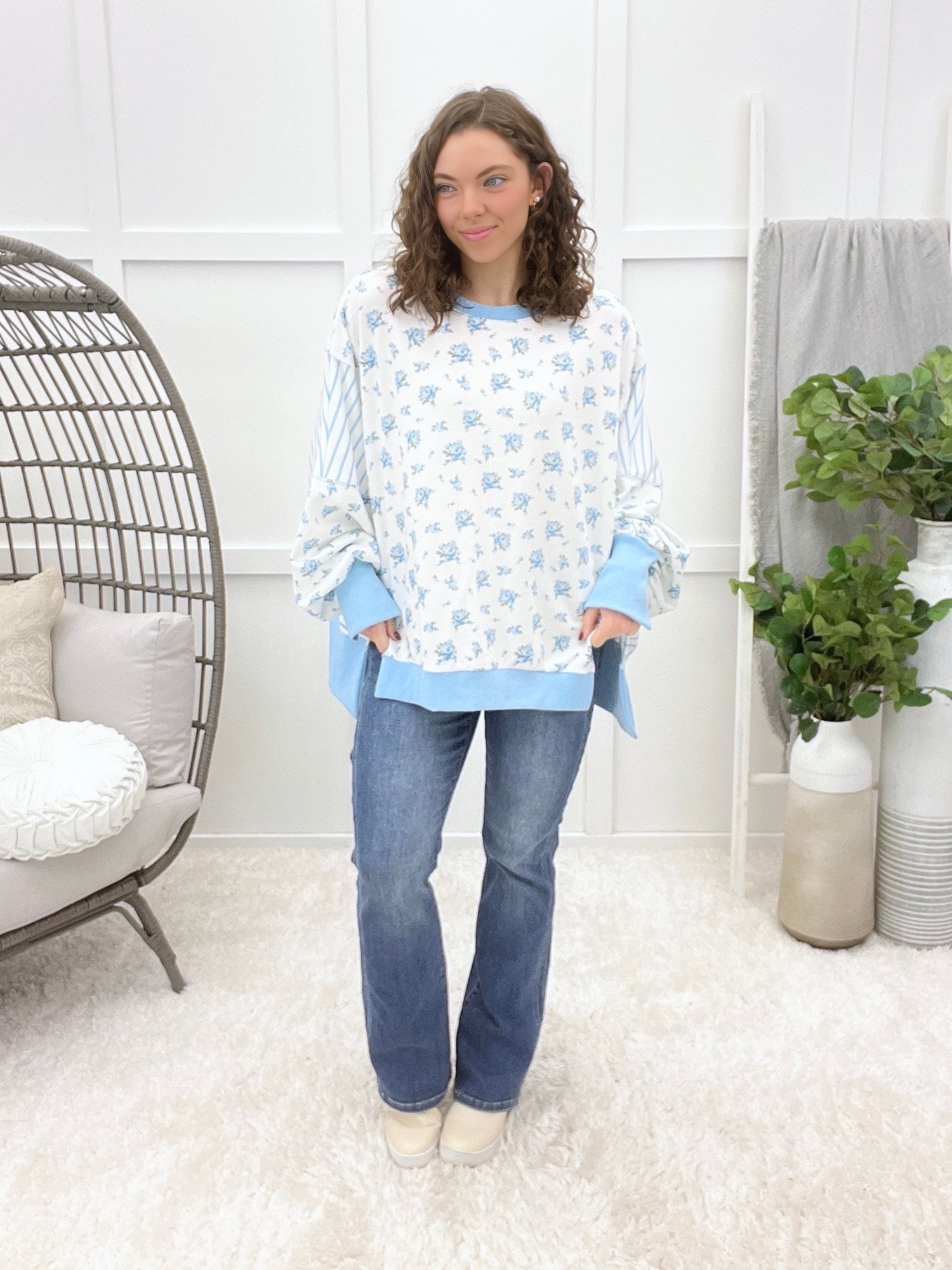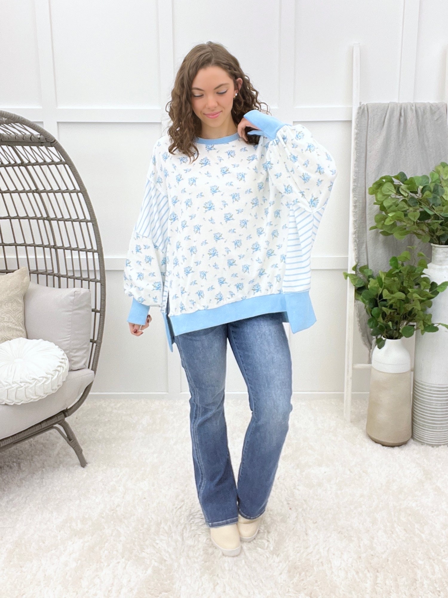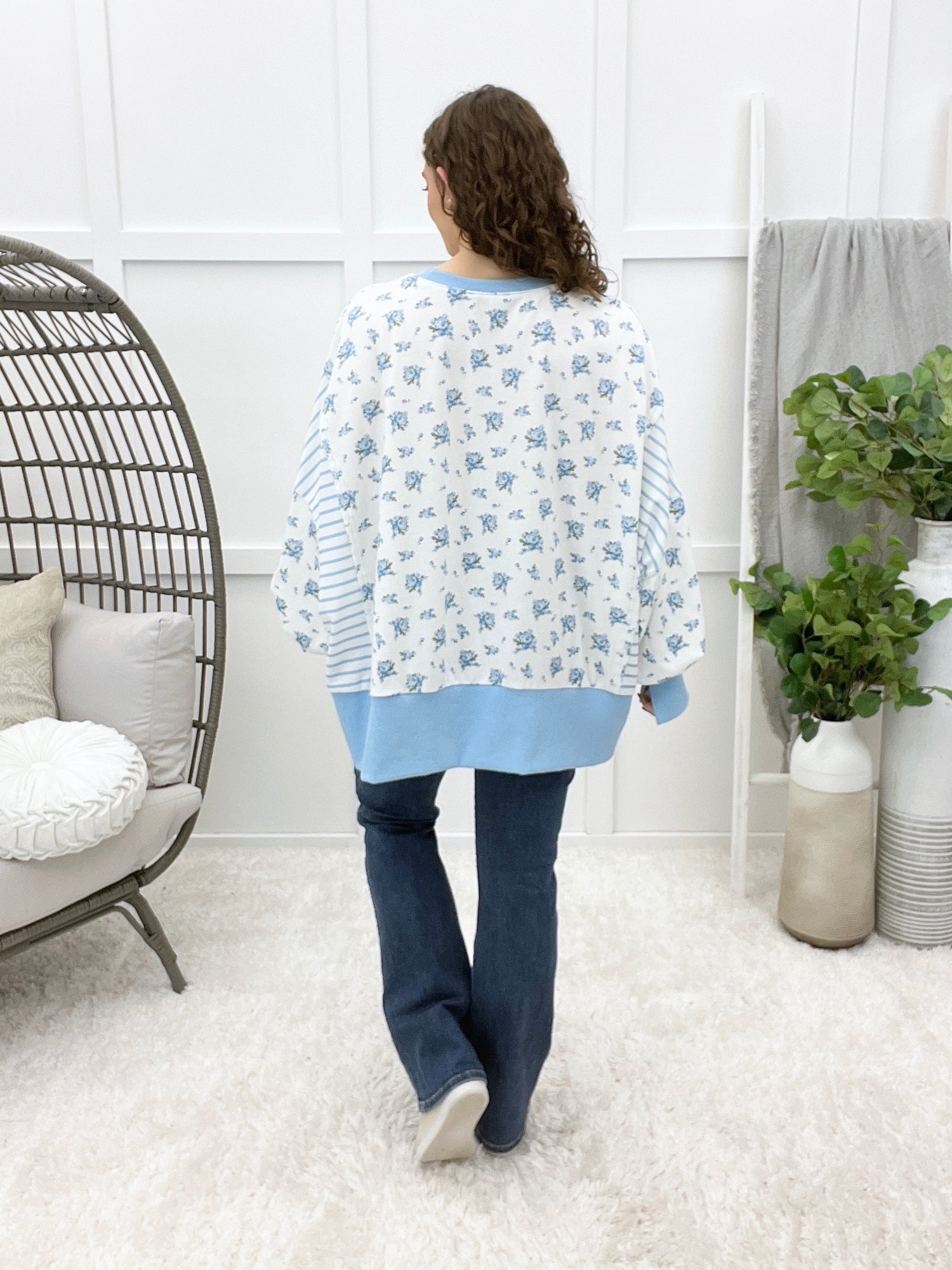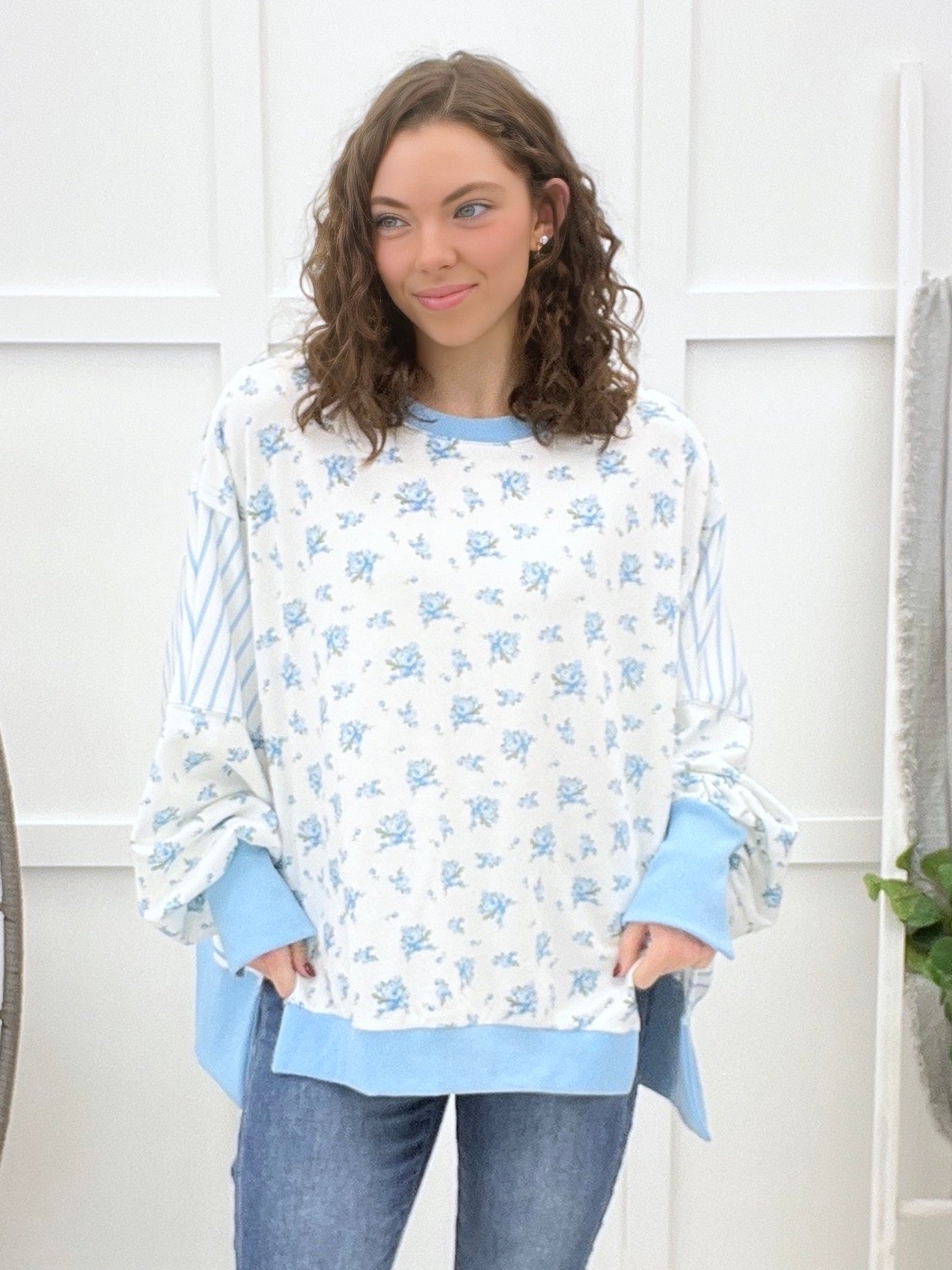 This oversized top is the perfect fusion of cozy comfort and feminine charm, mixing sweet floral prints with classic stripes for an unexpectedly delightful aesthetic. Crafted from soft French terry, this pullover features contrasting trim for a playful, layered look that feels instantly stylish and relaxed. Style this dreamy piece with distressed light-wash denim for a lovely weekend brunch with friends.