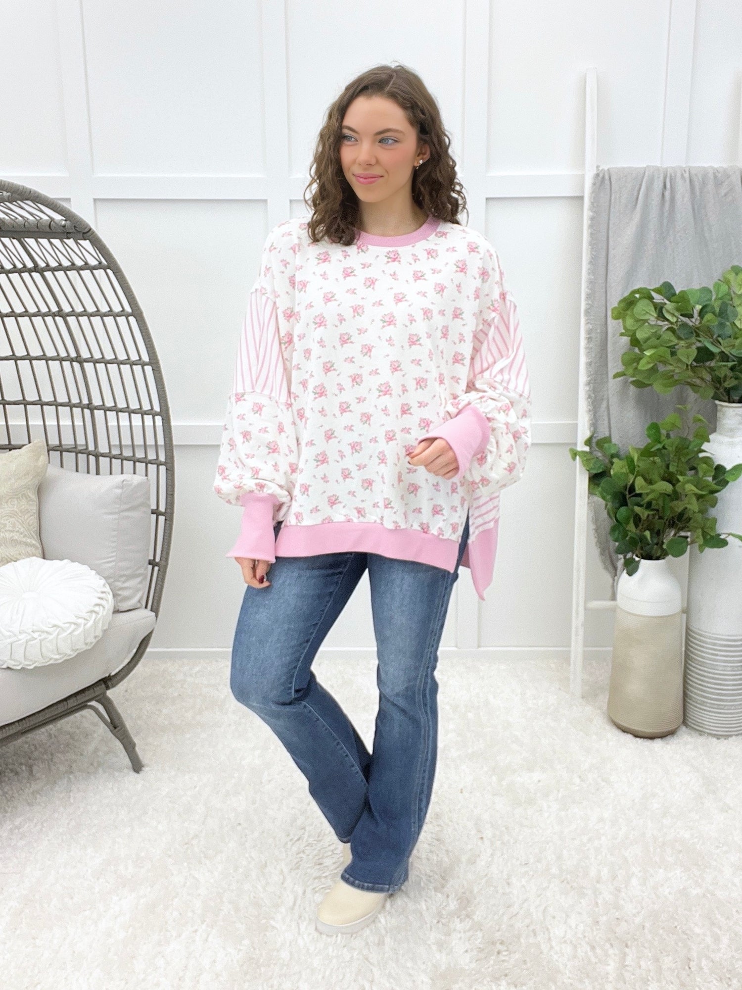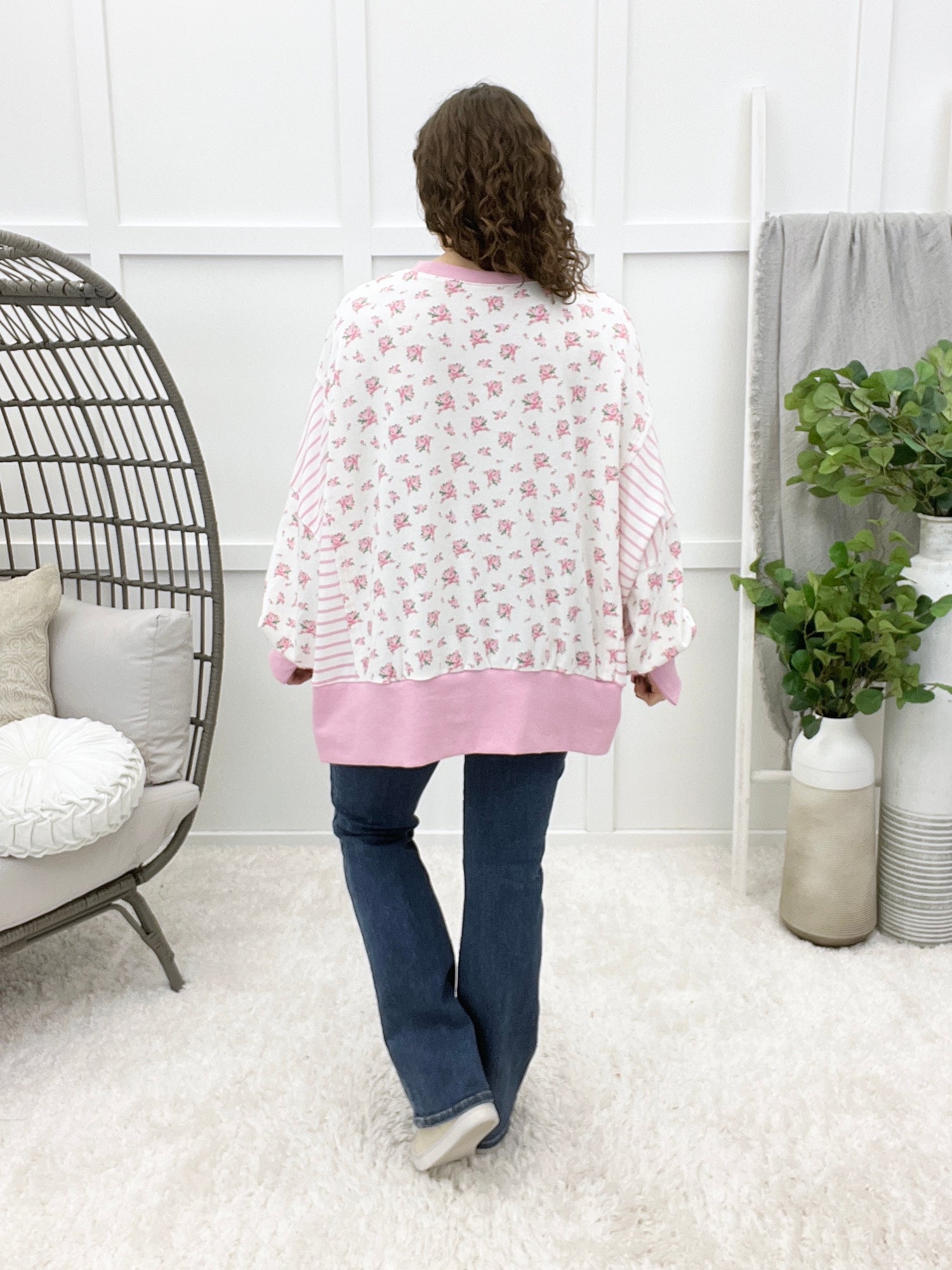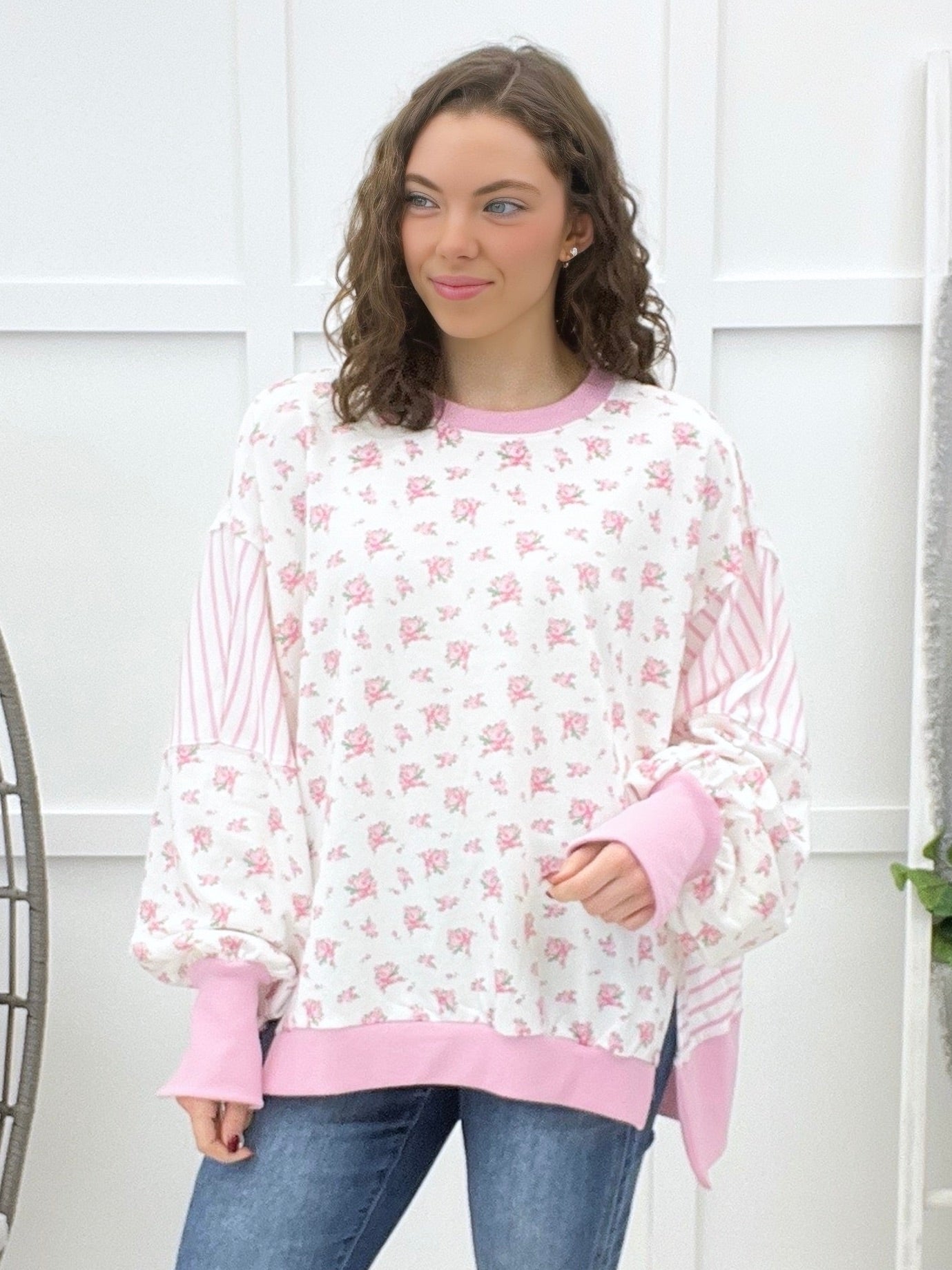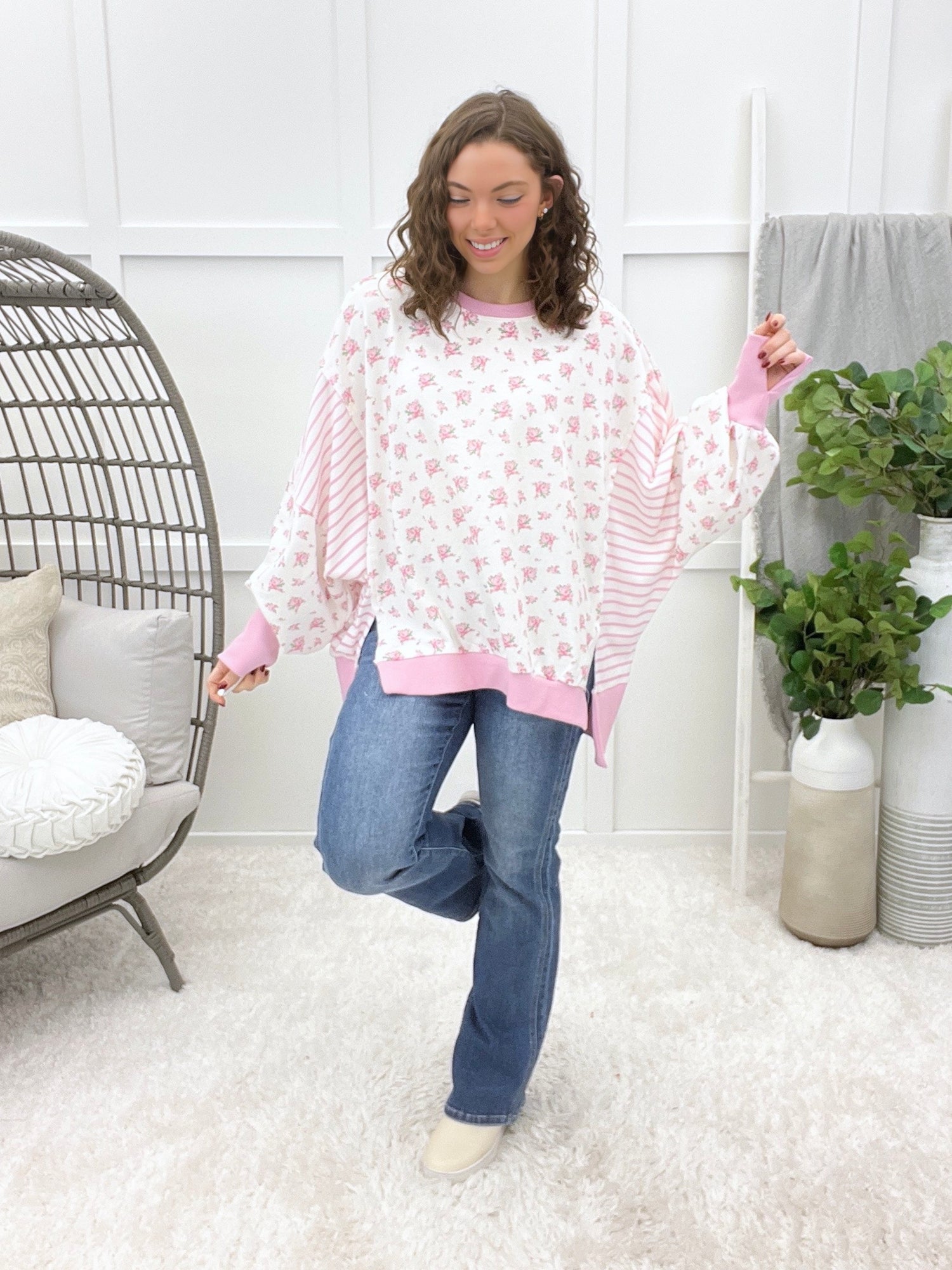 This oversized top is the perfect fusion of cozy comfort and feminine charm, mixing sweet floral prints with classic stripes for an unexpectedly delightful aesthetic. Crafted from soft French terry, this pullover features contrasting trim for a playful, layered look that feels instantly stylish and relaxed. Style this dreamy piece with distressed light-wash denim for a lovely weekend brunch with friends.
