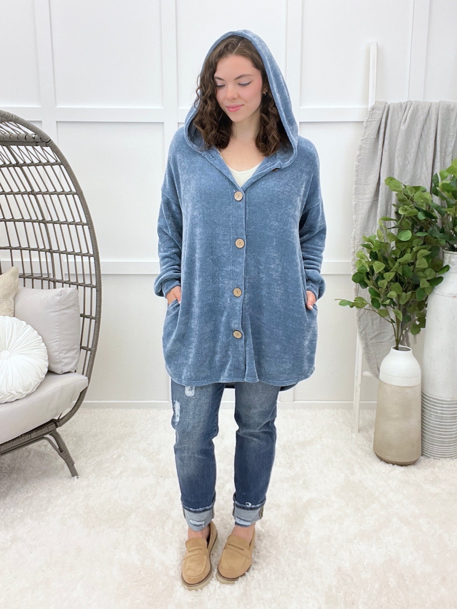 Wrap yourself in effortless comfort with this oversized hooded button-up cardigan, featuring a soft ribbed texture, side pockets and laid-back charm. Style it with leggings or distressed skinnies for lounging at home, weekend markets, or casual coffee dates.