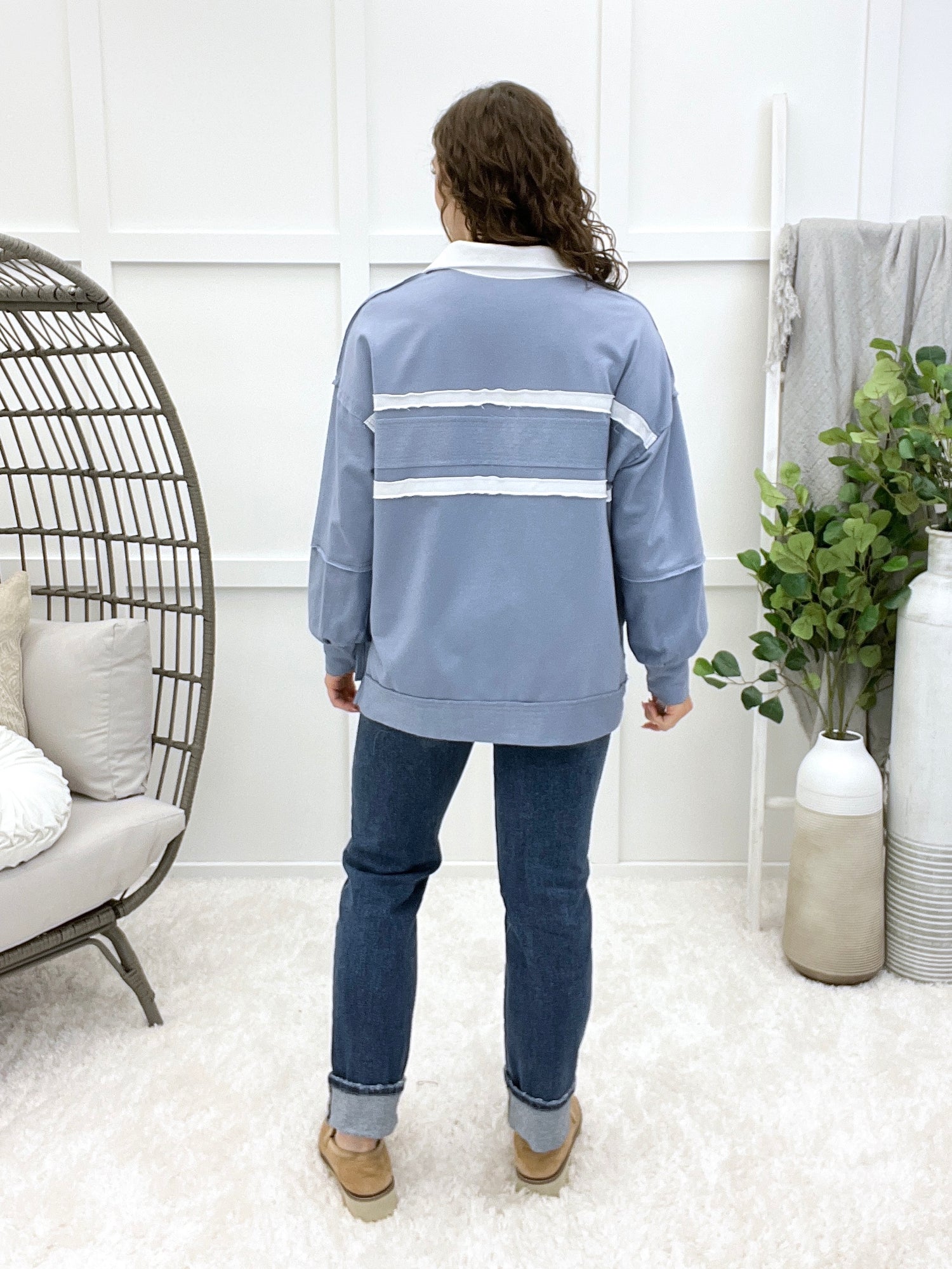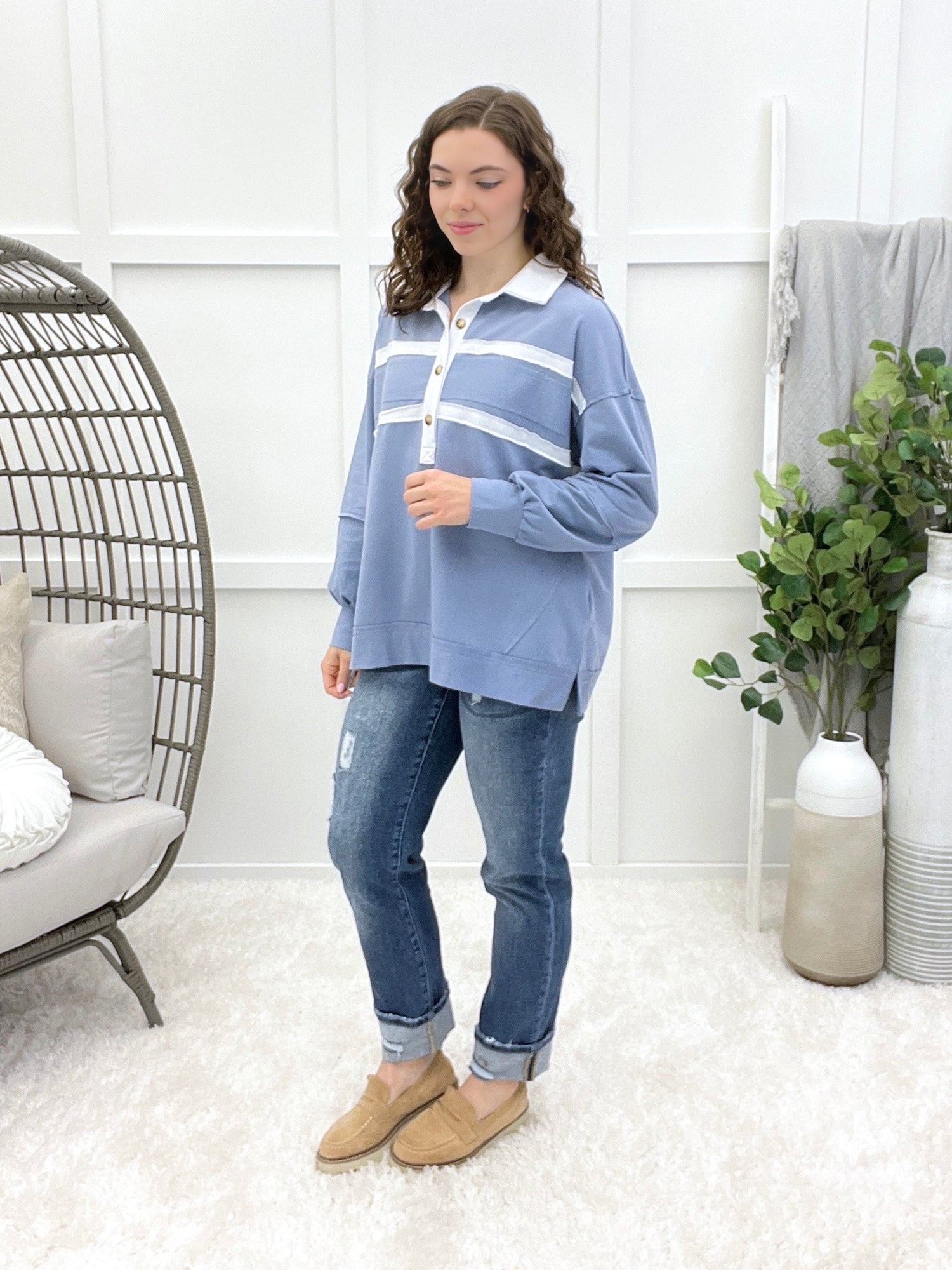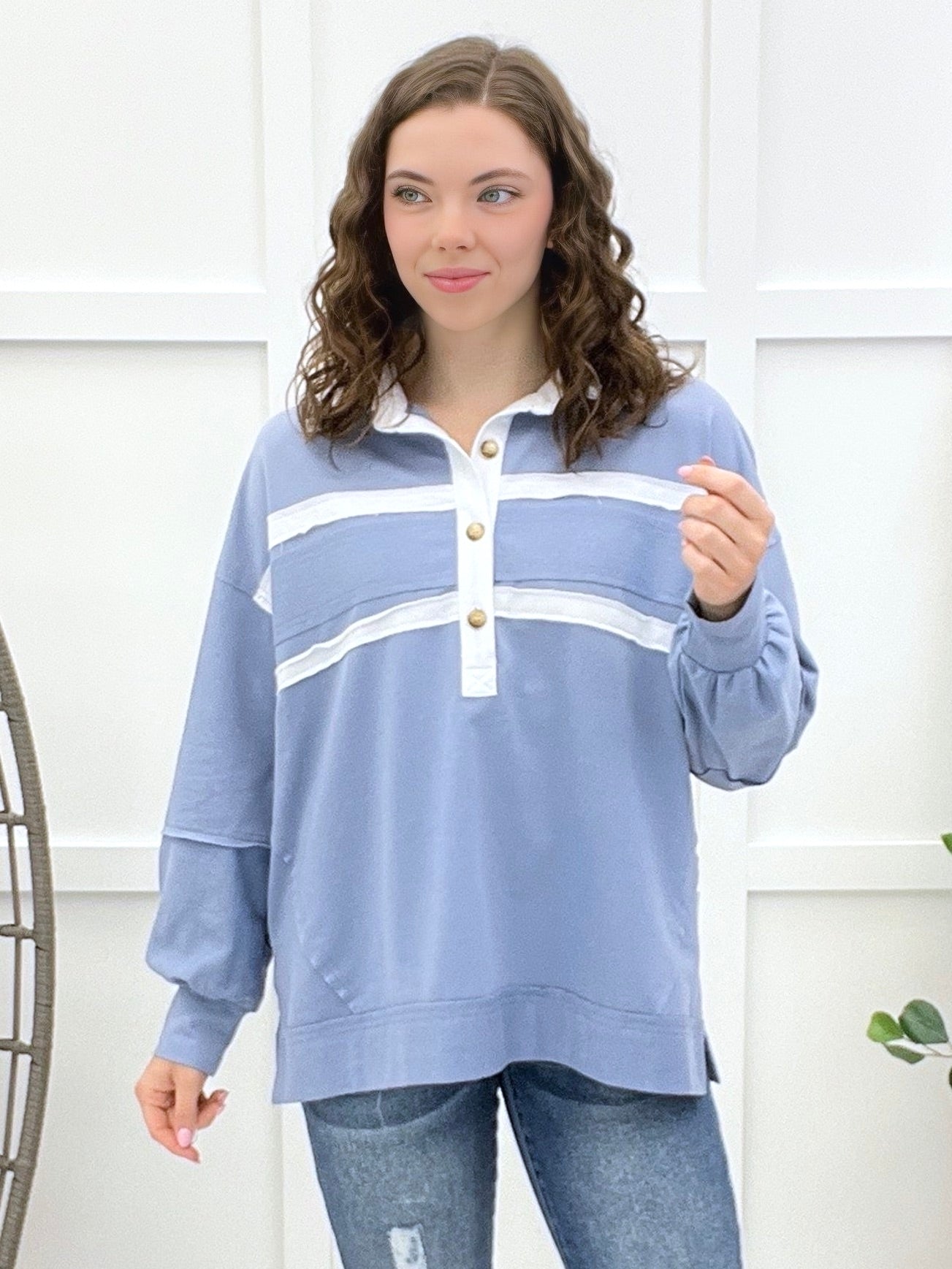 Step up your athleisure game with this retro-inspired, oversized rugby-style top. The stylish collared button design and bold color-block striping give it a chic, sporty vibe. Pair this cozy piece with your favorite distressed denim and sneakers for a stylish weekend day out, or wear it over leggings for a comfortable commute.