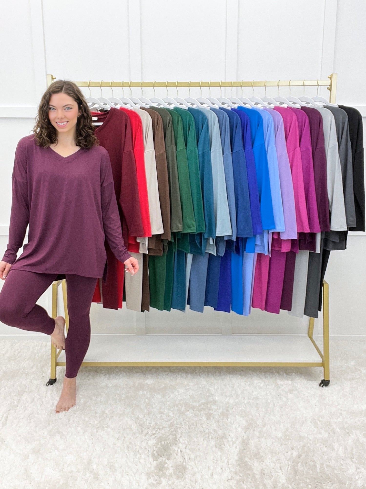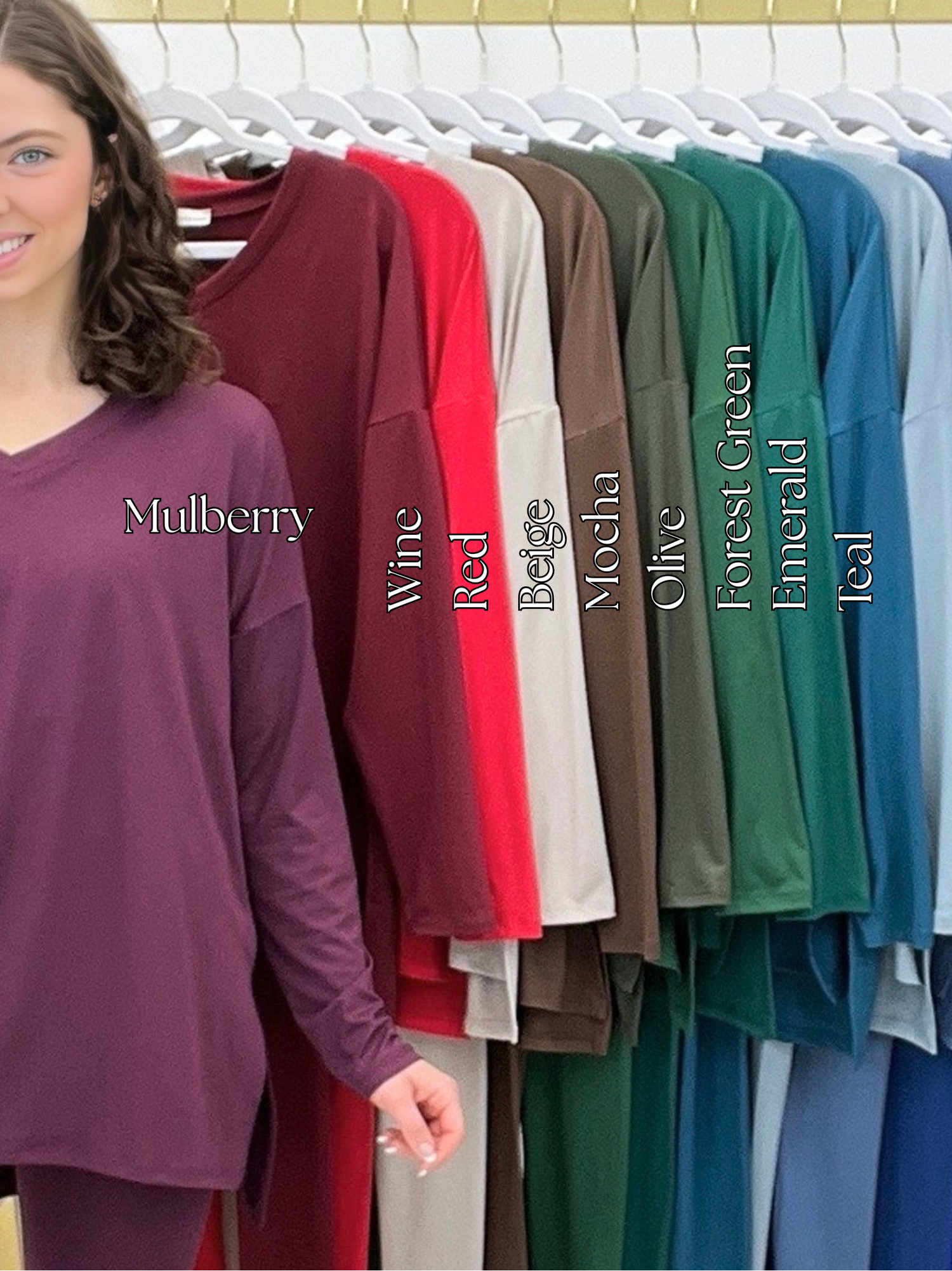 The relaxed long-sleeve V-neck top features side slits for effortless movement, while the matching leggings hug gently with a second-skin feel — perfect for lounging, travel, or casual outings.