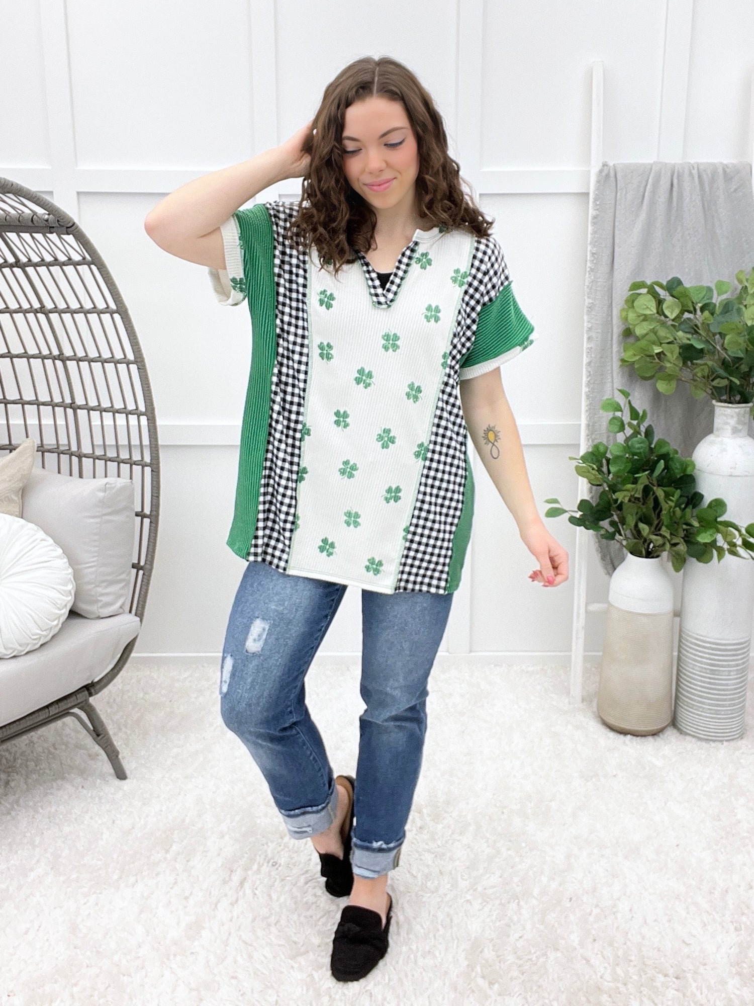 A playful mix of prints brings fresh personality to this relaxed knit top! It features a clover front panel and gingham contrast sides for a stylish, trendy look. The notched neckline and color block short sleeves create an easy, everyday silhouette with subtle detail.