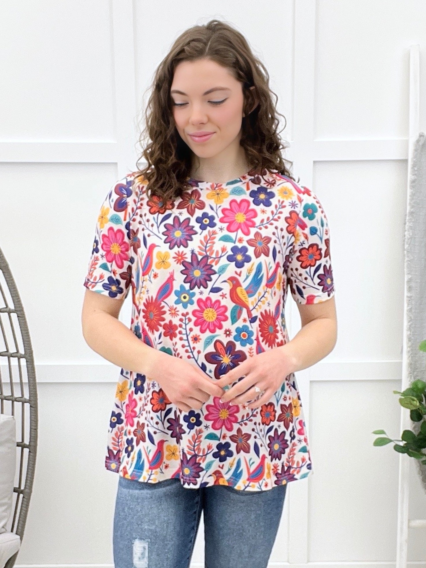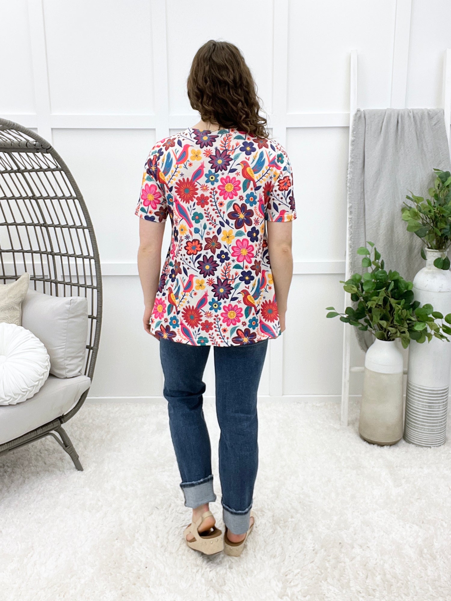 This is the kind of top that instantly lifts your mood the second you slip it on. The lively print and easy short-sleeve silhouette keep it playful and flattering, while the soft, stretchy, breathable fabric makes it comfortable enough for all-day wear. It’s the top you reach for when you want something fun, effortless, and totally feel-good and yes, it’s machine washable too.