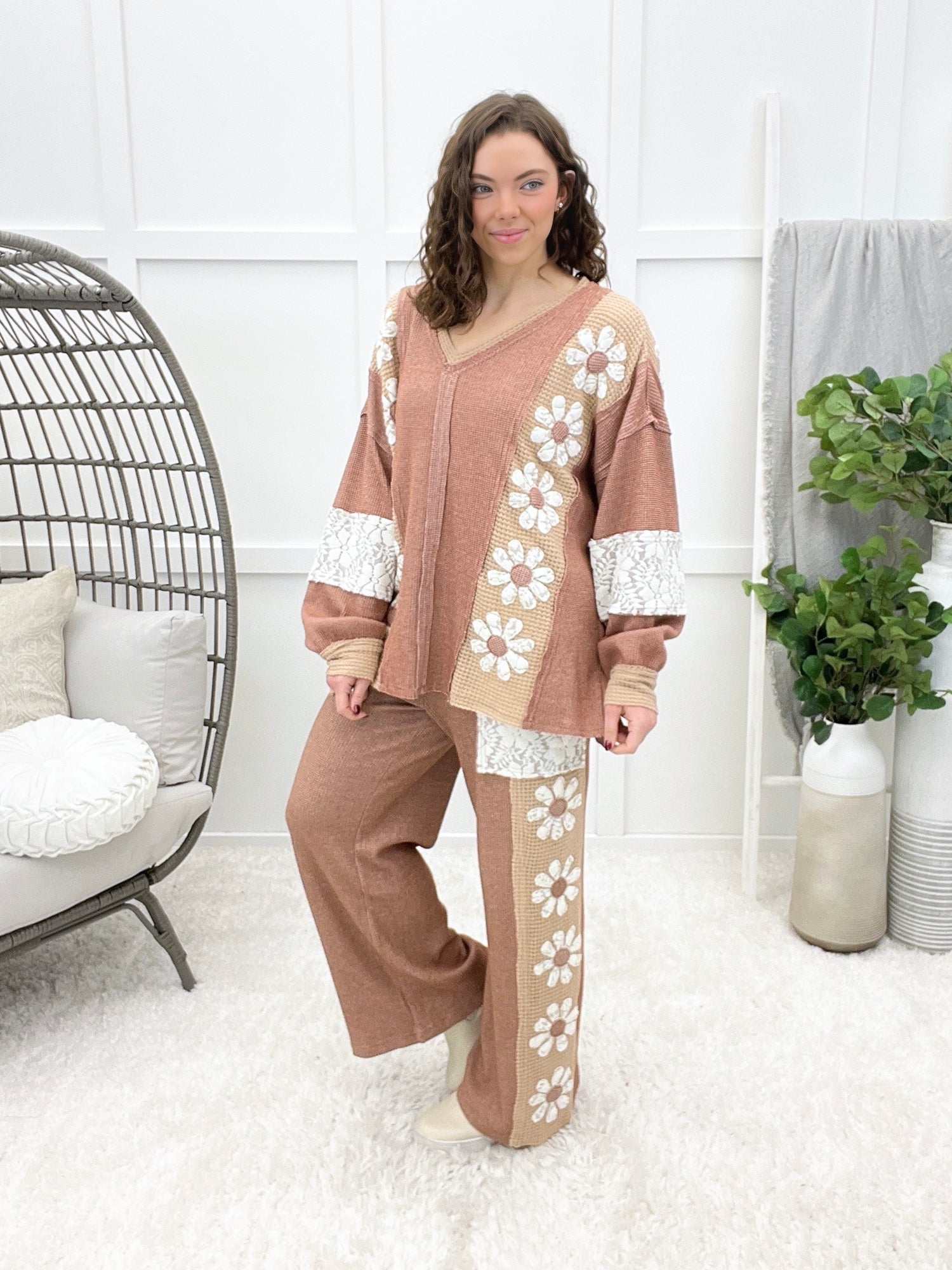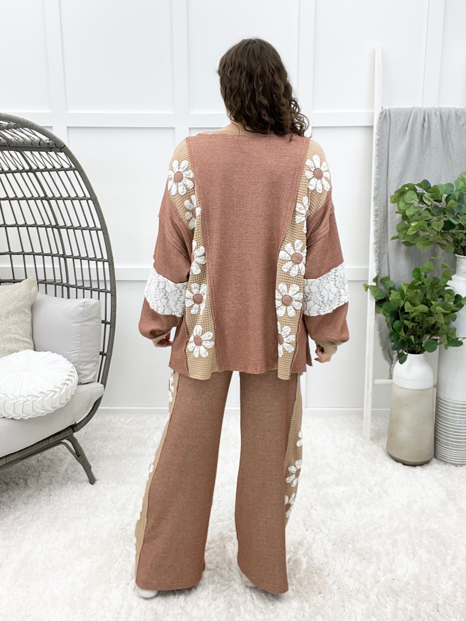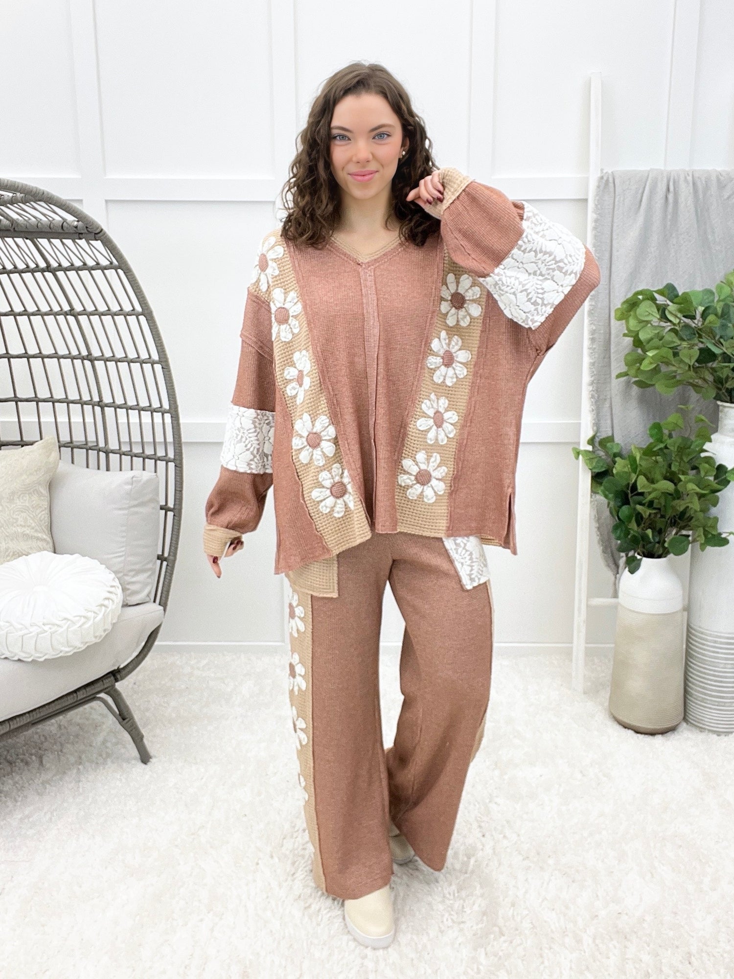 Meet your new favorite duo! This textured knit top pairs perfectly with wide-leg sweatpants featuring soft, heavy-weight fabric and charming flower patches. The top's cozy comfort and artisan flair—complete with floral lace appliques and contrasting sleeve details—makes this set an instant wardrobe win for laid-back style with personality.