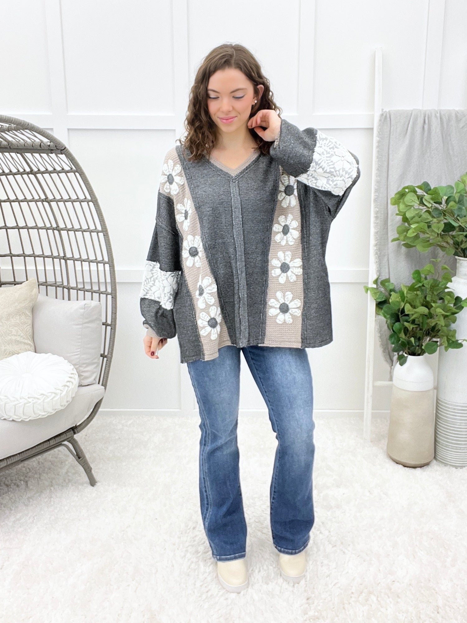 This charming textured knit top is a lovely blend of cozy comfort and artisan detail, featuring gorgeous floral lace applique panels and contrasting flower motifs along the sleeves. The relaxed, boutique-worthy silhouette layers beautifully and offers an elevated, wearable piece that truly stands out. Pair this unique top with some slim-fit jeans and ankle boots for a stylish afternoon browsing an antique shop.