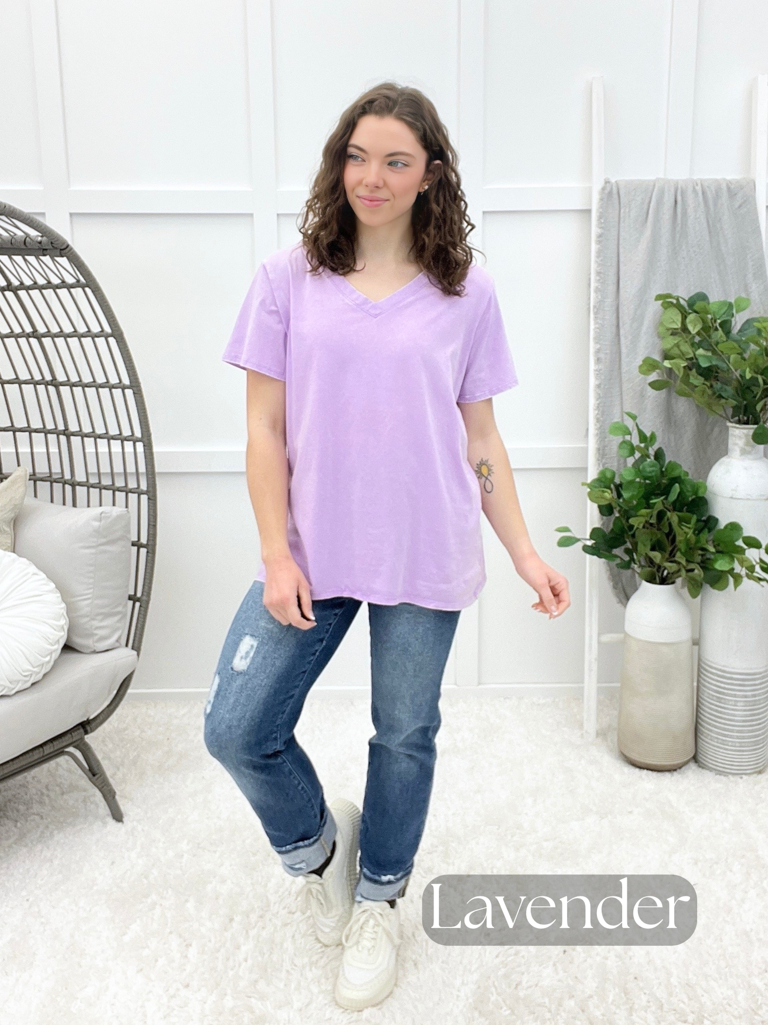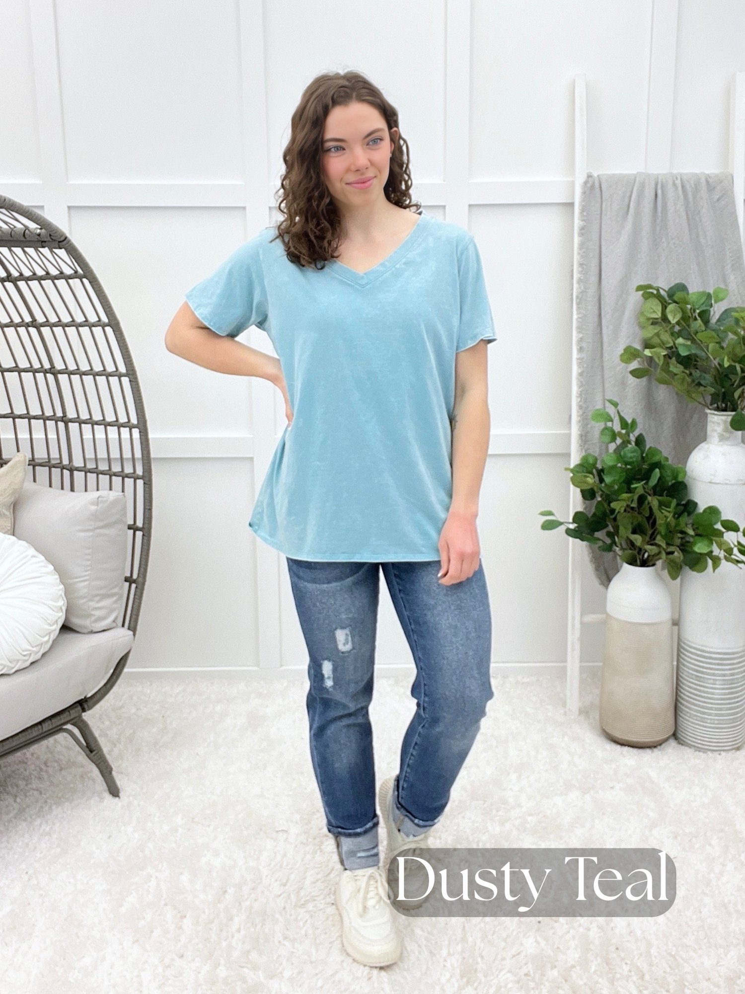 This washed V-neck tee is soft, slouchy, and effortlessly cool from the first wear. The easy short sleeves and relaxed vibe make it perfect for all-day comfort. Pair it with jeans, biker shorts, or a casual front tuck for everyday errands, travel days, or laid-back weekends.
