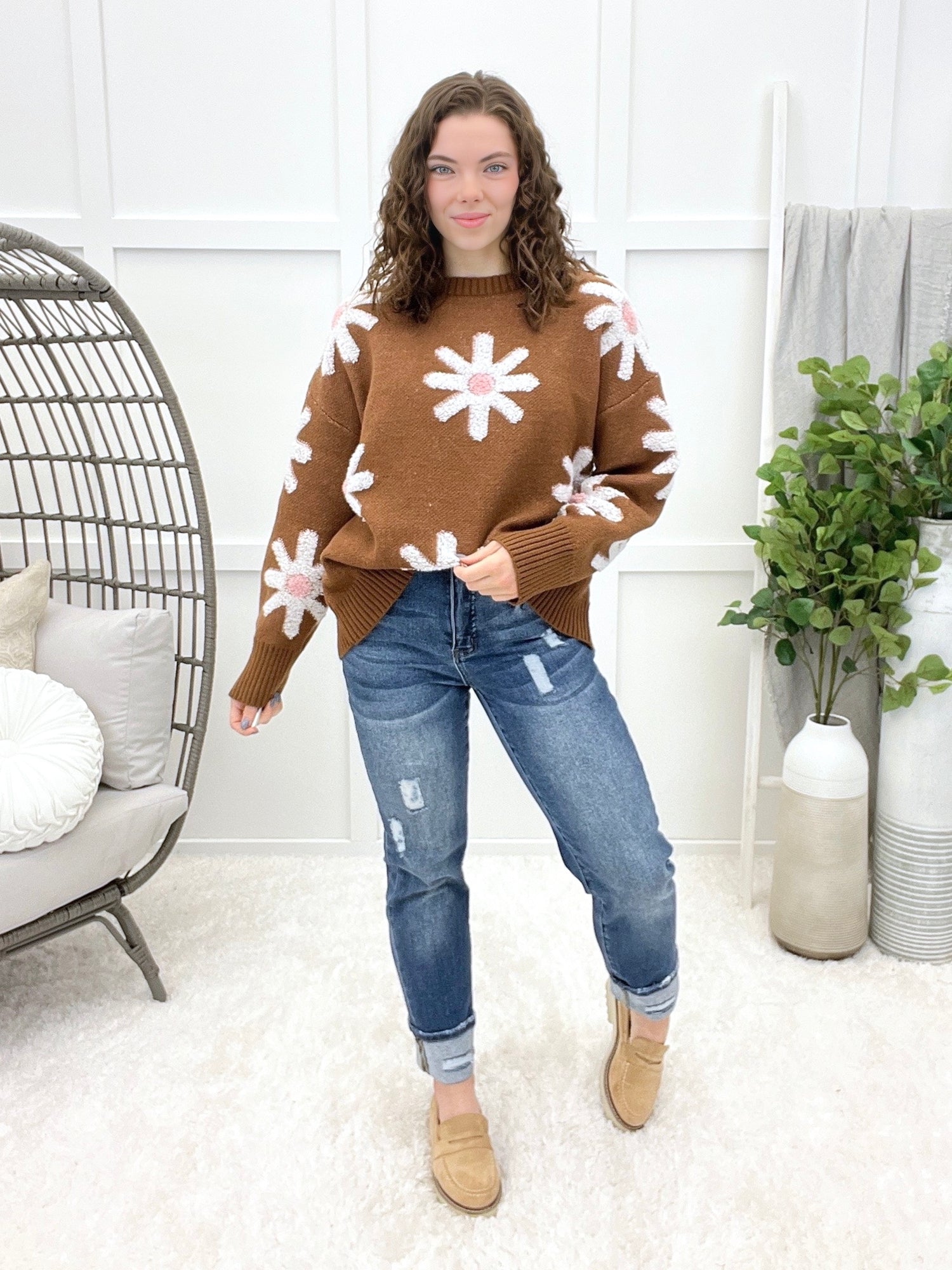 Bring some playful charm to your wardrobe with this cozy sweater featuring oversized daisy details that pop with texture and personality. The relaxed fit and soft knit make it perfect for layering or wearing on its own when the weather cools down. Designed with ribbed trim on the hem, neckline, and sleeves for a polished finish, this sweater blends comfort and fun style effortlessly.