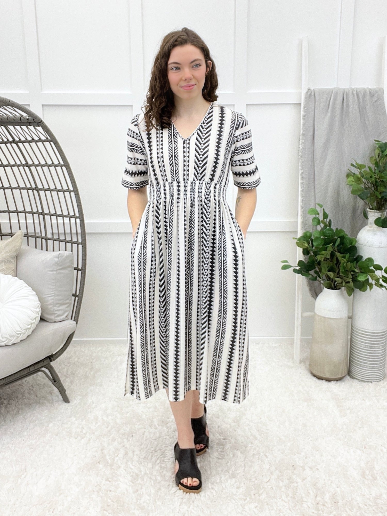 This dress is the kind of easygoing favorite you’ll reach for on repeat, featuring a playful geometric print, a flattering elastic waist, and a breezy side slit that adds just the right touch of movement. Designed with a classic v-neckline and short sleeves, it’s made from a soft, breathable, comfortable fabric that’s perfect for everyday wear, and it’s machine washable, so it’s as practical as it is cute.