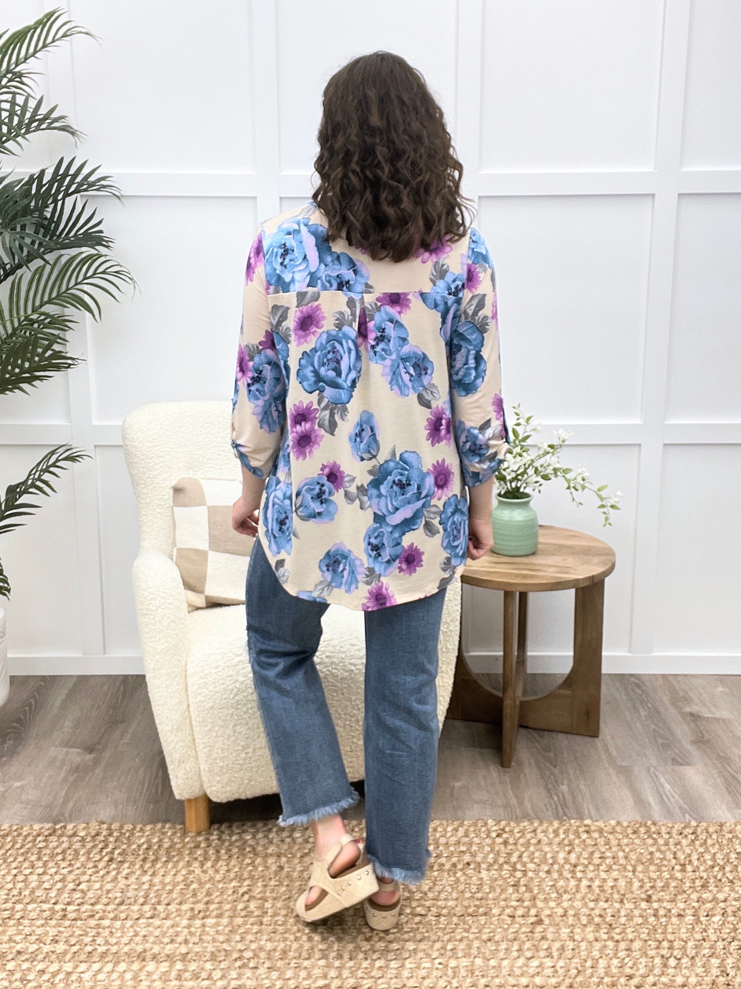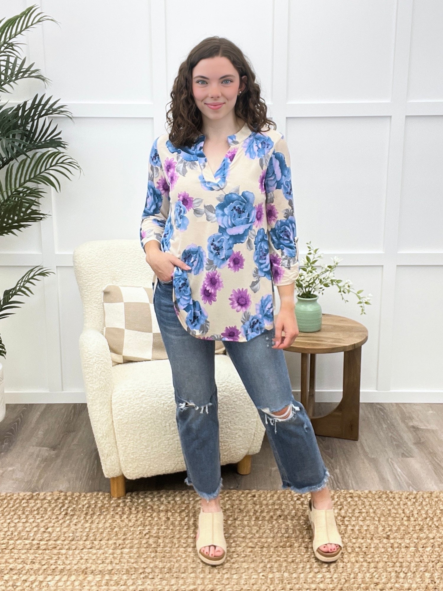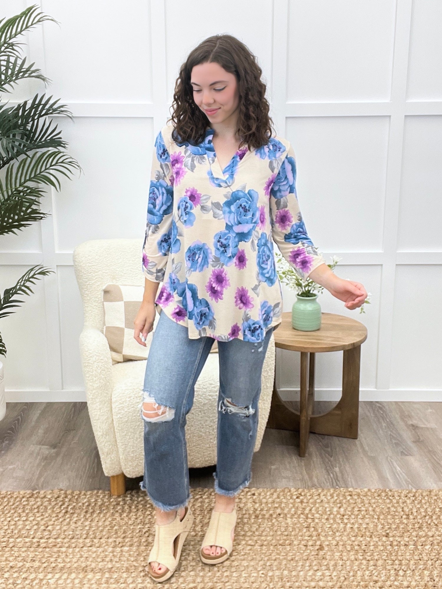 Oh my goodness, get ready to live in this top! Imagine the most luxurious cloud you've ever touched, now make it wrinkle-free and cooler than linen – seriously, this fabric is magic for everyday wear. Plus, it's got a chic mandarin collar, those perfect 3/4 length sleeves with cute tab details, and a relaxed, flowy fit that's slightly high-low for extra style points. You're going to adore it!