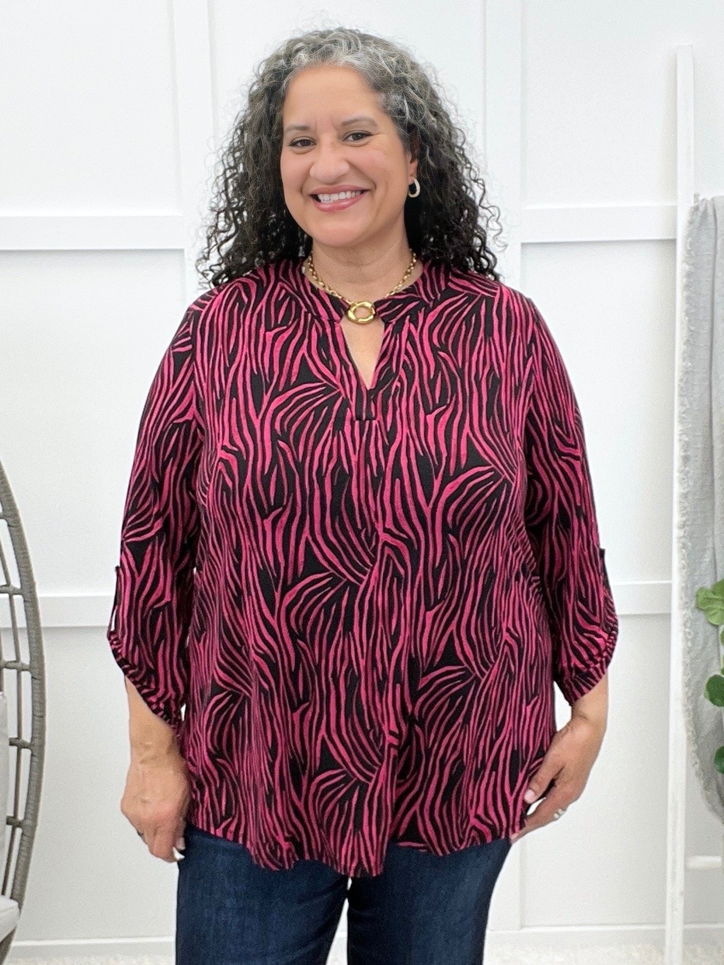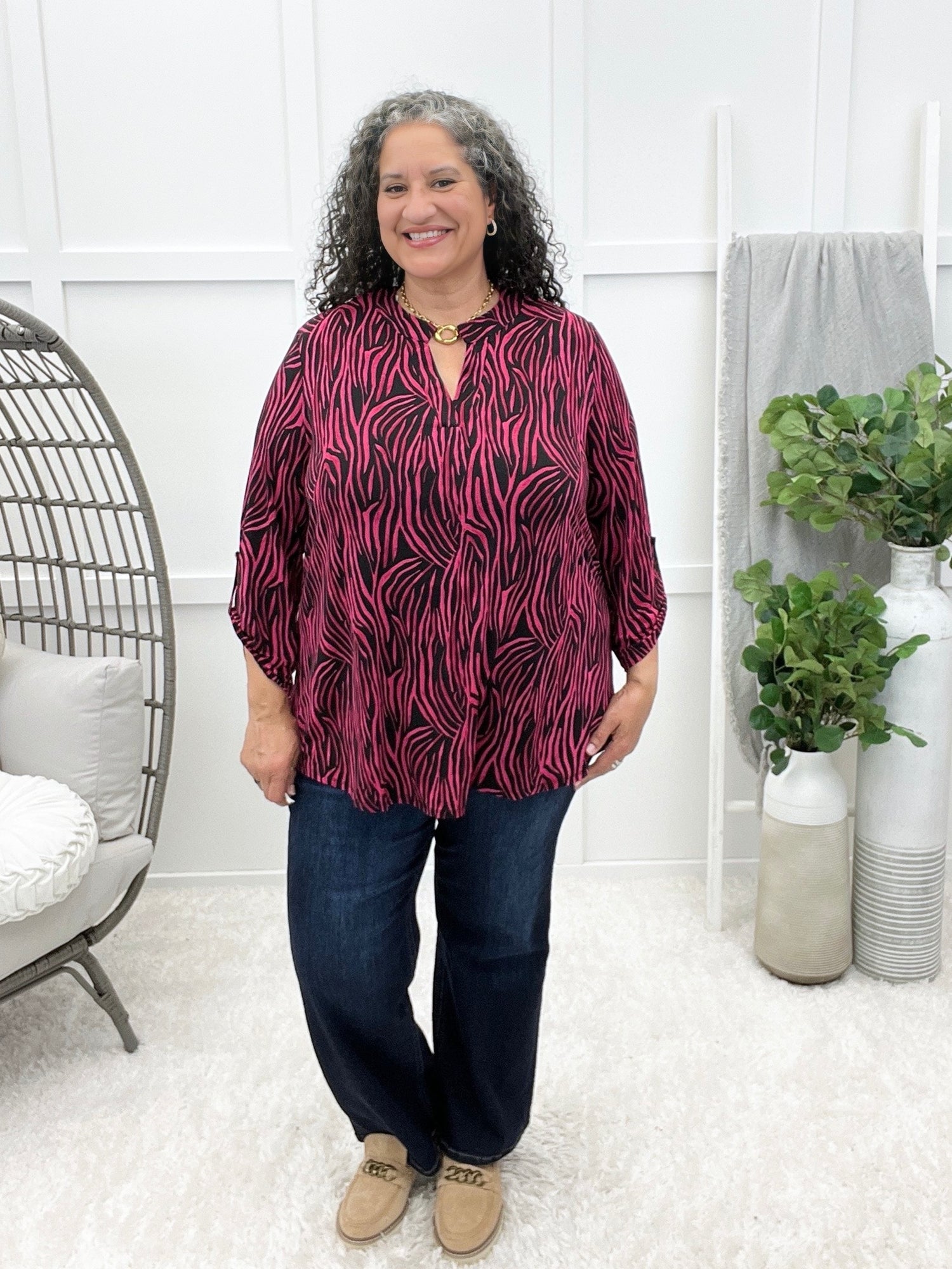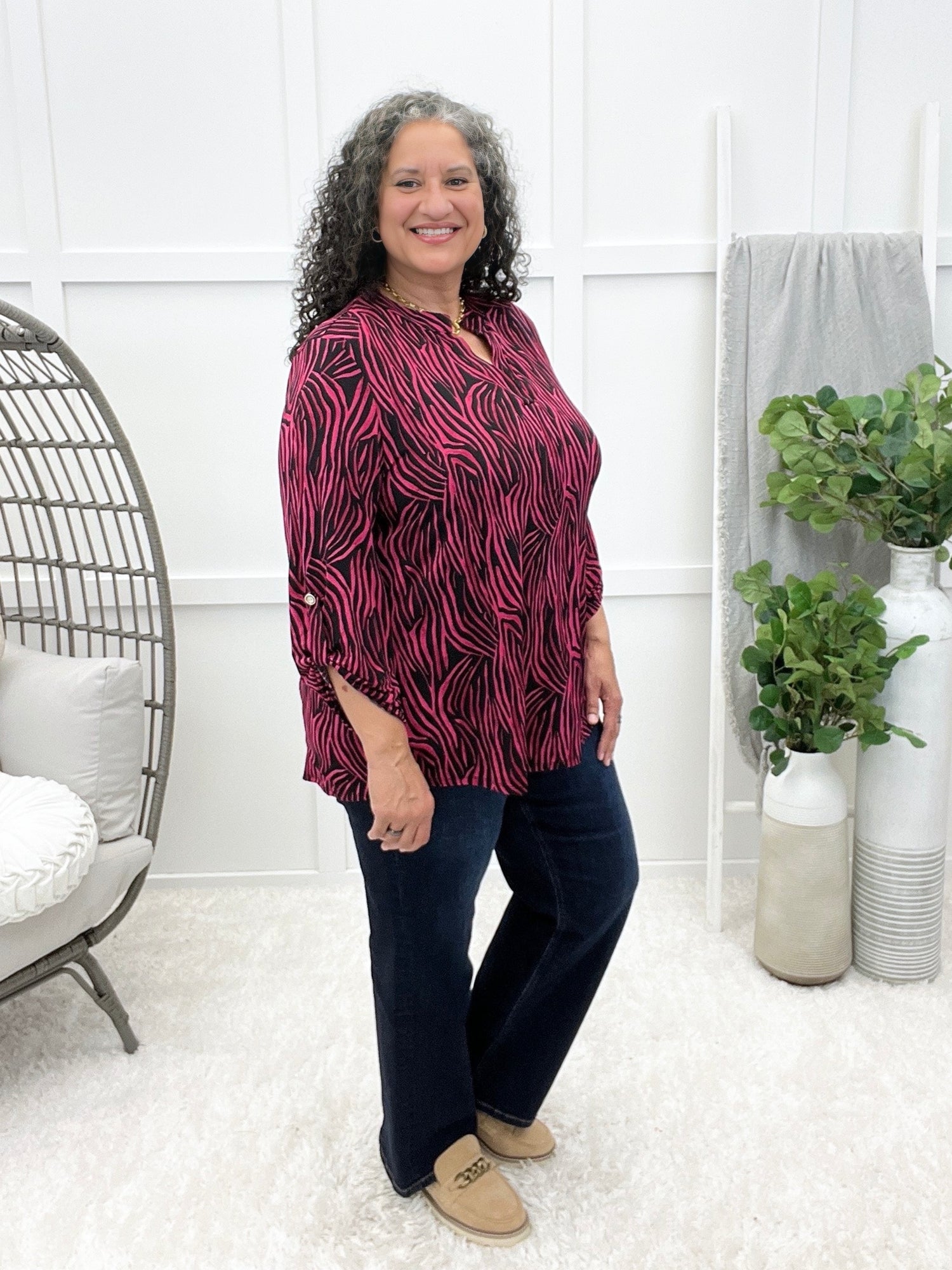 This wrinkle-free top is all about effortless charm with its crisp mandarin collar, subtle puffed sleeves, and delicate smocked cuffs. The long sleeves add a polished touch, while the relaxed fit keeps it comfy all day. Pair it with tailored pants for the office or denim for a dressed-up casual vibe!
