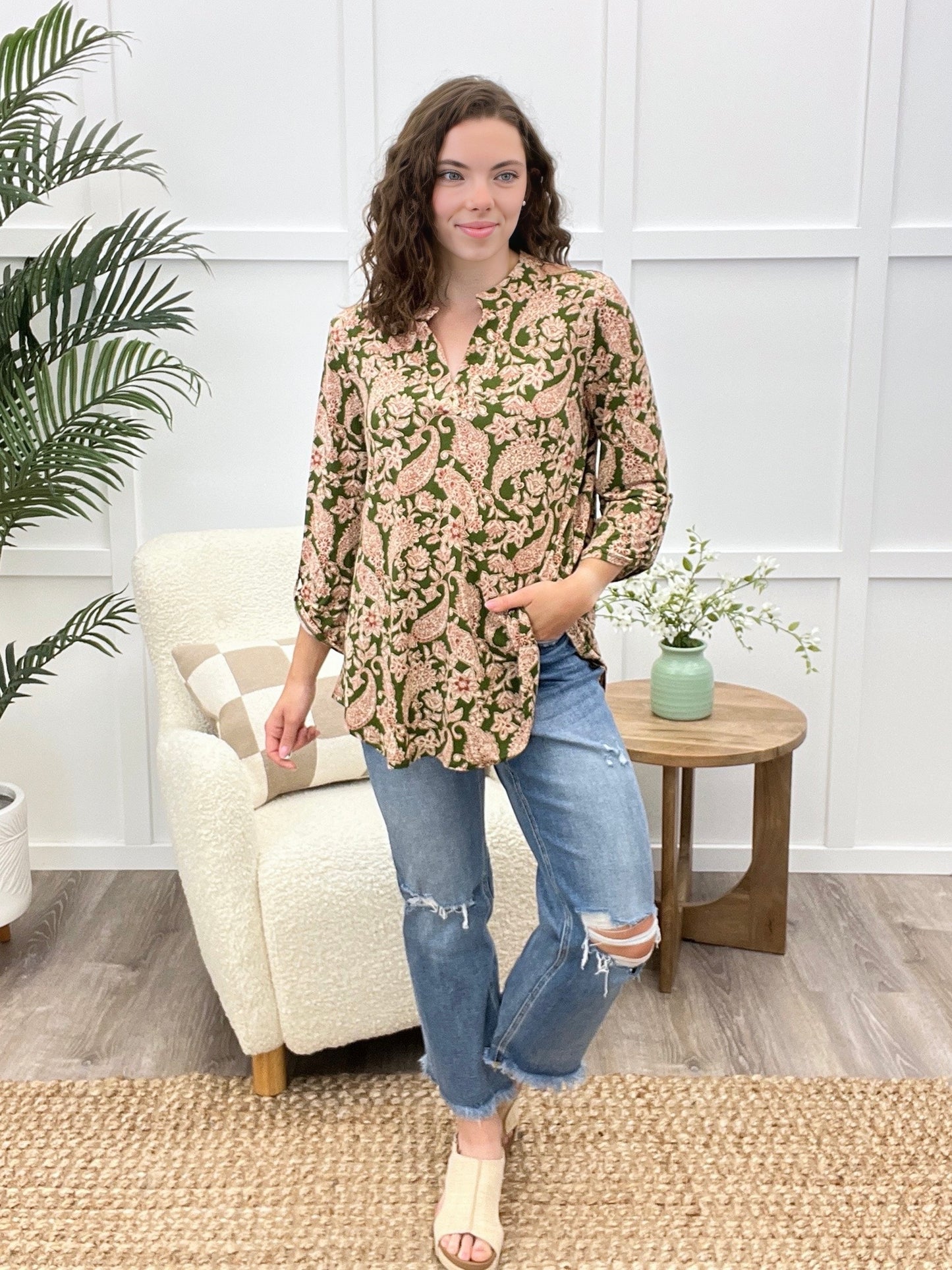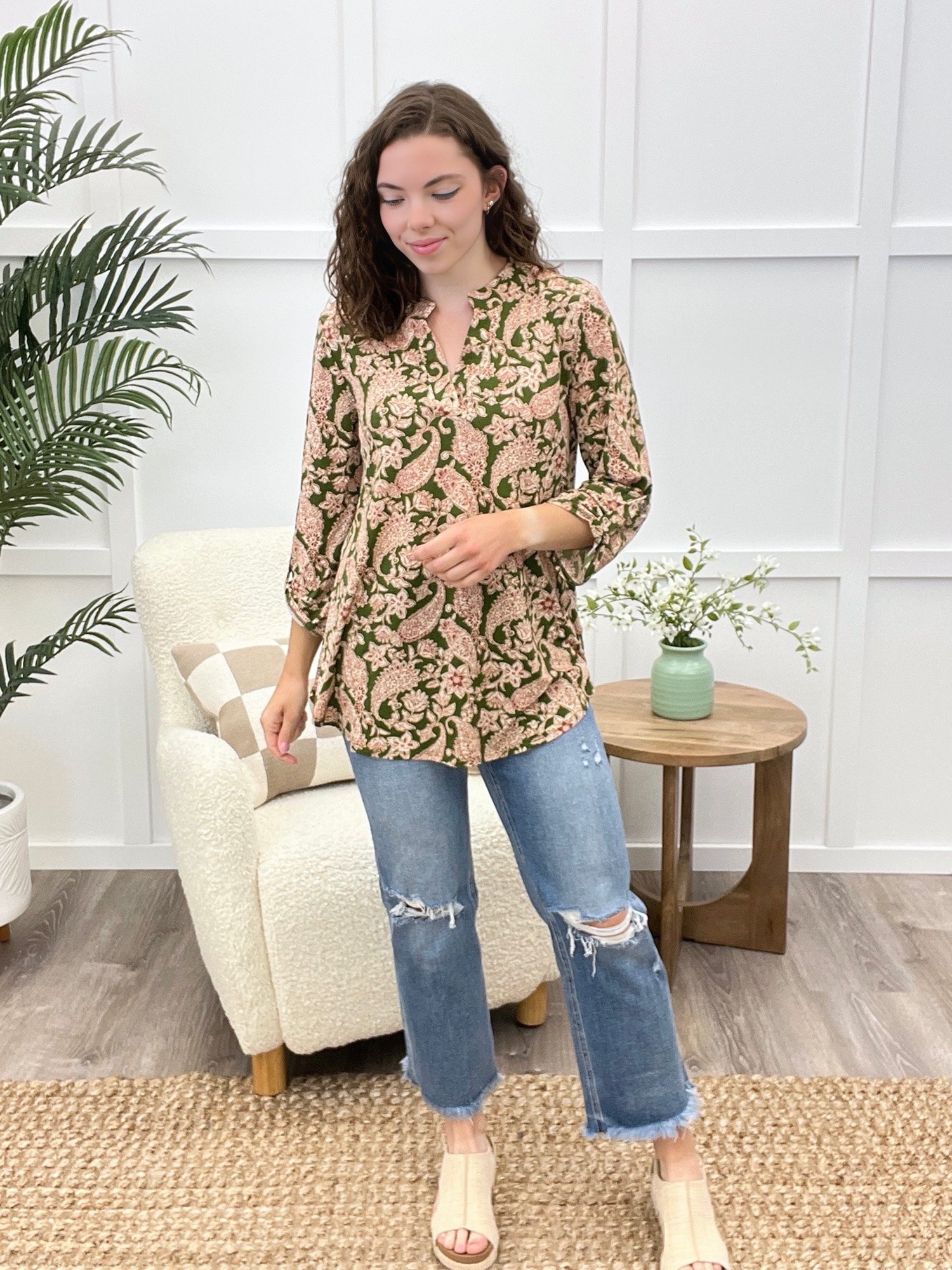 Breezy, polished, and ready for anything—this top brings comfort and charm in one easy piece. The wrinkle-free, lightweight fabric keeps you cool, while the mandarin collar and 3/4 tab sleeves add a crisp, tailored touch. The relaxed, flowy fit and subtle high-low hem make it perfect with slacks, jeans, or layered under a blazer.