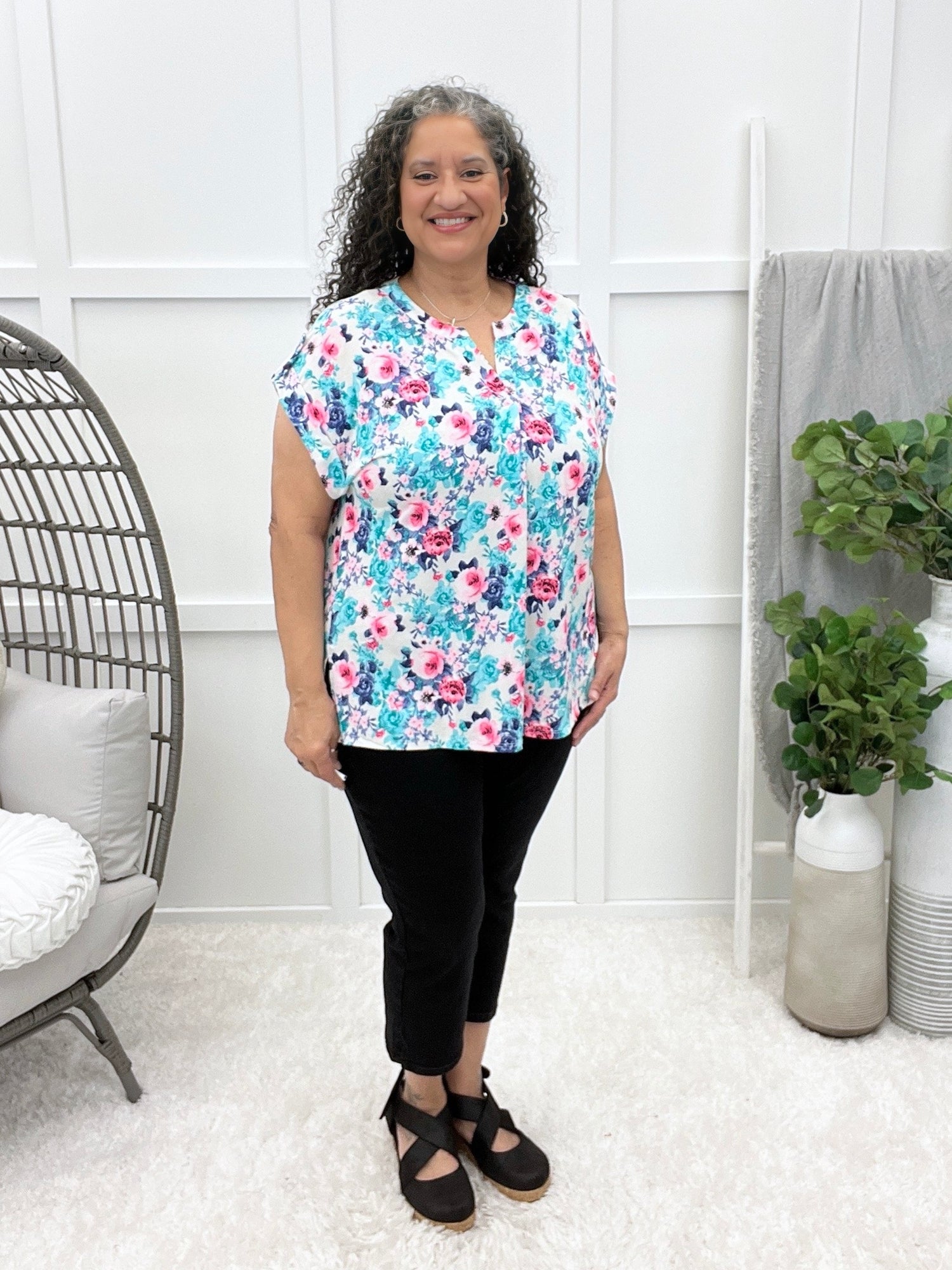 Introducing the Floral Voyage Short Sleeve Top, a perfect blend of vibrant style and all-day comfort. Featuring a stunning floral print and short sleeves with chic tabbed details, this top is designed to make a statement. The pleated back adds a touch of sophistication while maintaining a relaxed, flowy fit.