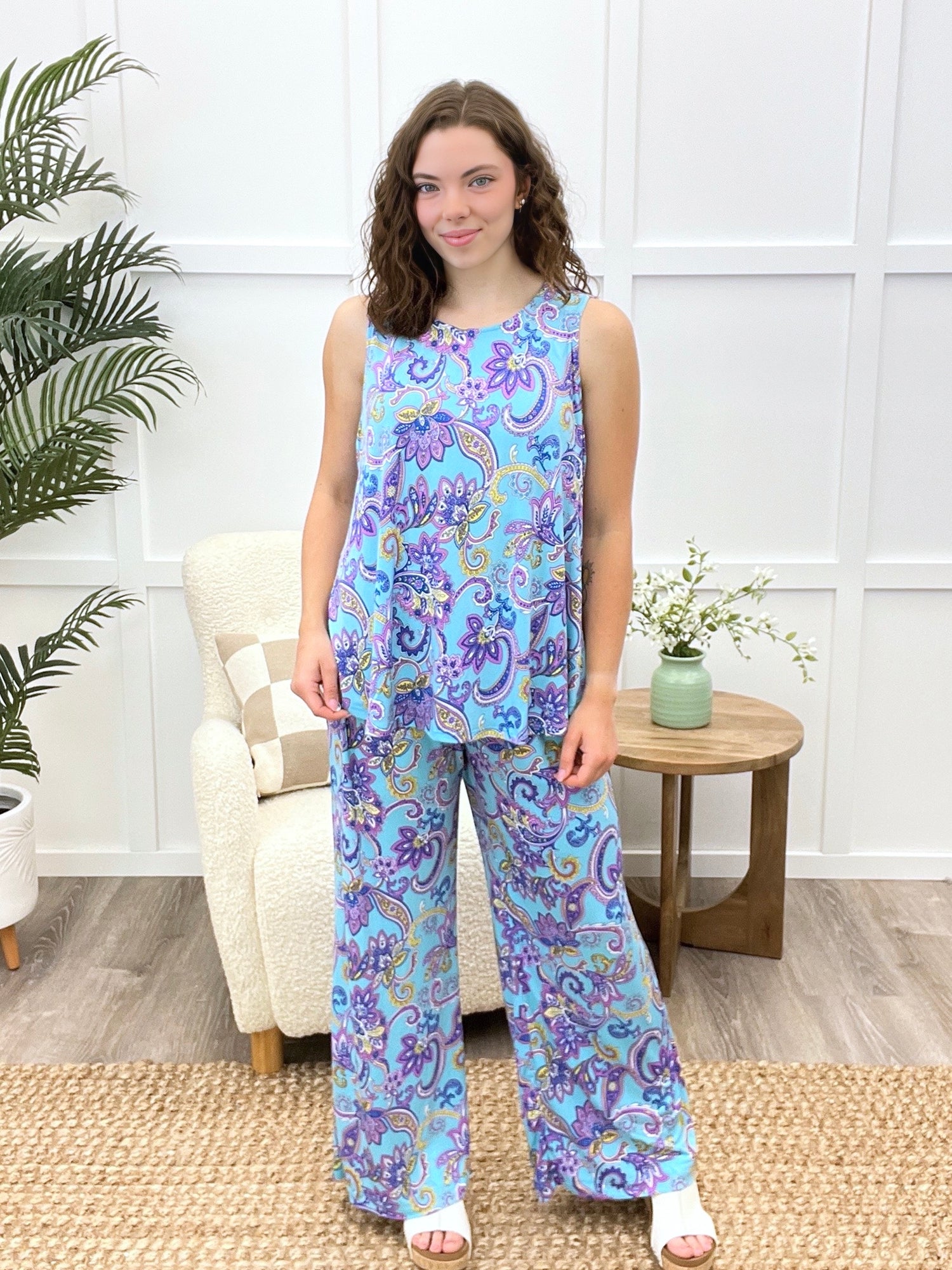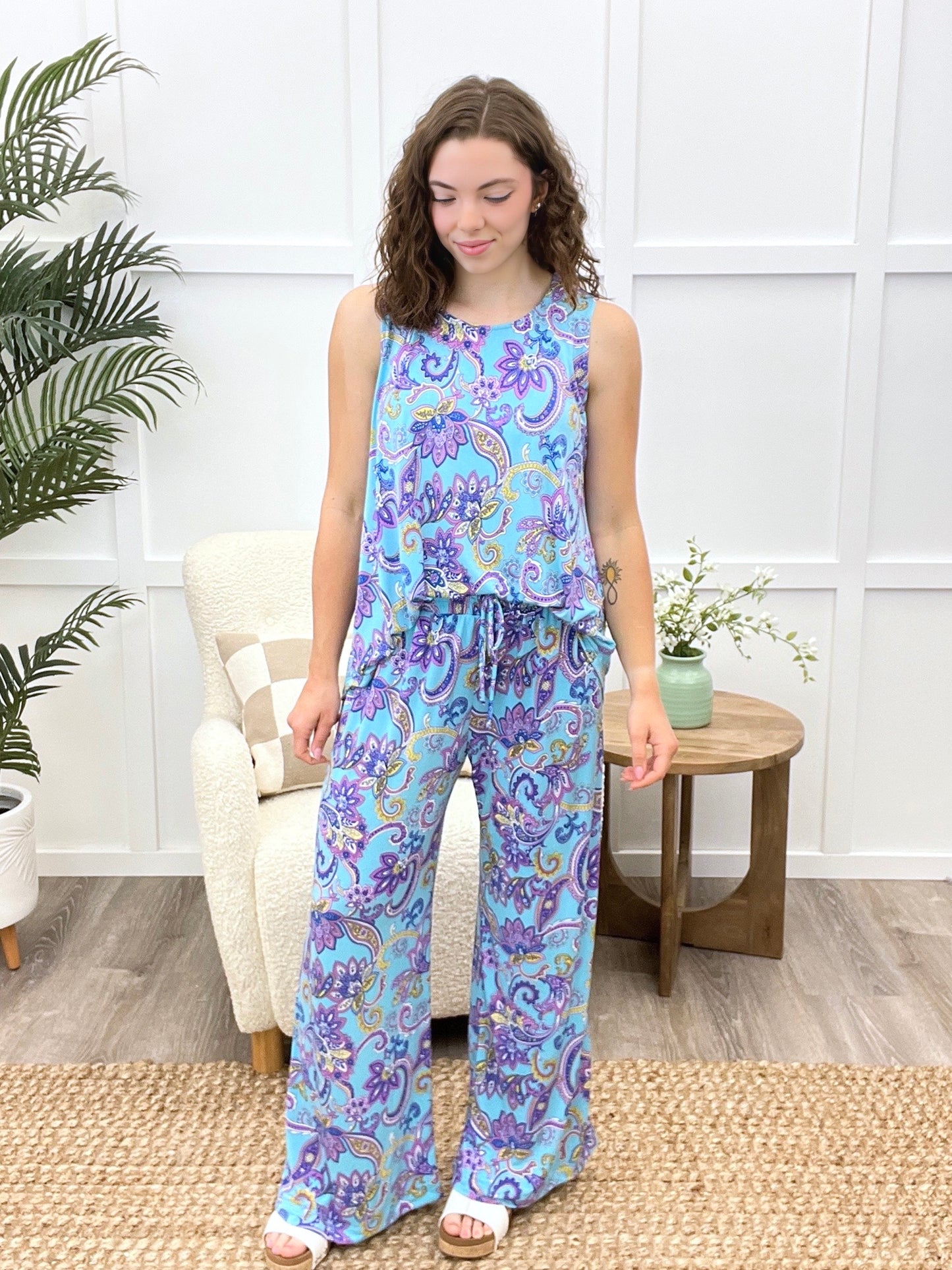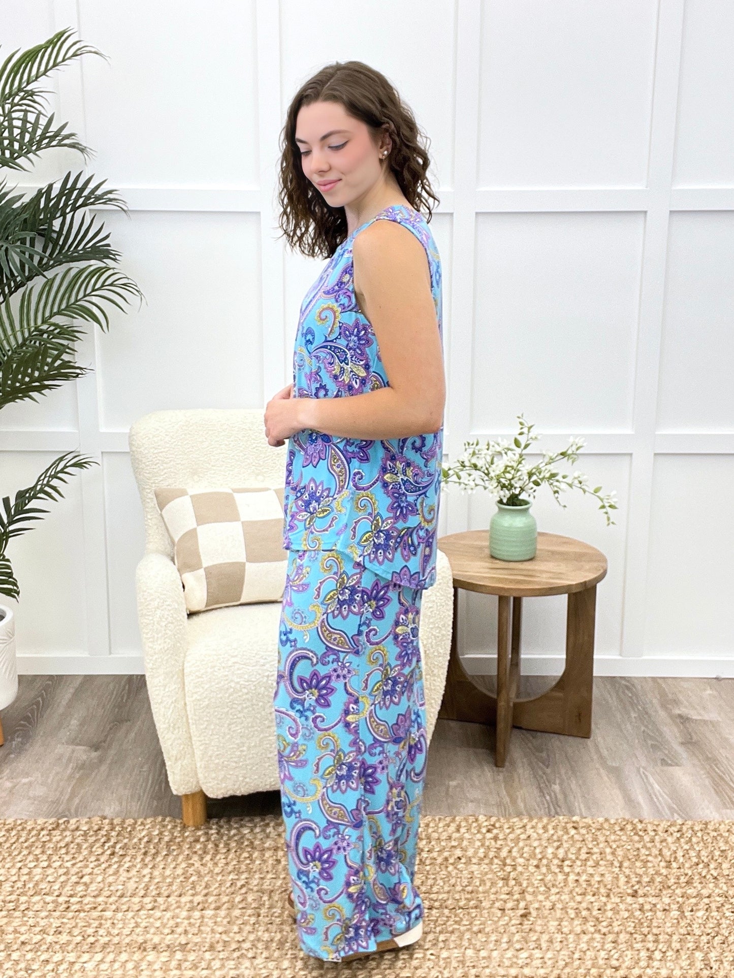 Embrace sunny days in this set, where comfort meets charm! This wrinkle-free printed duo features a breezy sleeveless blouse and loose-fit bottoms with an elastic waist, keeping you cool and carefree. Perfect for everything from jet-setting adventures to laid-back lounging, its playful print and flattering fit make warm-weather dressing a breeze.