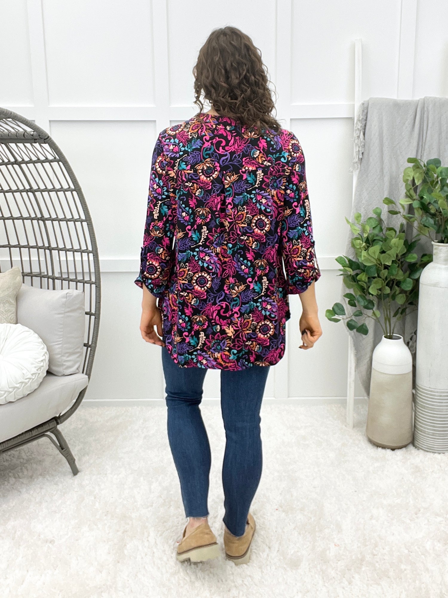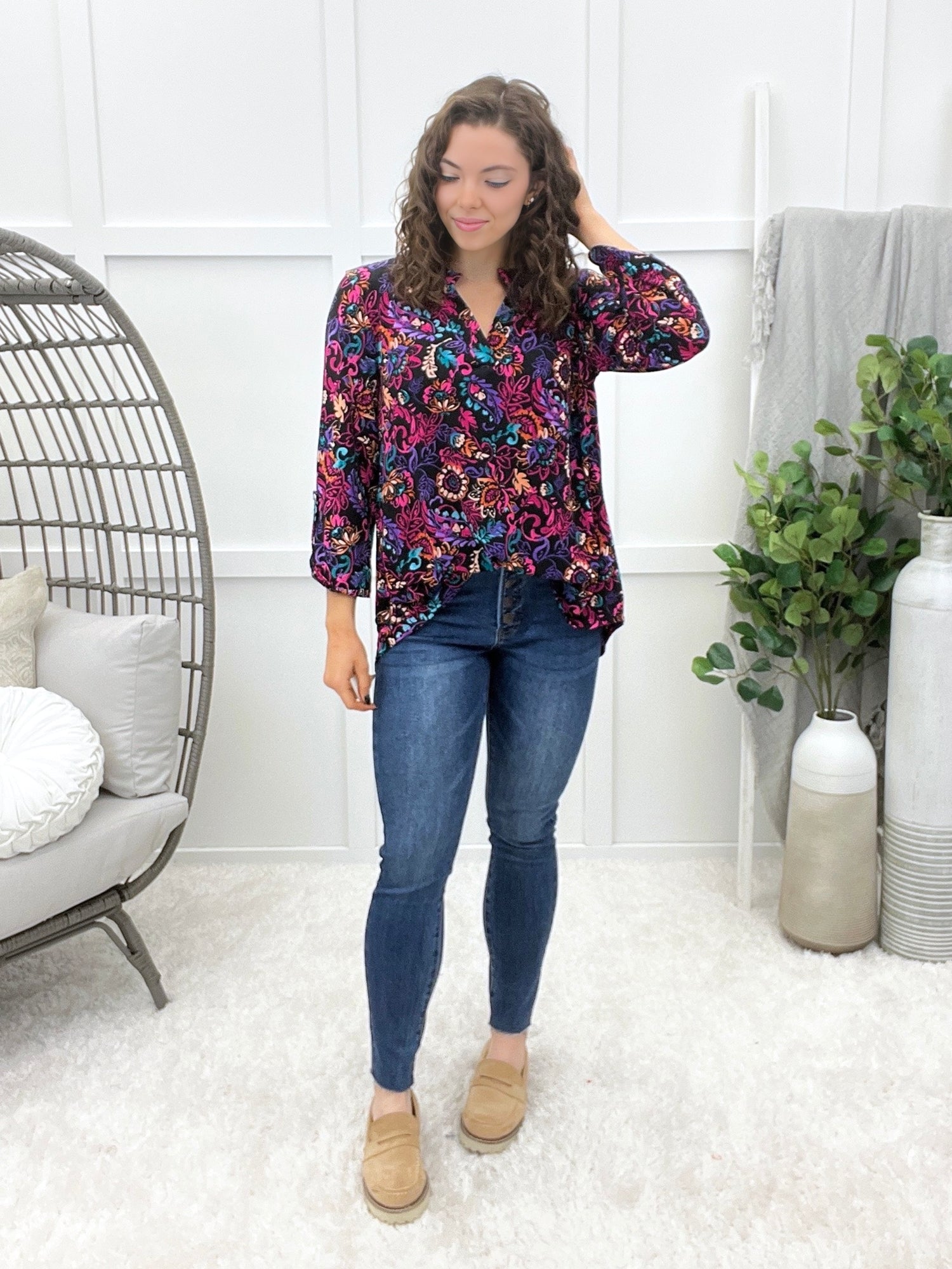 This wrinkle-free top is all about effortless charm with its crisp mandarin collar, subtle puffed sleeves, and delicate smocked cuffs. The long sleeves add a polished touch, while the relaxed fit keeps it comfy all day. Pair it with tailored pants for the office or denim for a dressed-up casual vibe!