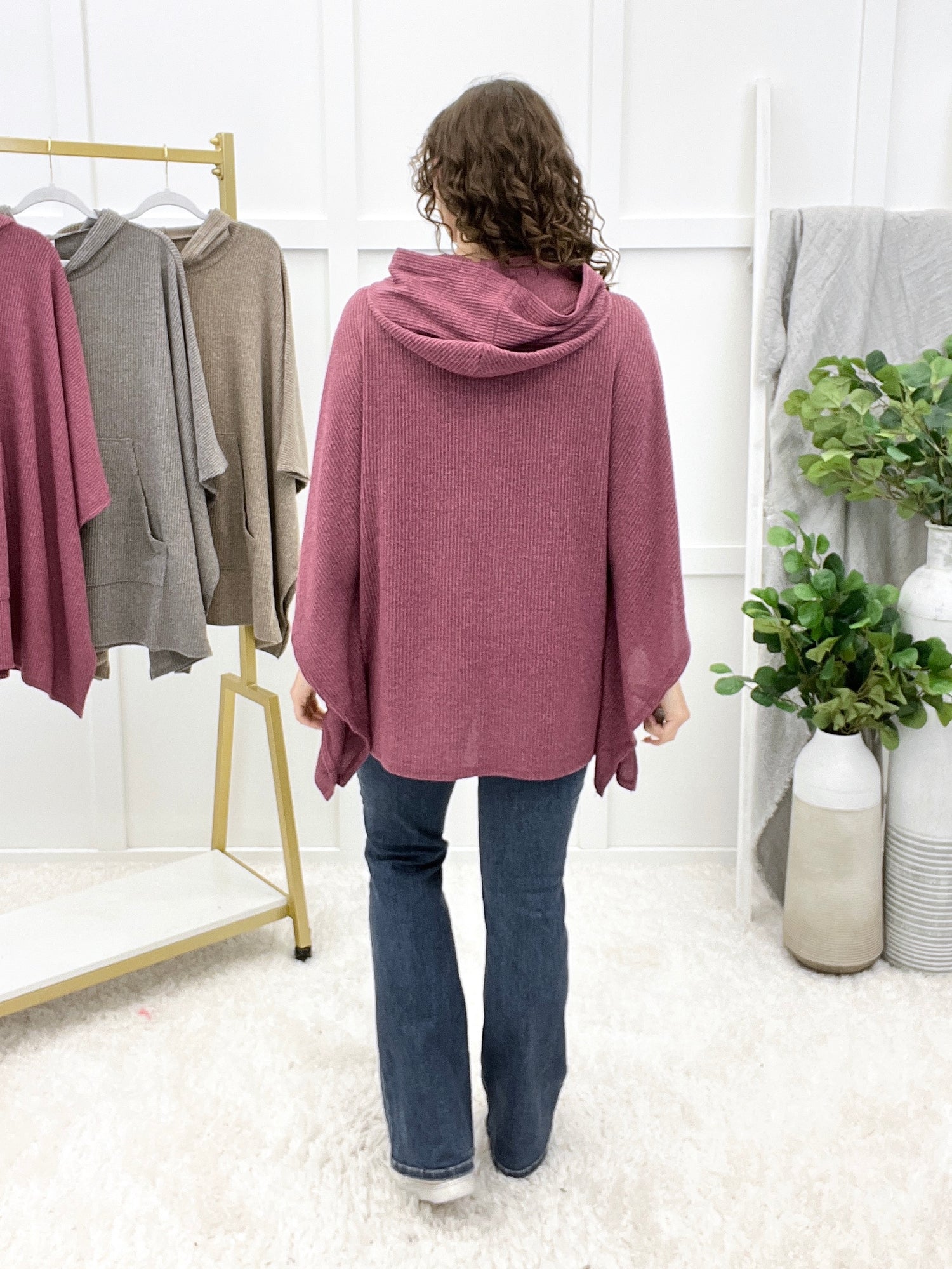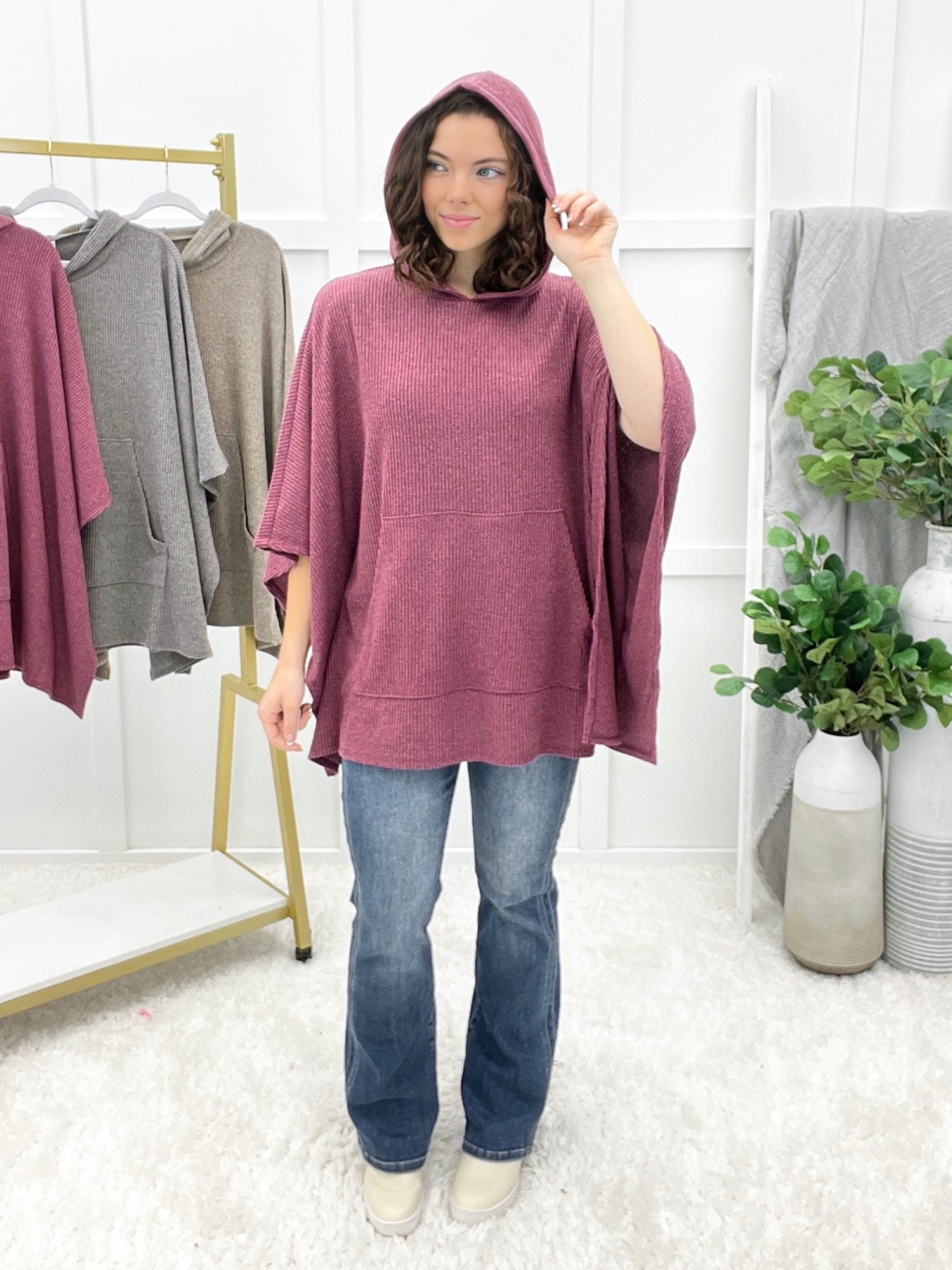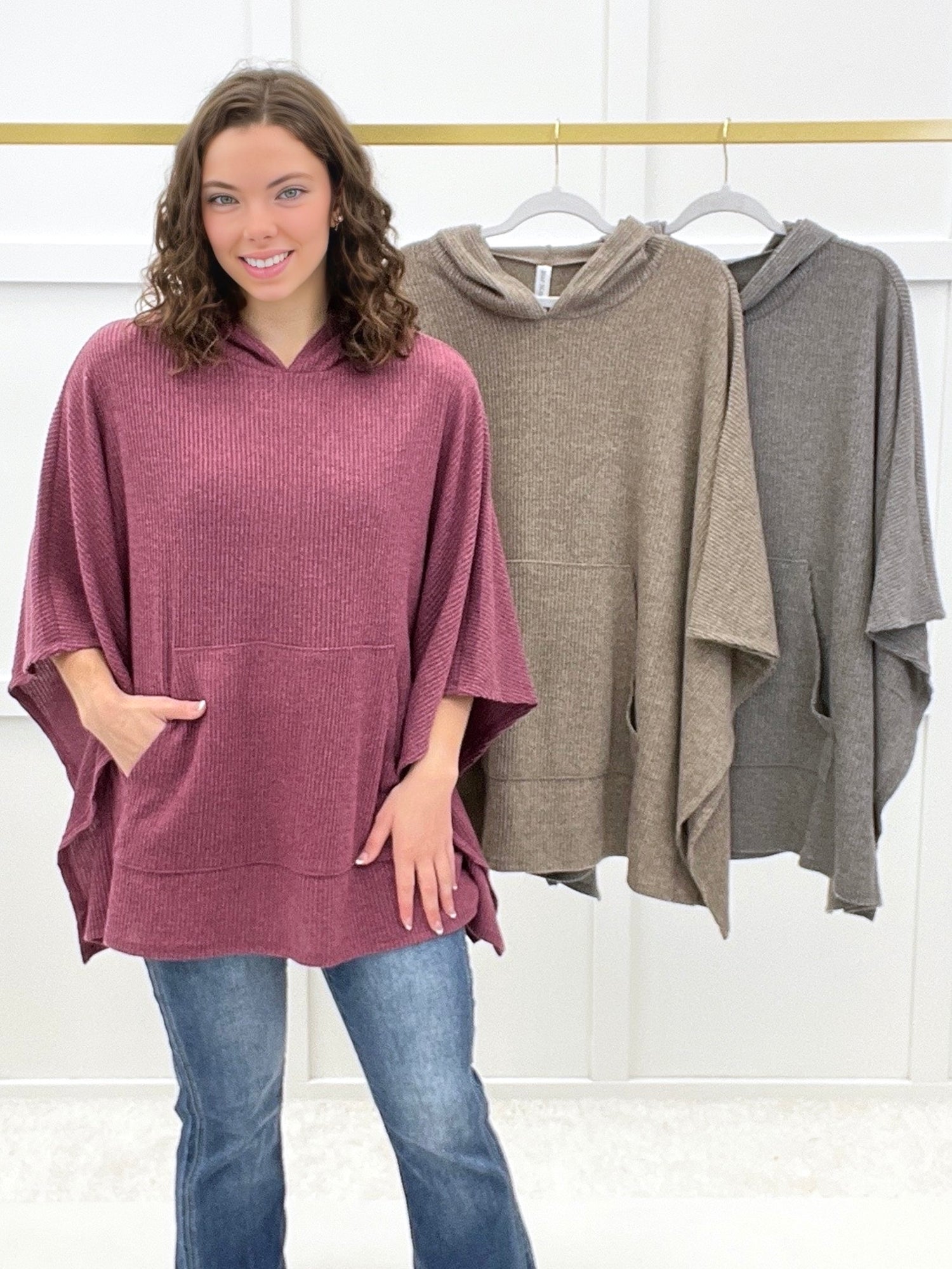 This ribbed knit poncho hooded top blends laid-back comfort with easy elegance. The poncho-style bodice drapes effortlessly for a roomy, relaxed fit, while the hood adds a casual, cozy touch. Perfect with leggings for lounging or layered over jeans for a chic, on-the-go look!