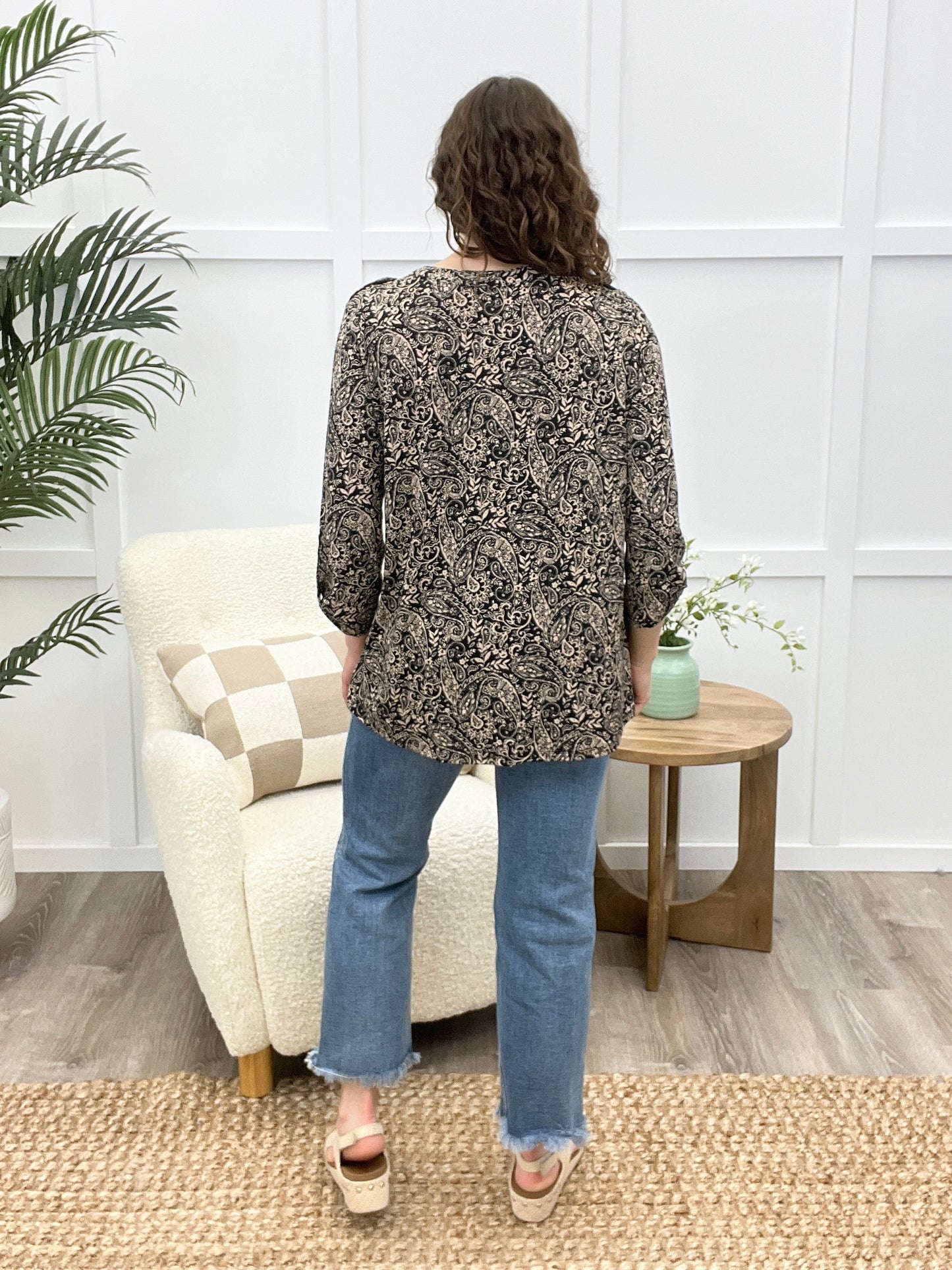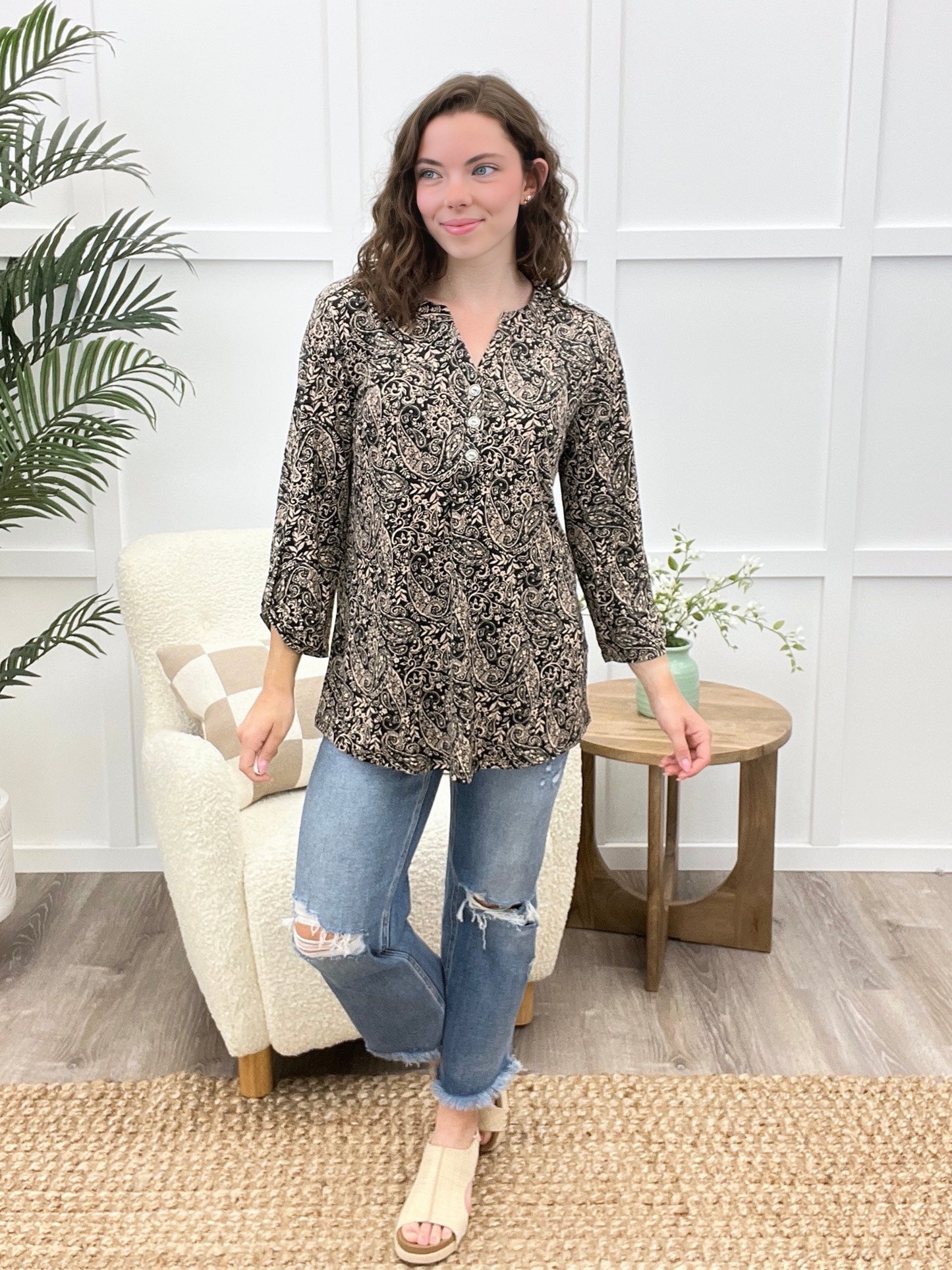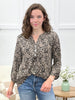 This will become your new favorite blouse! Featuring a polished neckline, faux front pockets, button detail, and a relaxed fit, it blends sophistication with everyday ease. Made from travel-friendly, wrinkle-free fabric—just toss it on and go, no ironing required!