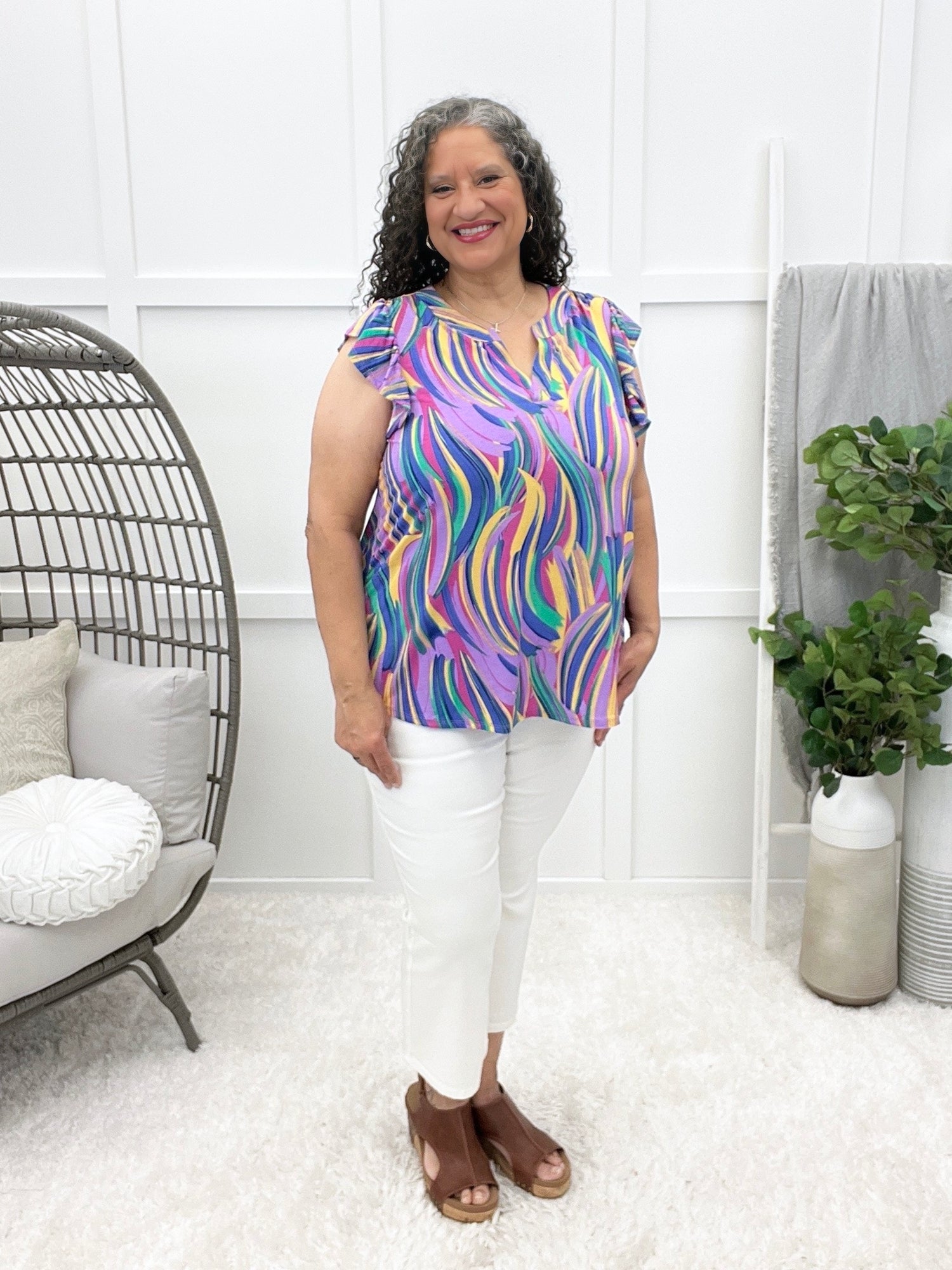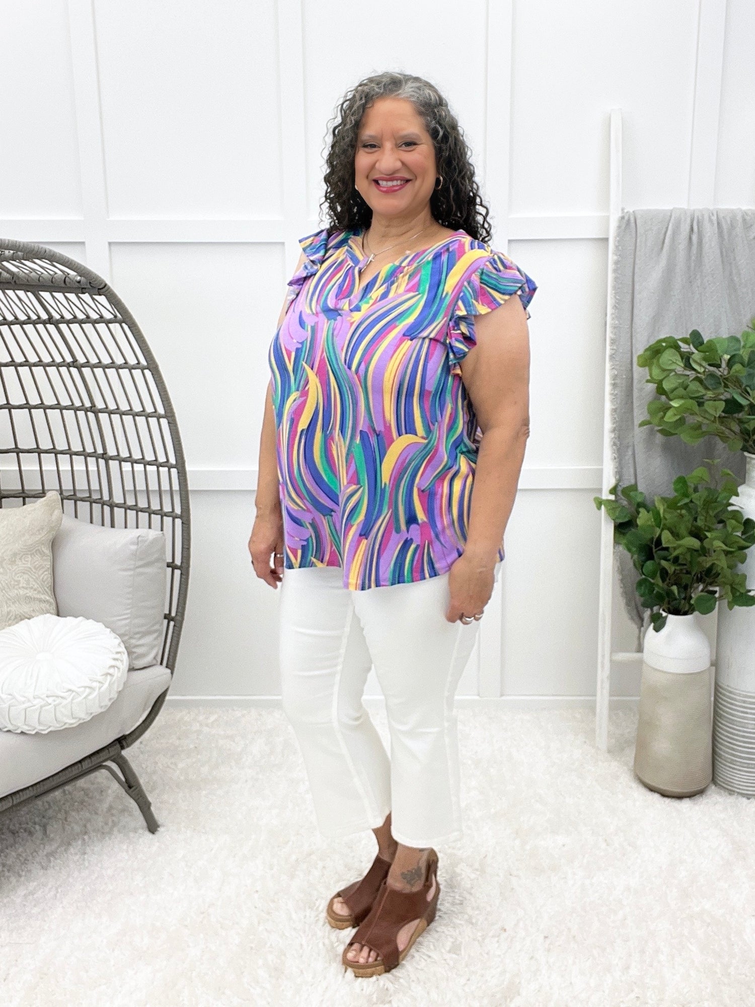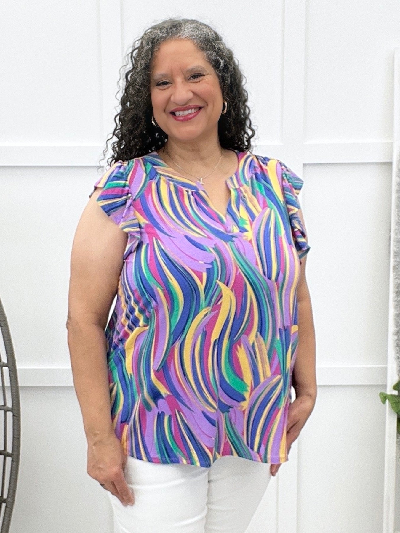 This wrinkle-free top is all about effortless charm with its crisp mandarin collar and subtle feminine flutter sleeves. It drapes beautifully for a relaxed yet polished fit. Pair it with tailored pants for the office or denim for a dressed-up casual vibe!