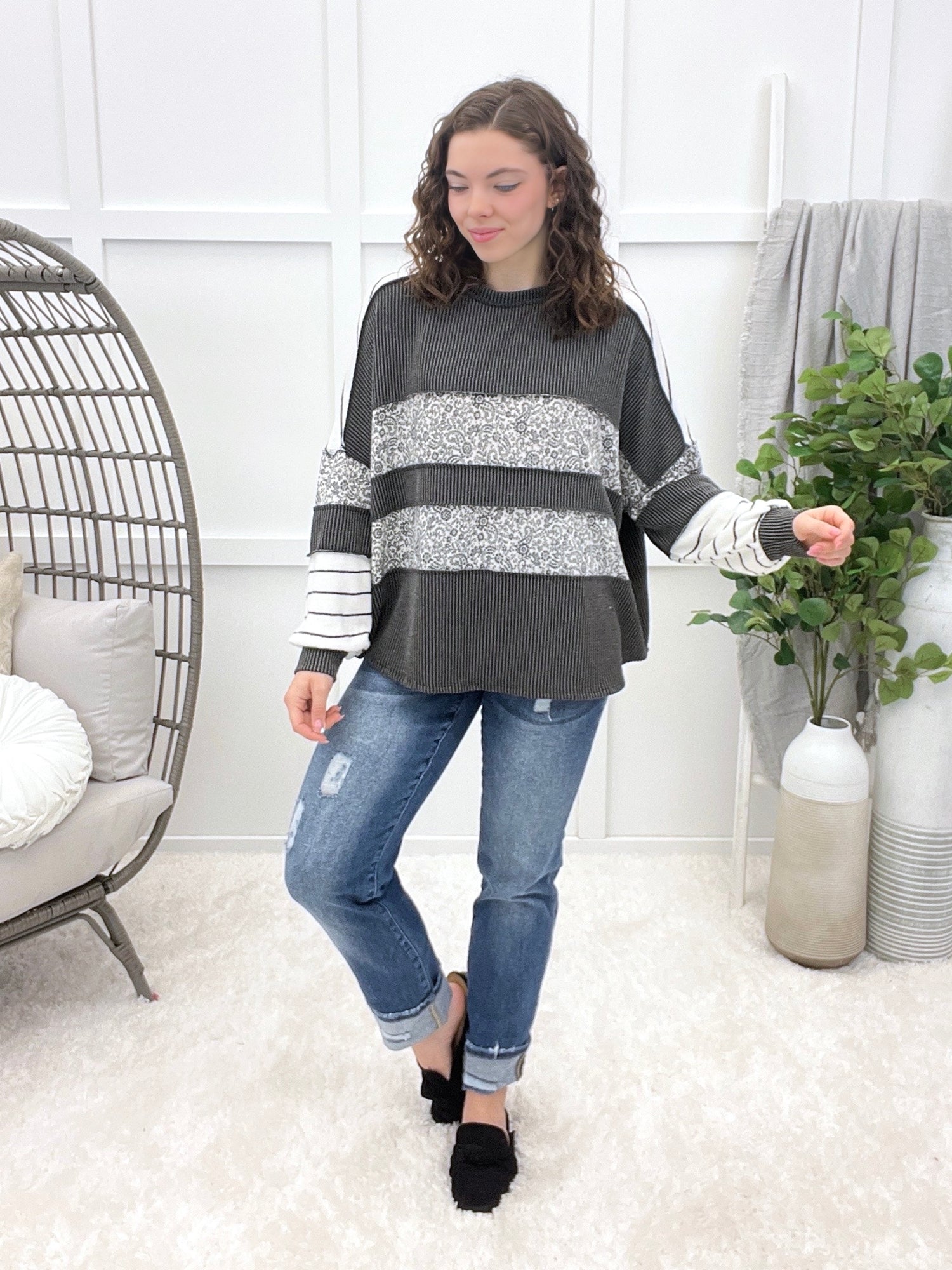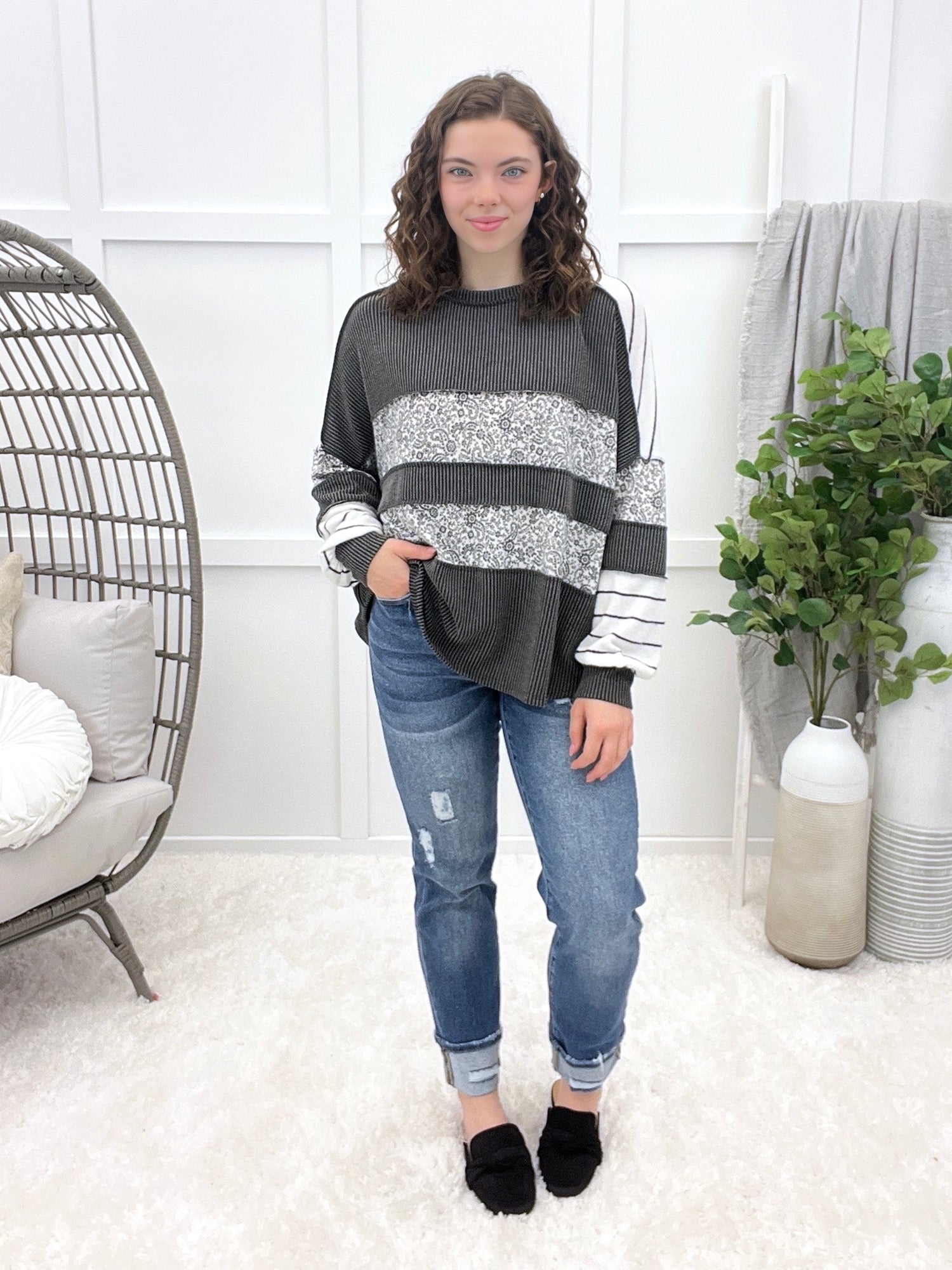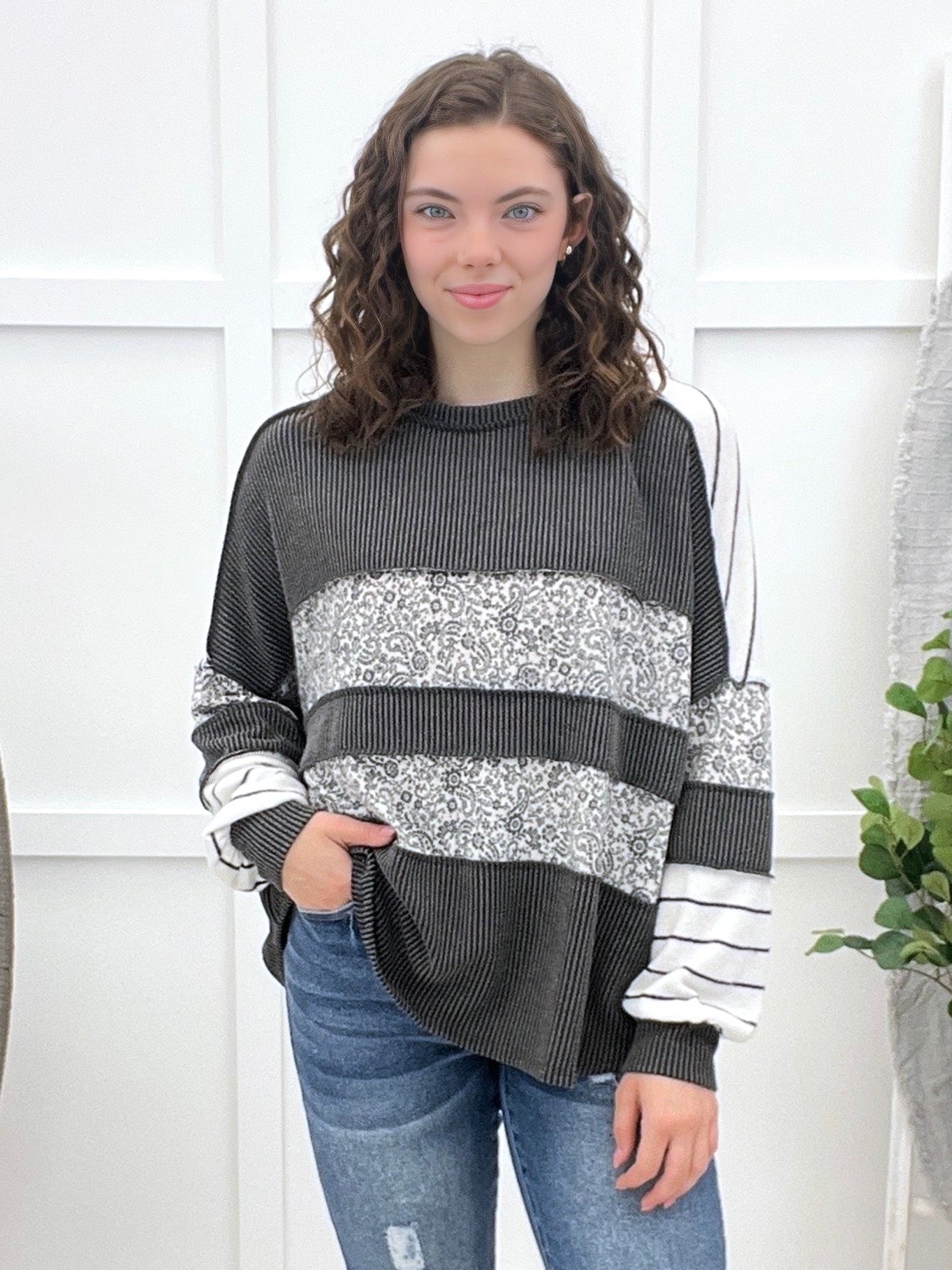Timeless style meets modern charm in this cozy round-neck, drop-shoulder pullover. Featuring a striking blend of stripe yoke, paisley floral print, and color-block wave rib knit, it brings a fresh, elegant twist to a classic silhouette. Thoughtfully detailed with exposed overlock reverse seams and crafted from ultra-soft fabric, it offers luxurious comfort for everything from a casual coffee run to an evening stroll. Effortlessly refined, it turns a simple throw-on into a standout statement.