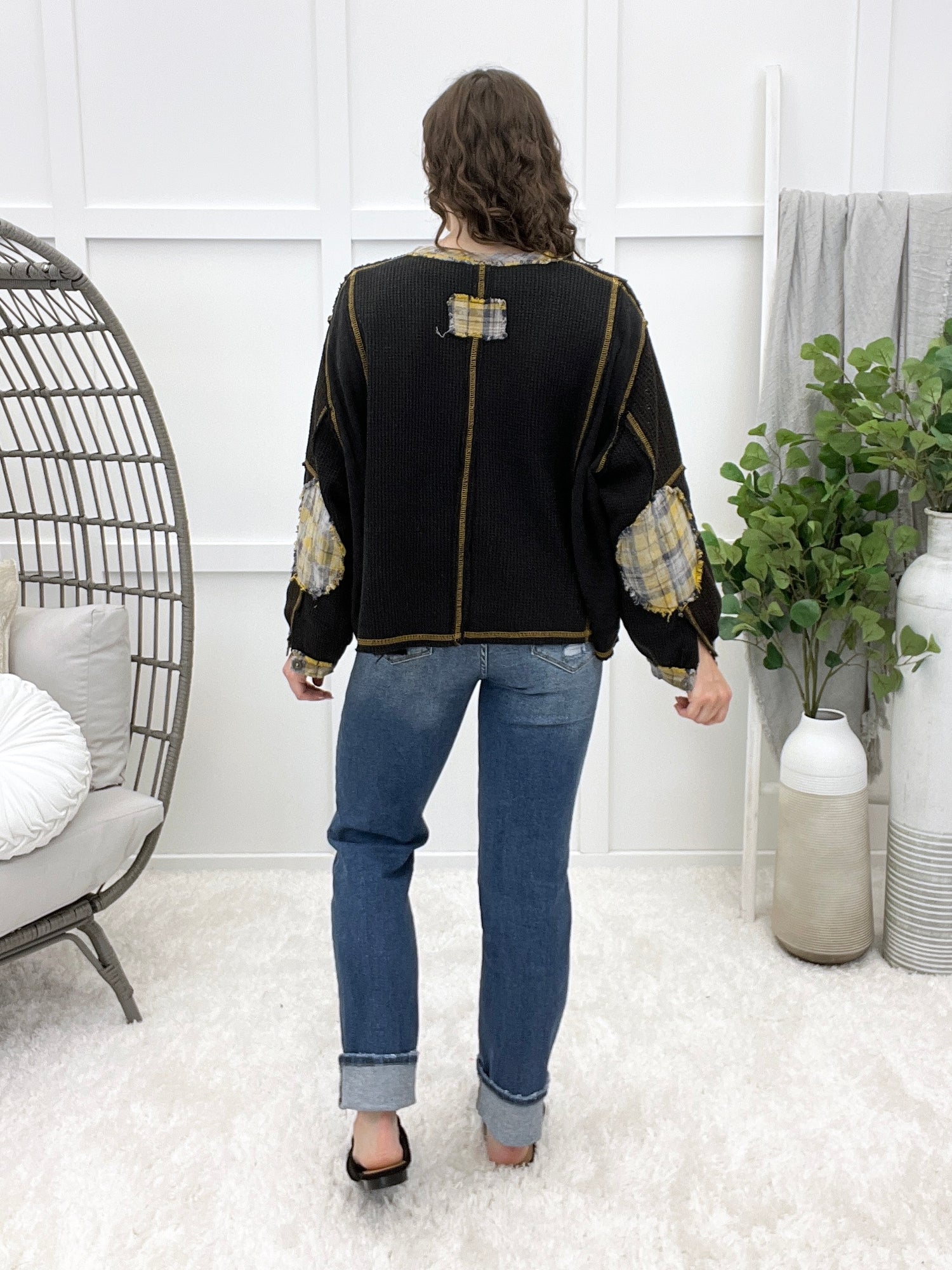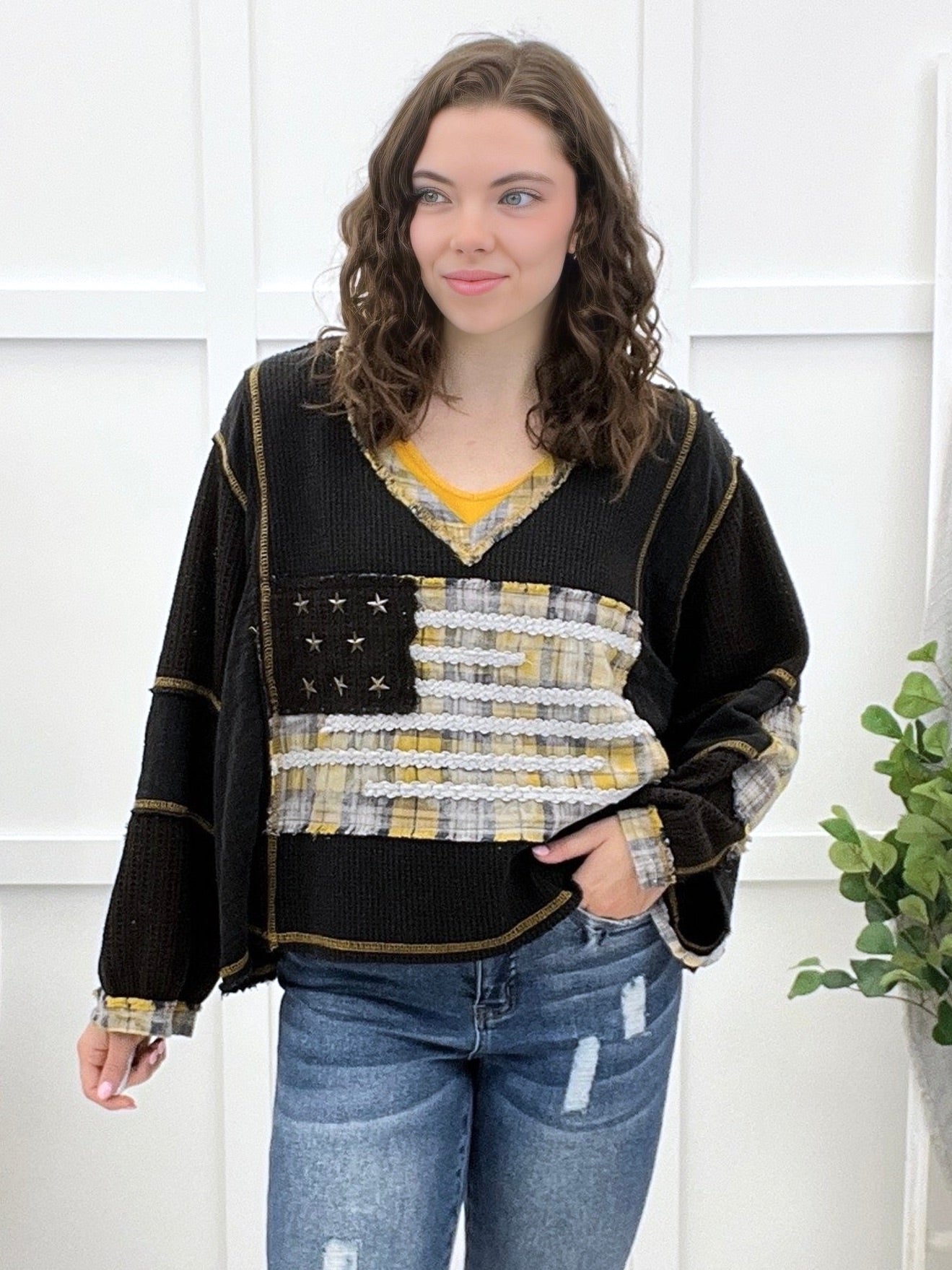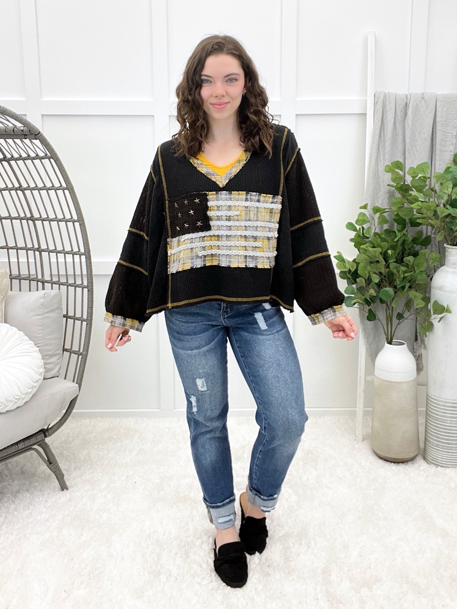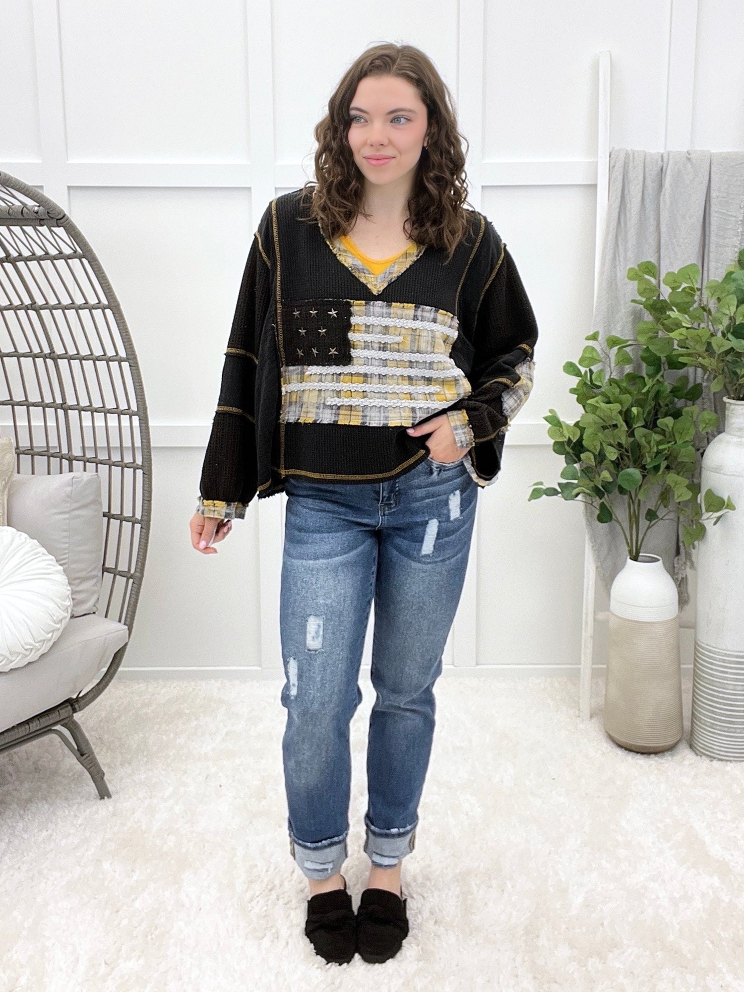 The Forever Flag Top brings cozy fun to your wardrobe with its thermal fabric and oversized fit. Featuring playful balloon sleeves and a flattering V-neck, this top is adorned with stud and trim details that highlight its unique pointed flag plaid pattern. Perfect for layering or wearing solo, it’s your new go-to for easy style and comfy vibes.