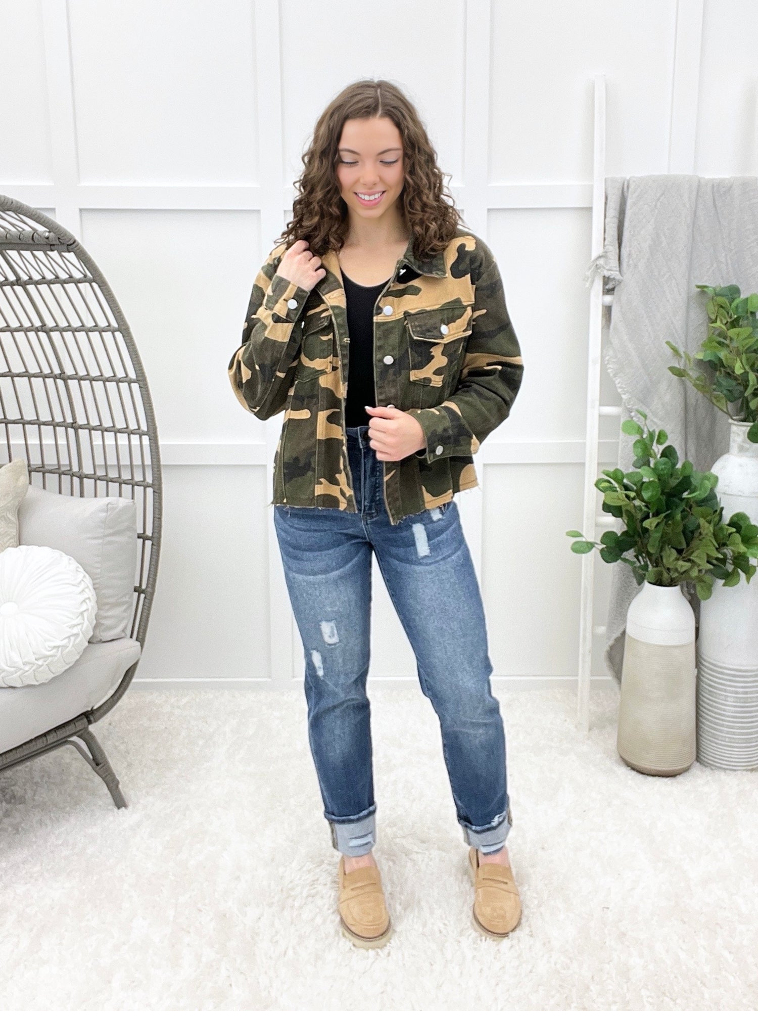 Slip into effortless cool with the Pretty in Camo Shacket, a washed camouflage button-front that's equal parts edgy and laid-back. This oversized loose-fit piece features a relaxed silhouette and eye-catching cut-edge details that give it serious street-style credentials. Layer it over anything for an instant vibe upgrade.