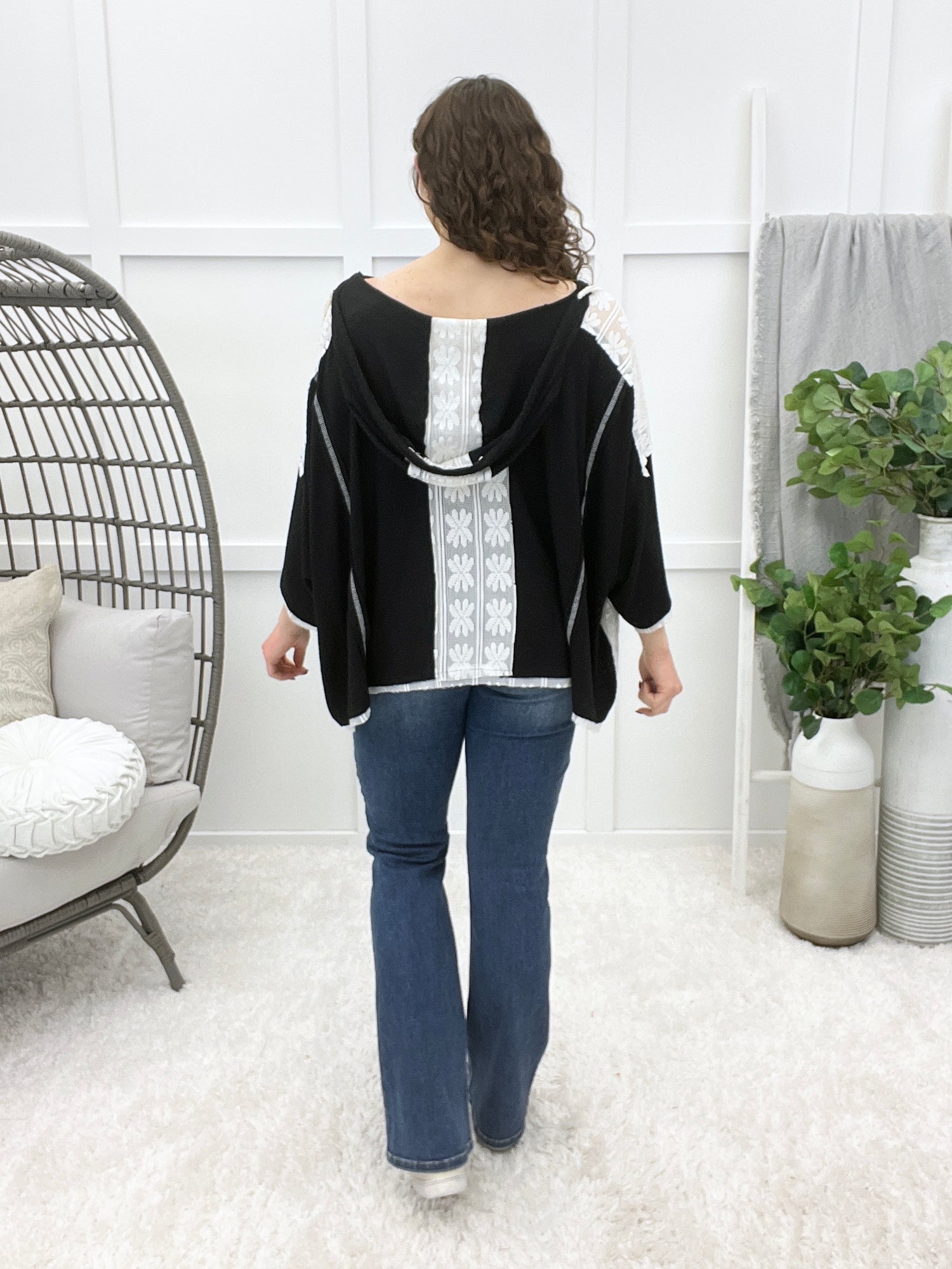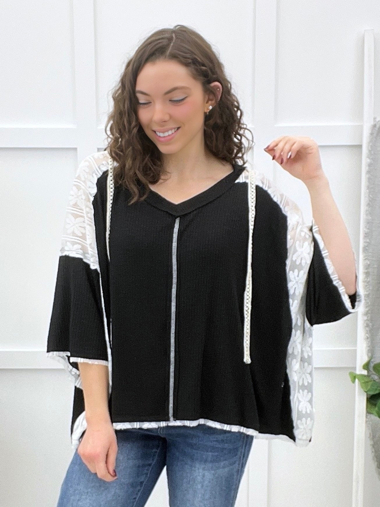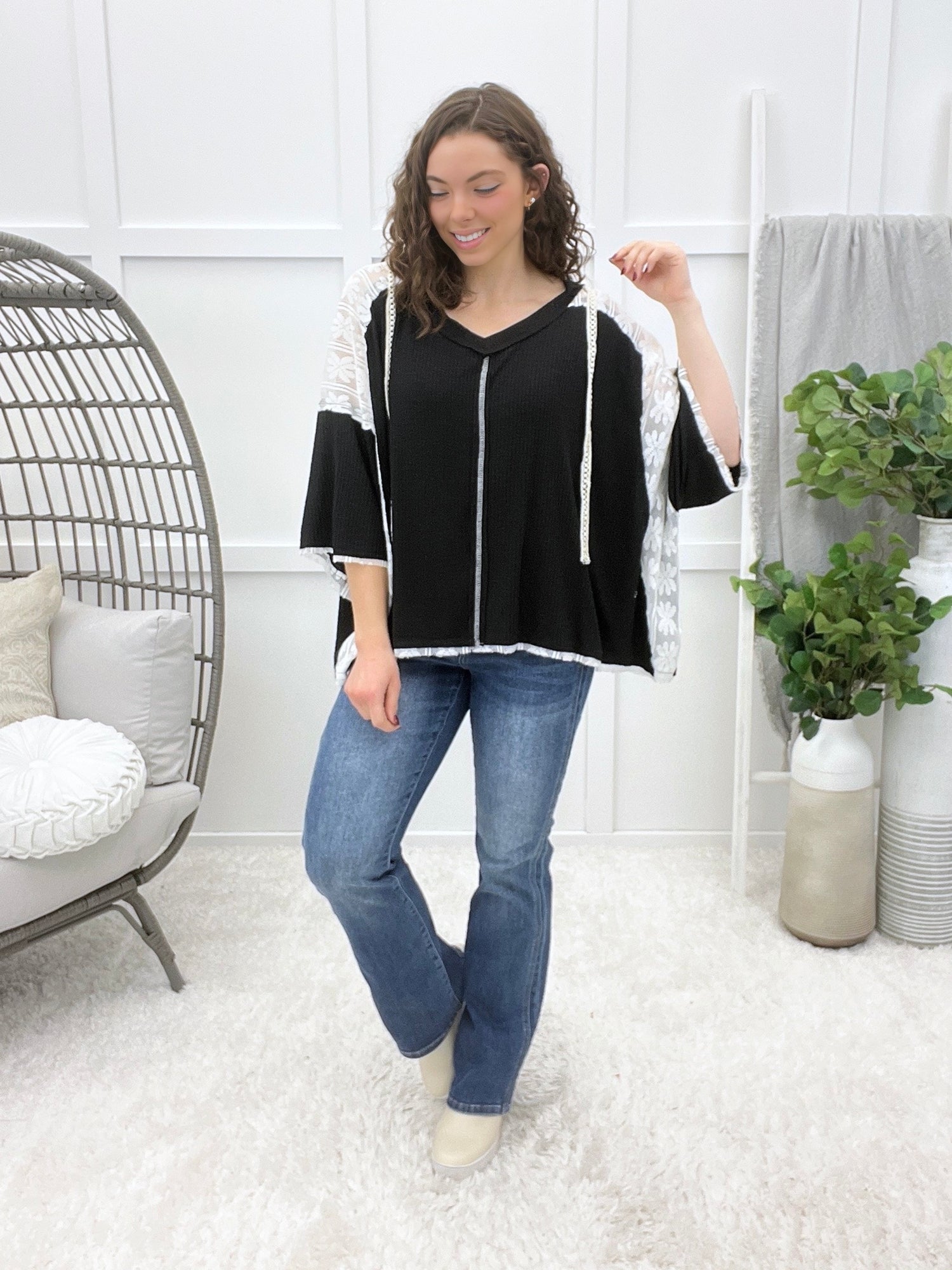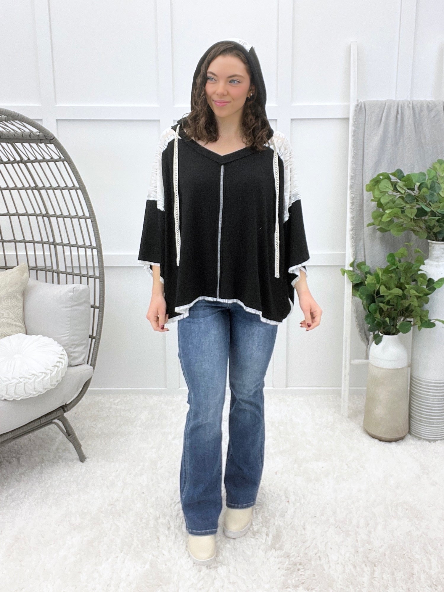 Stay effortlessly cool in this V-neck short sleeve airy hoodie top, designed for easygoing comfort with a relaxed fit. Ribbed fabric, lace patch details, and vintage-washed edges give it that perfectly lived-in look, while outseam stitching and panel accents add extra character. Pair it with jeans, joggers, or shorts for a laid-back, everyday vibe that still feels uniquely styled.
