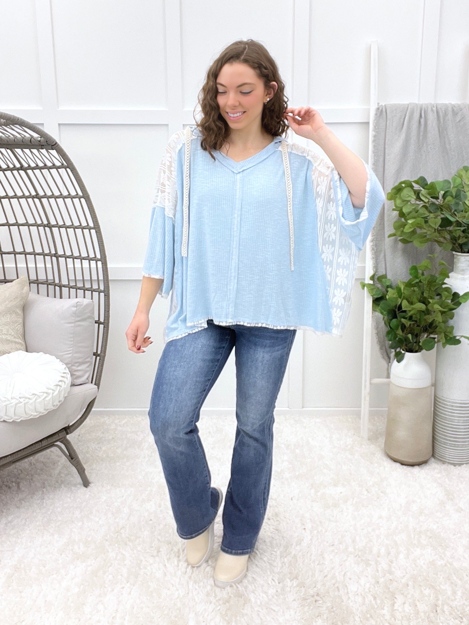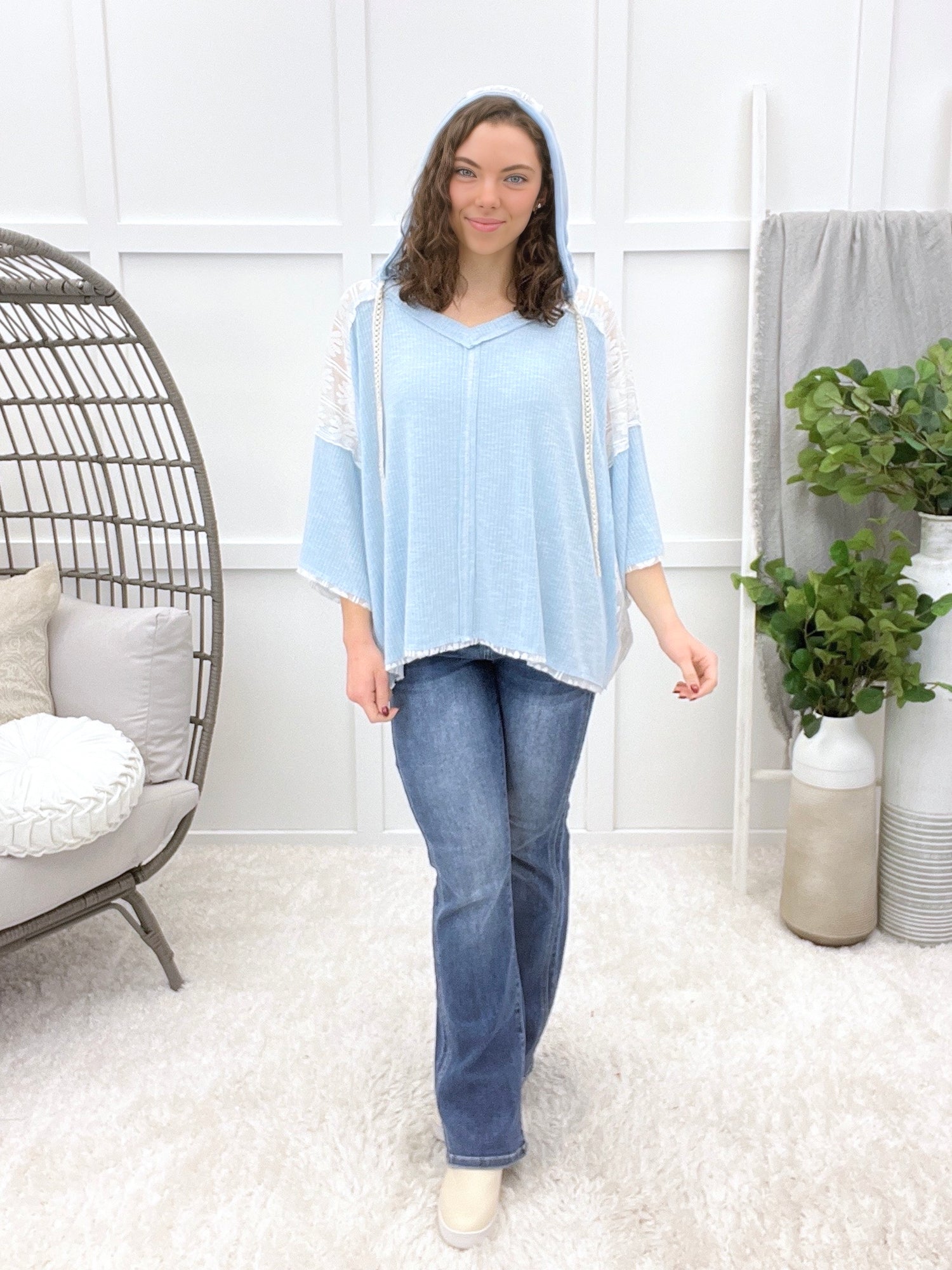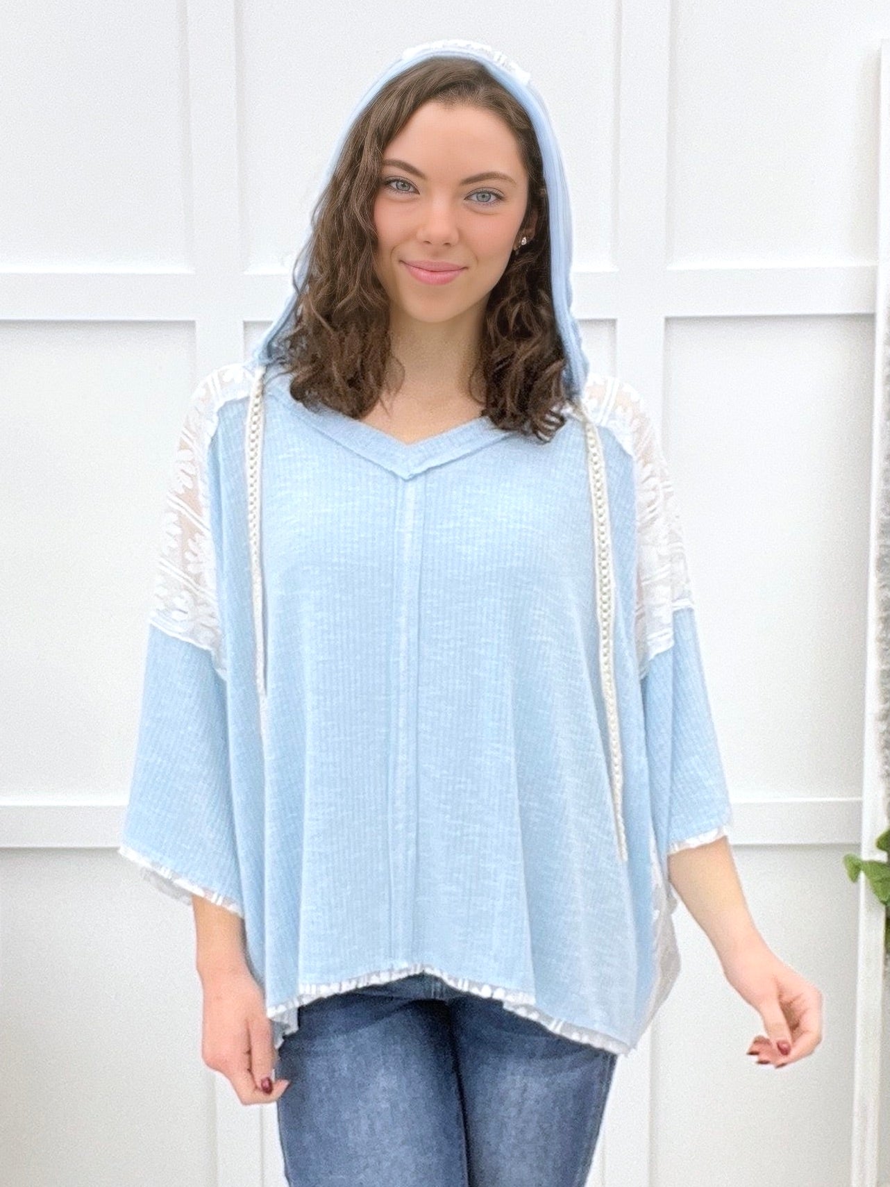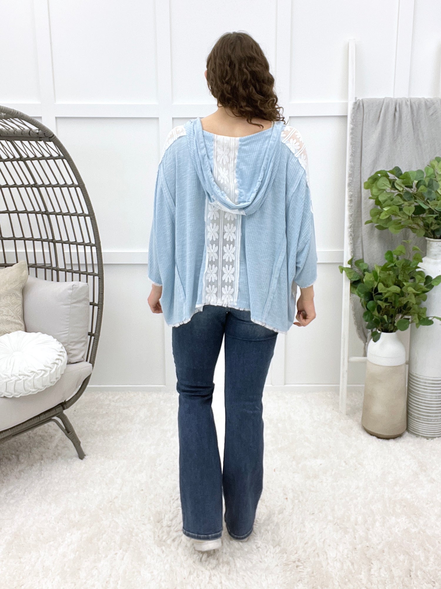 Stay effortlessly cool in this V-neck short sleeve airy hoodie top, designed for easygoing comfort with a relaxed fit. Ribbed fabric, lace patch details, and vintage-washed edges give it that perfectly lived-in look, while outseam stitching and panel accents add extra character. Pair it with jeans, joggers, or shorts for a laid-back, everyday vibe that still feels uniquely styled.