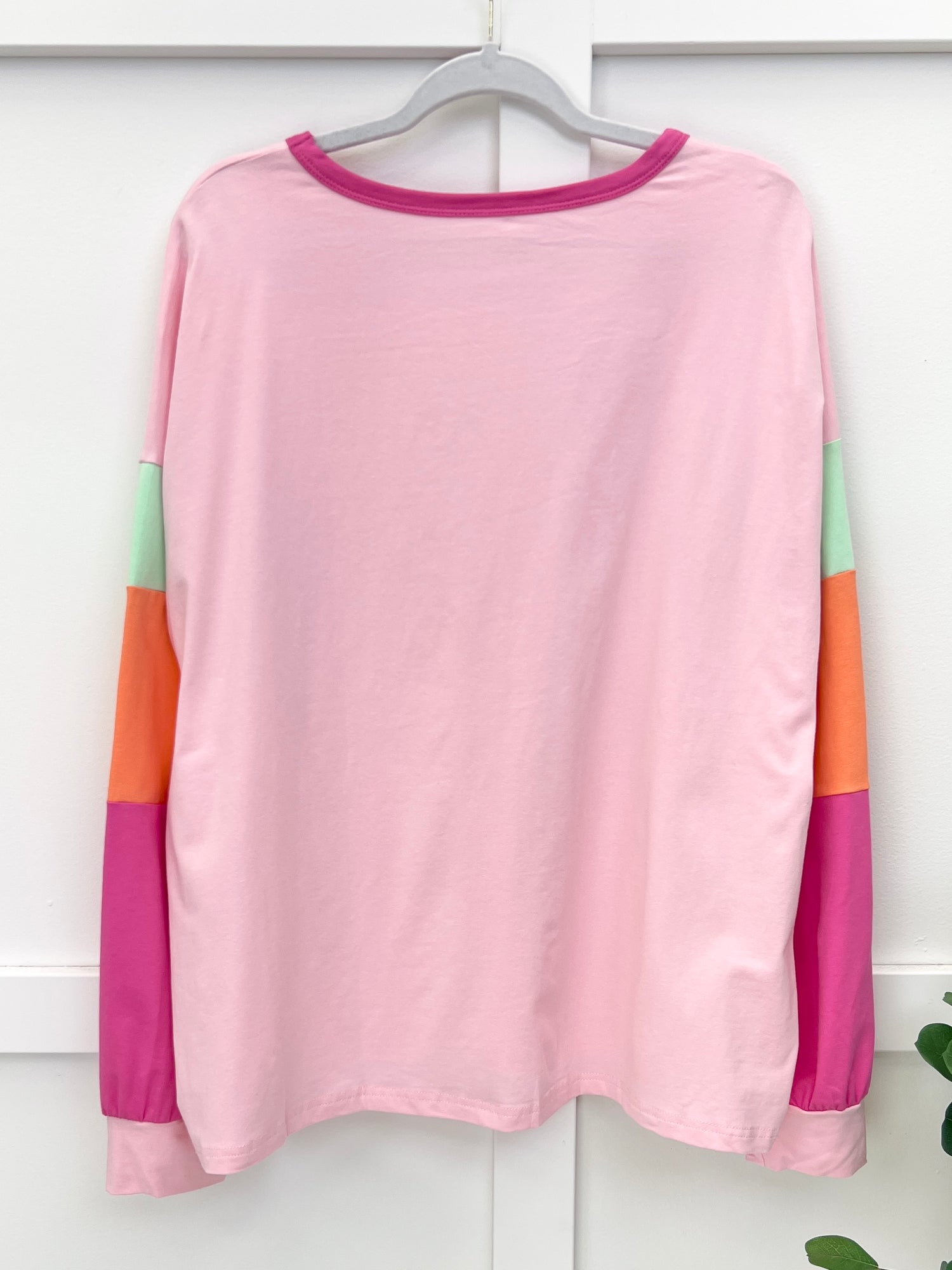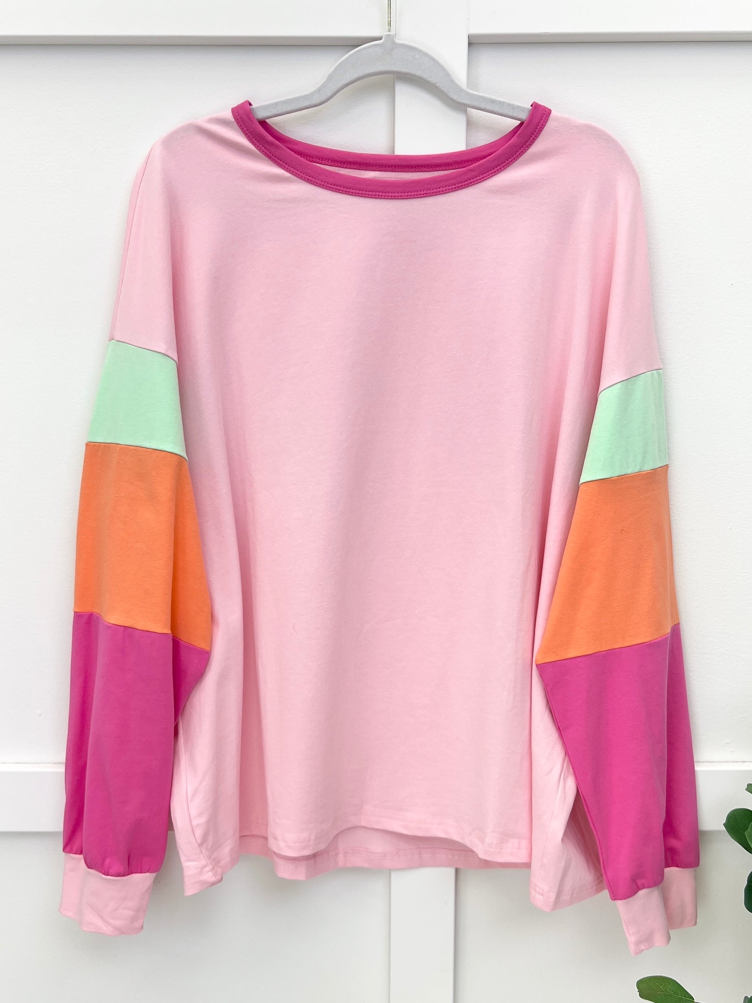 Layer up in playful style with this color block patchwork long sleeve top. Featuring bold, contrasting color panels sewn together in a fun geometric design, it's the perfect piece to express your personality. The relaxed fit keeps you comfy all day long, while the long sleeves offer versatile coverage for any season. Mix and match with your favorite bottoms for an effortlessly cute look that stands out from the crowd.