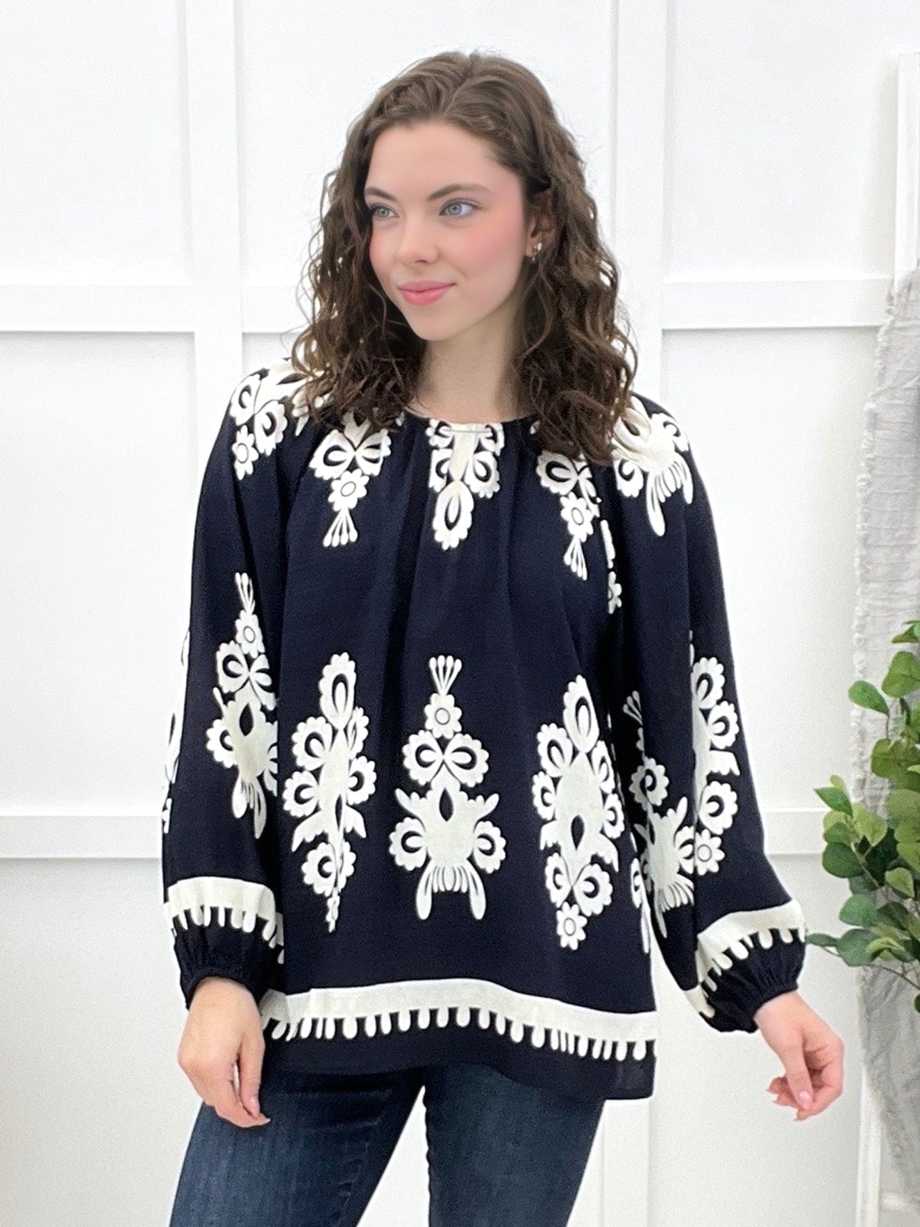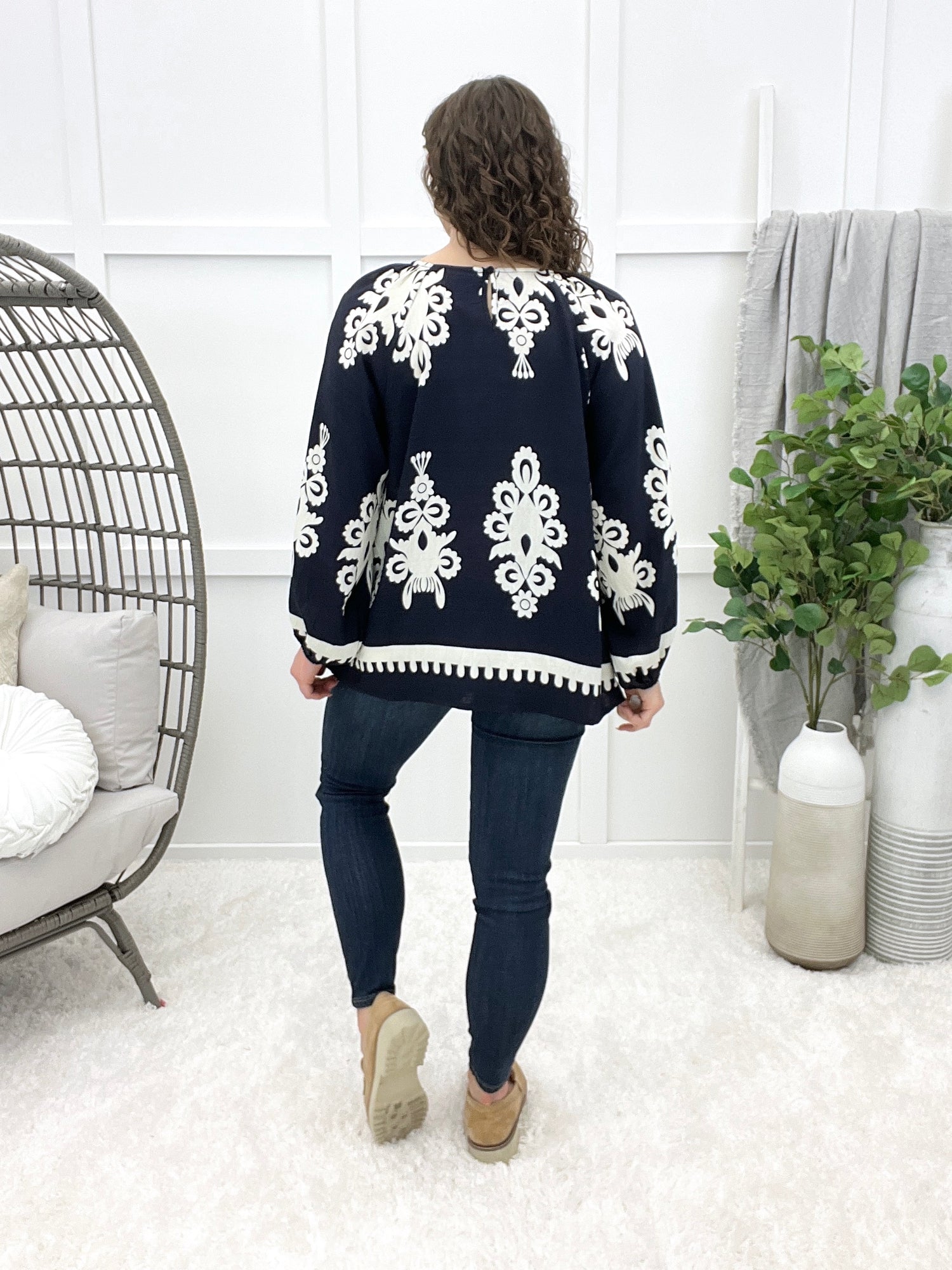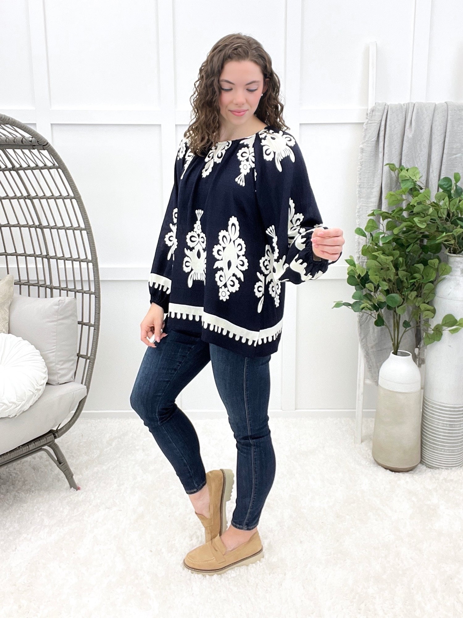 This two-tone border print top brings the vibes with its round neckline, breezy balloon sleeves, and relaxed, flowy fit. The straight hem keeps it easy to tuck or wear loose for that effortless look. Style it with jeans or shorts for farmers' markets, coffee dates, or laid-back weekends!