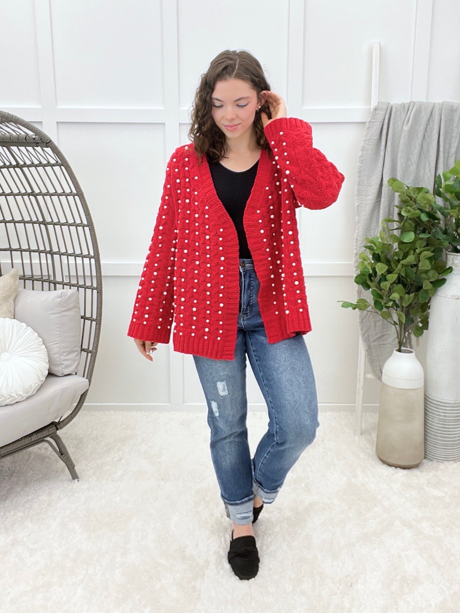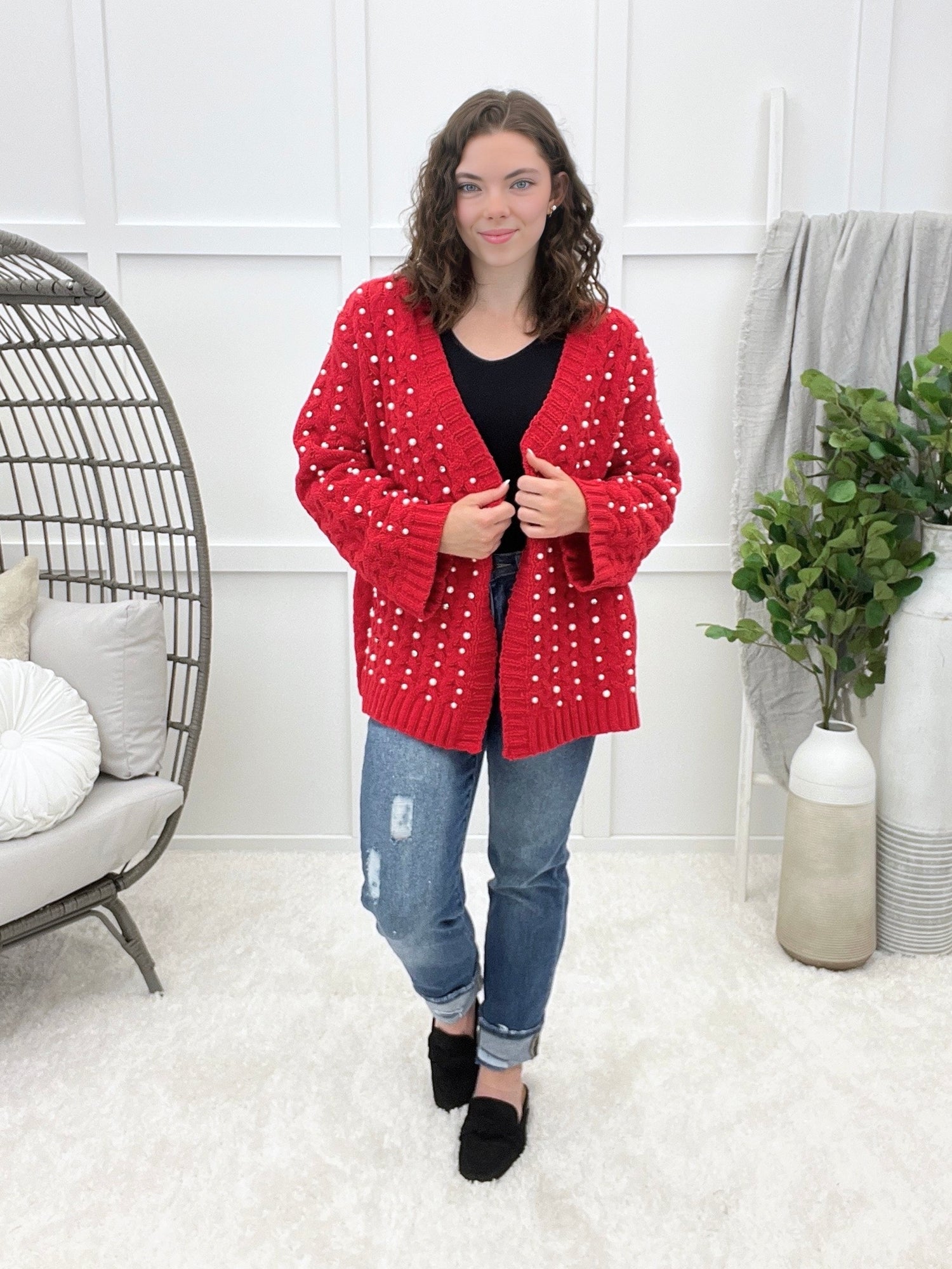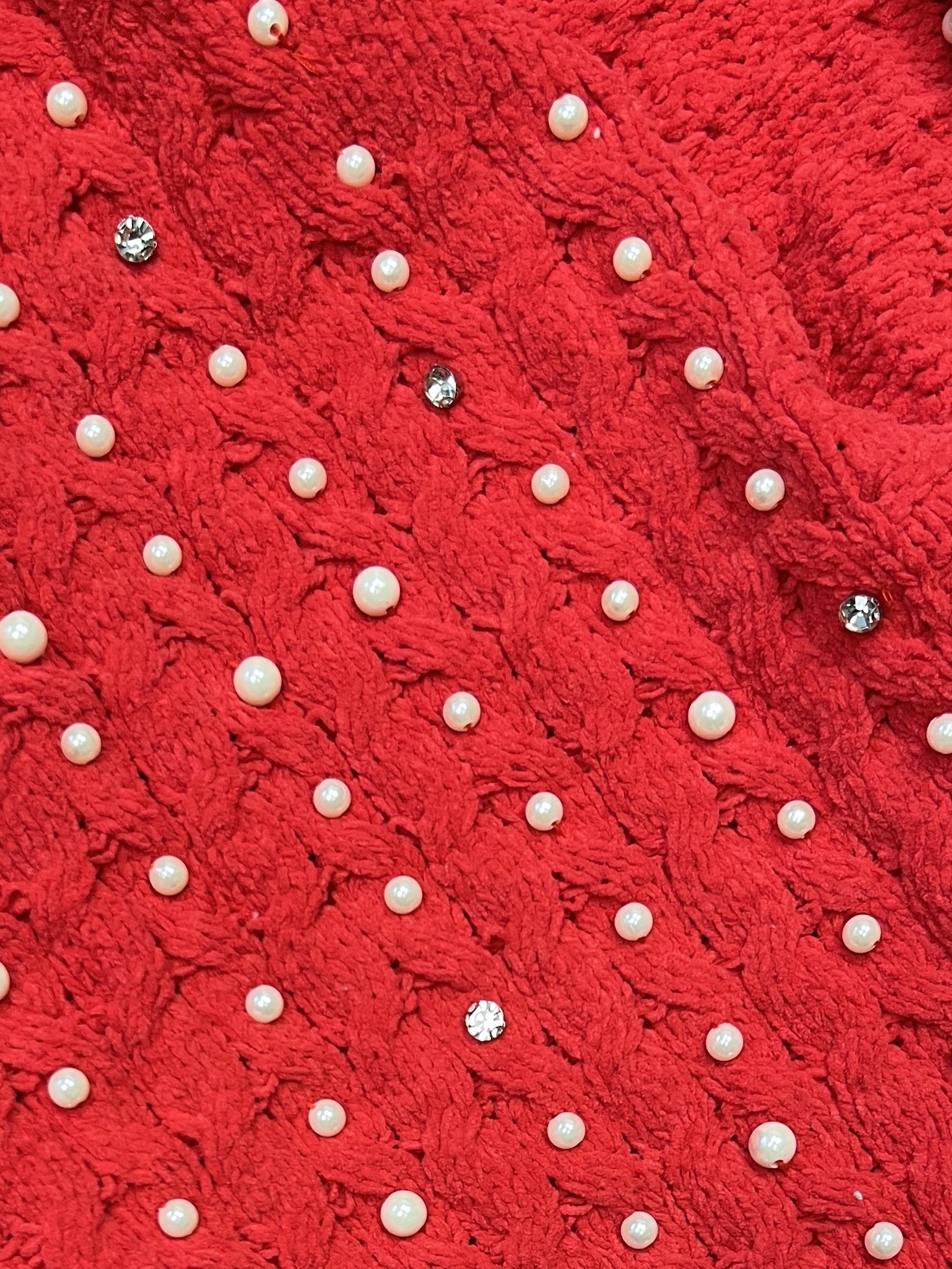 This cozy chenille cardigan brings a playful twist with its relaxed fit and charming pearl-detailed pointed pattern. Perfect for layering, it adds a touch of fun and softness to any outfit while keeping you comfy all day long.