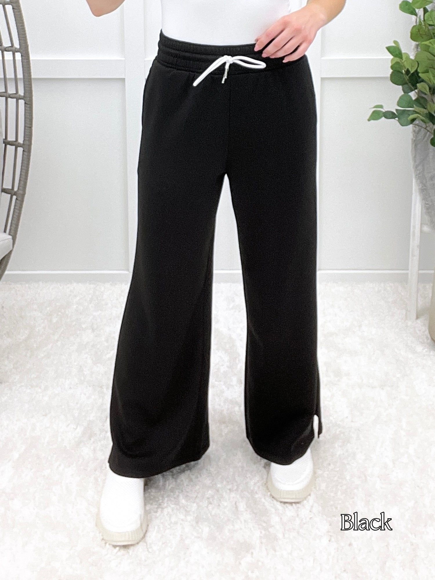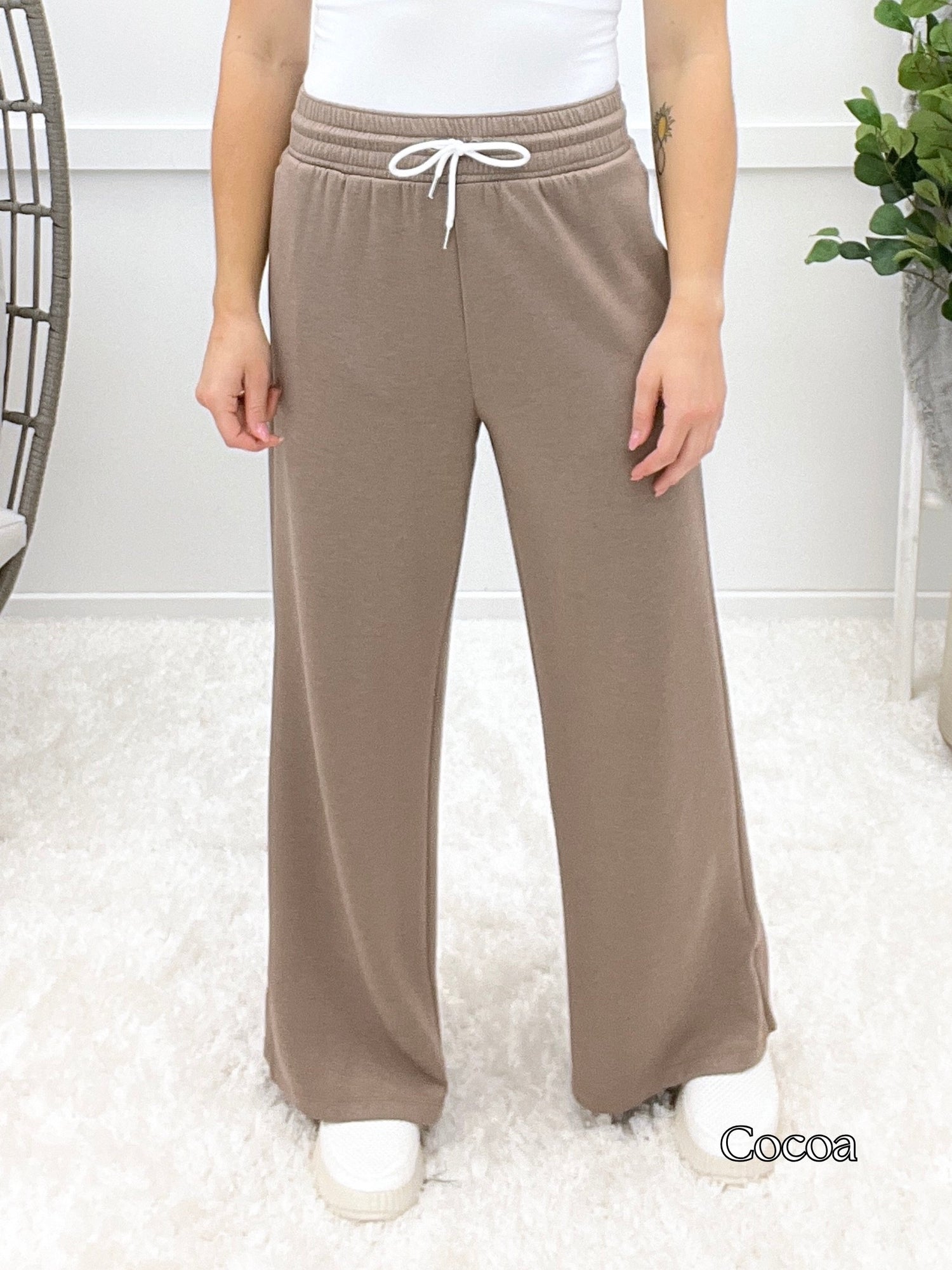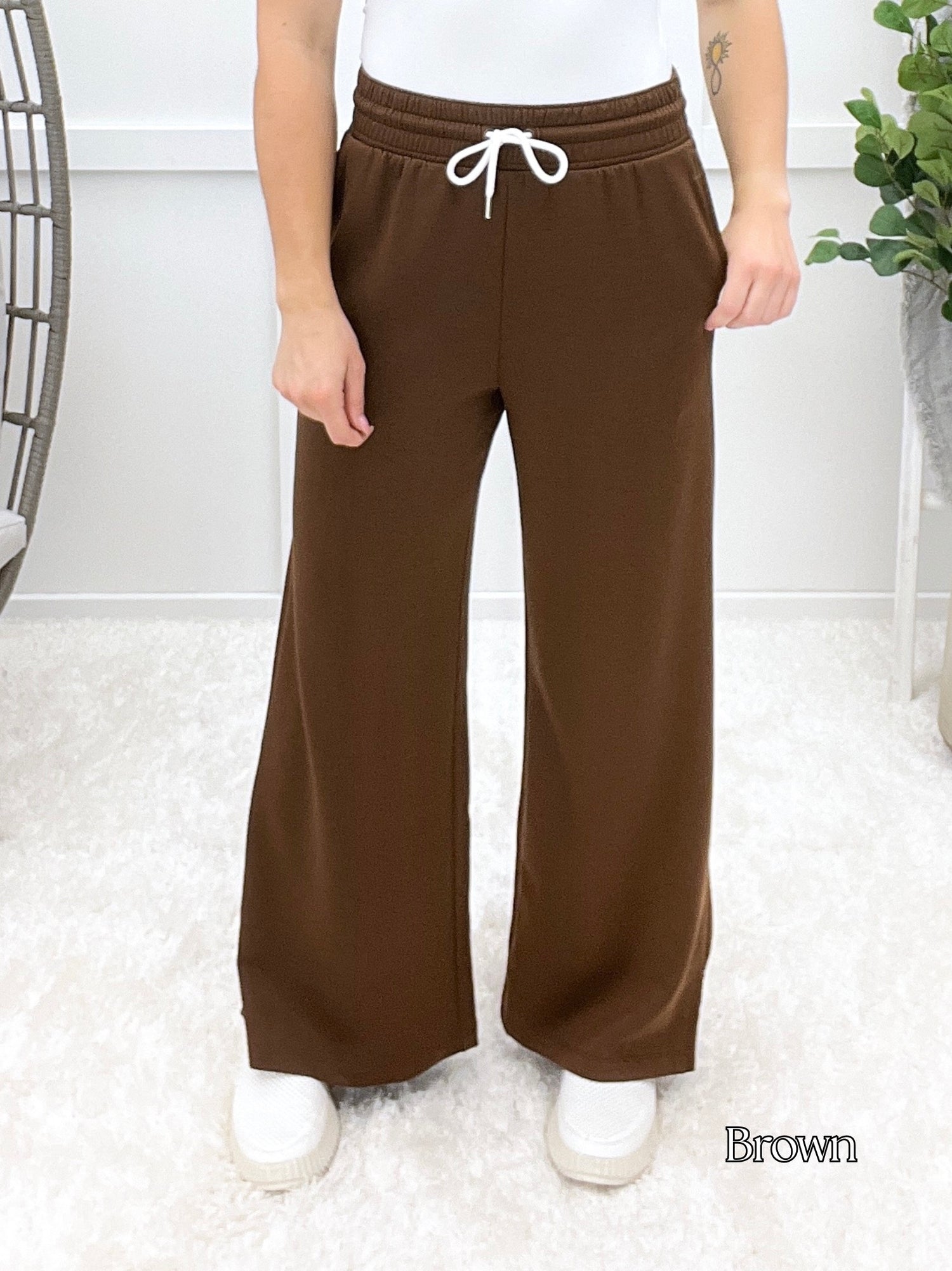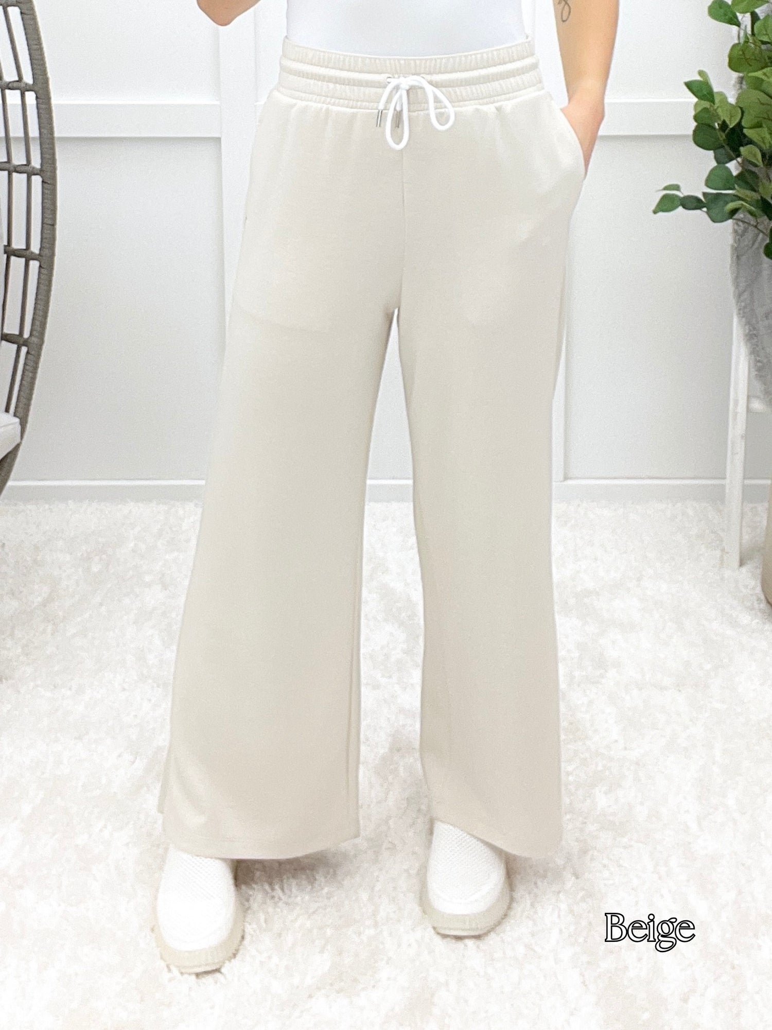 These scuba drawstring pants serve up sleek comfort with a relaxed fit, stretchy waistband, and handy pockets. Whether you're lounging at home or heading out for a casual coffee date, they're your new off-duty favorite. Pair them with a cropped hoodie or oversized tee for that effortless cool-girl vibe!