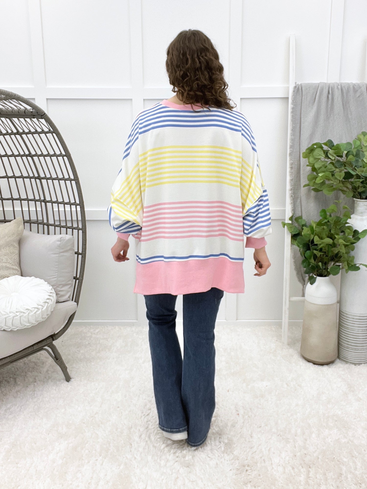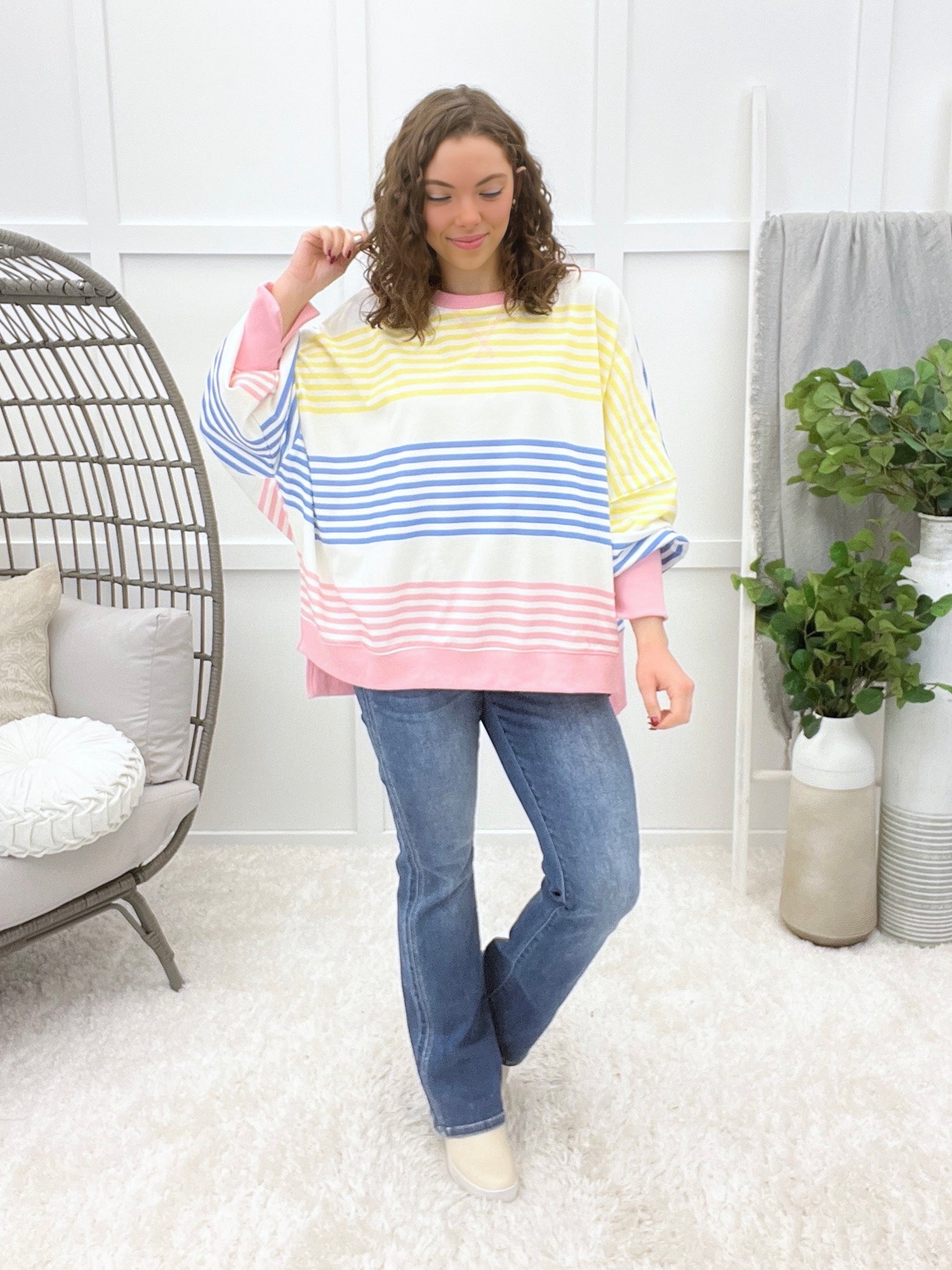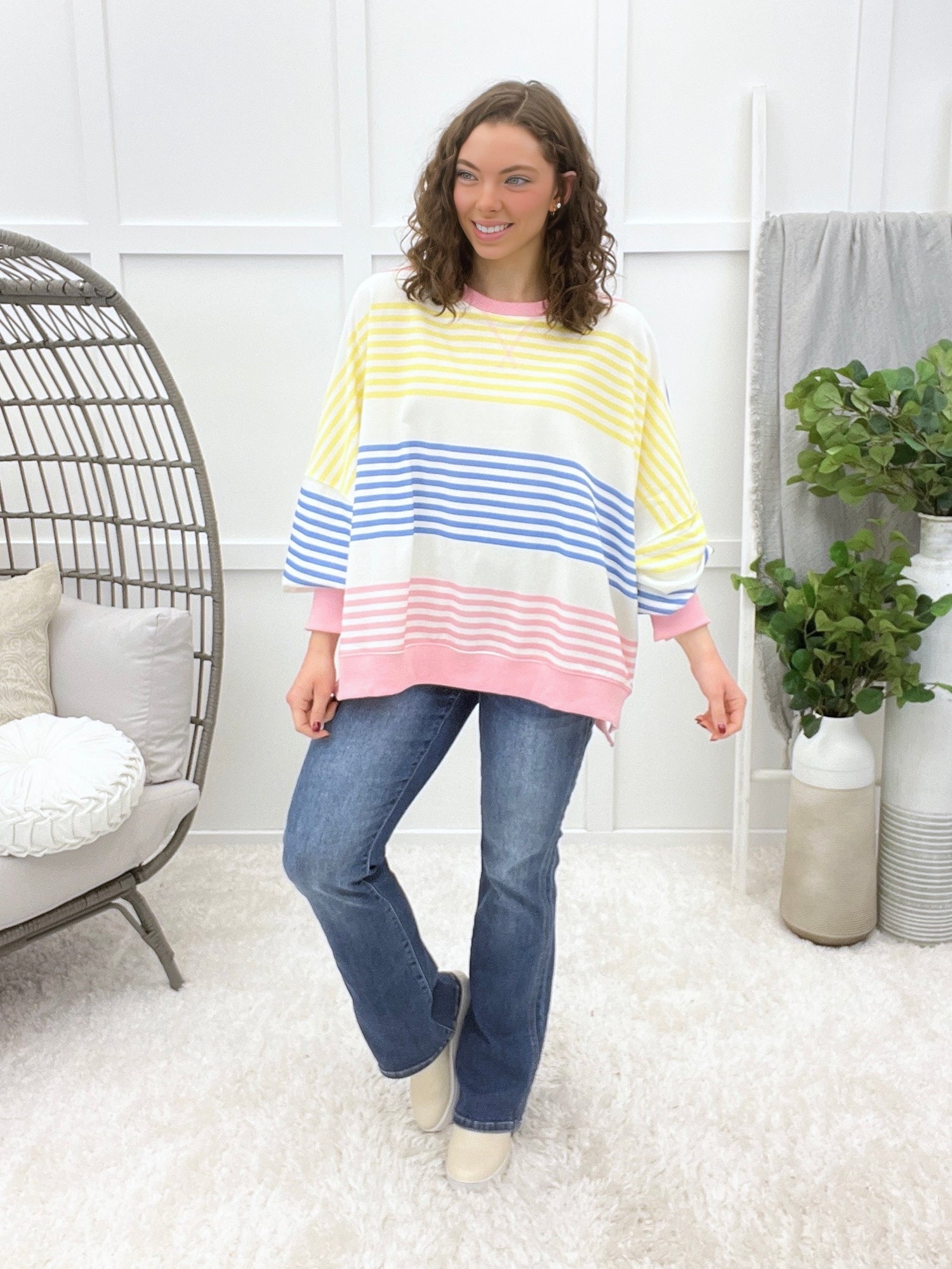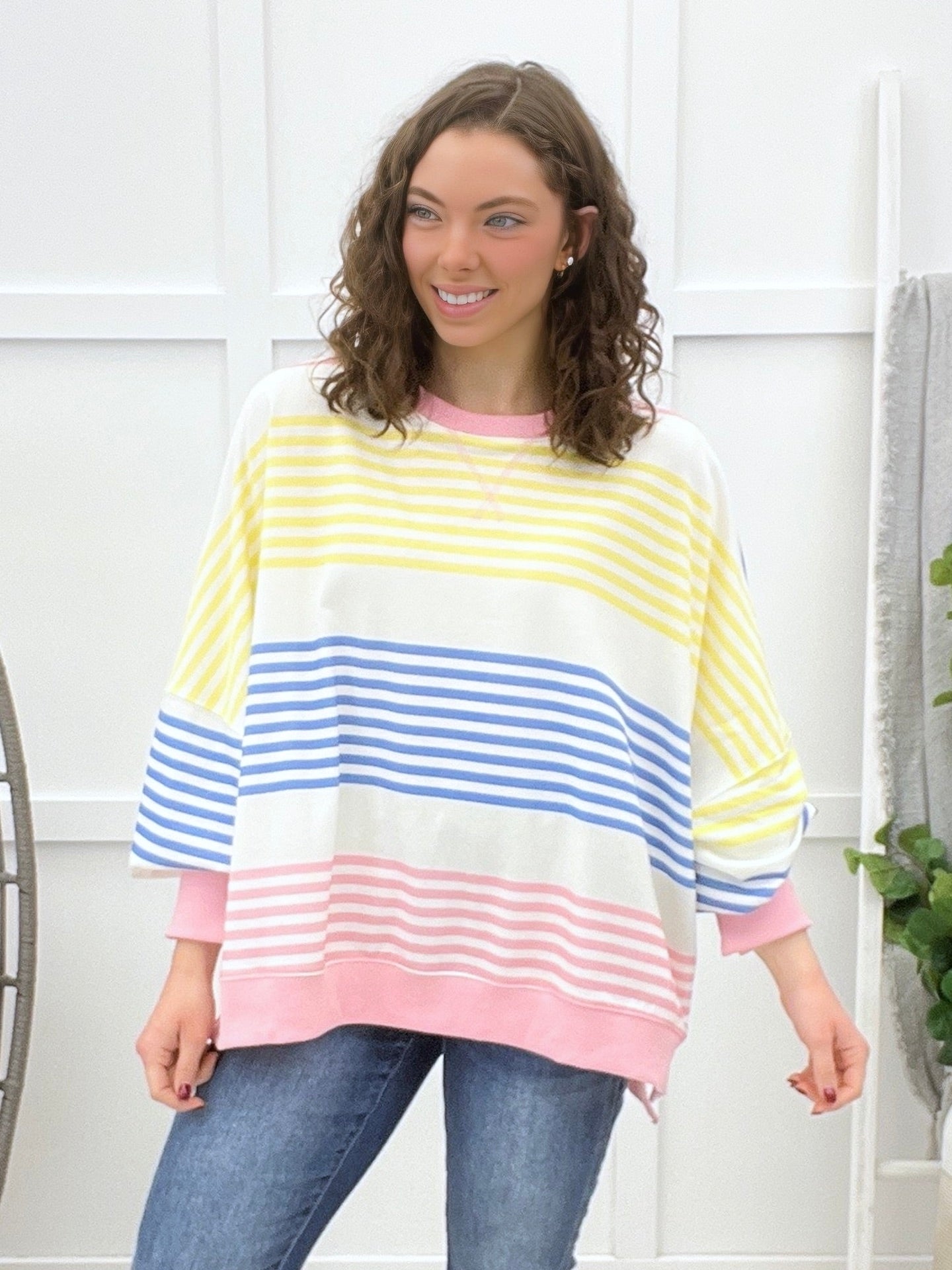 This cozy pullover offers an effortlessly relaxed fit, featuring a charming pattern of horizontal stripes that brings a cheerful, nautical vibe to your look. Crafted from soft French terry fabric, this top is the perfect lightweight piece for comfortable, everyday style and easy layering. For a weekend outing, try styling it with casual white jeans for a delightful afternoon at a seaside cafe.