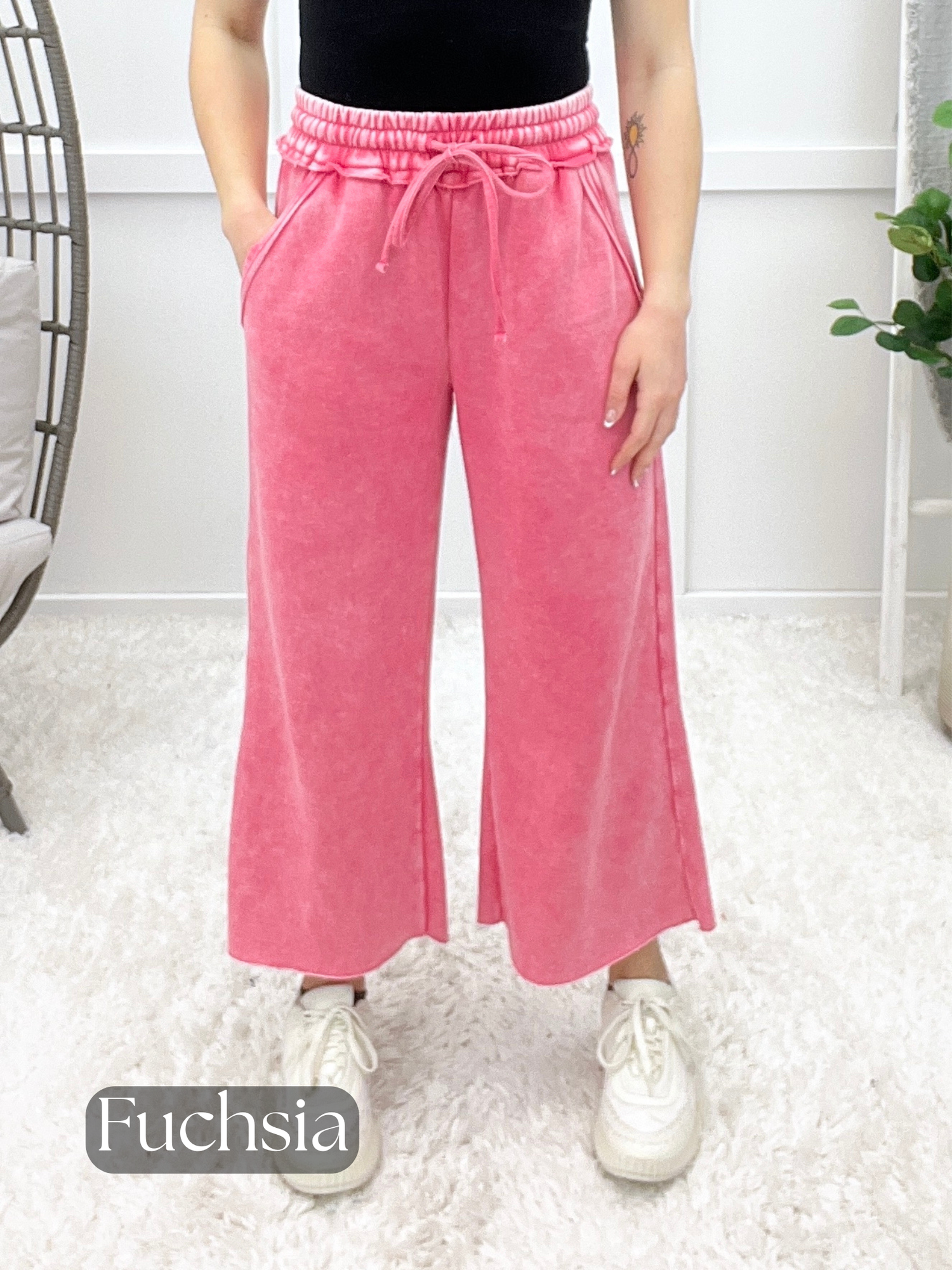 These fleece palazzo sweatpants feature a relaxed wide-leg silhouette with a comfortable drawstring waistband for easy all-day wear. Designed with pockets and a raw hem, they blend laid-back comfort with effortless style. Pair them with a casual tee and slides for lounging, travel days, or casual errands.