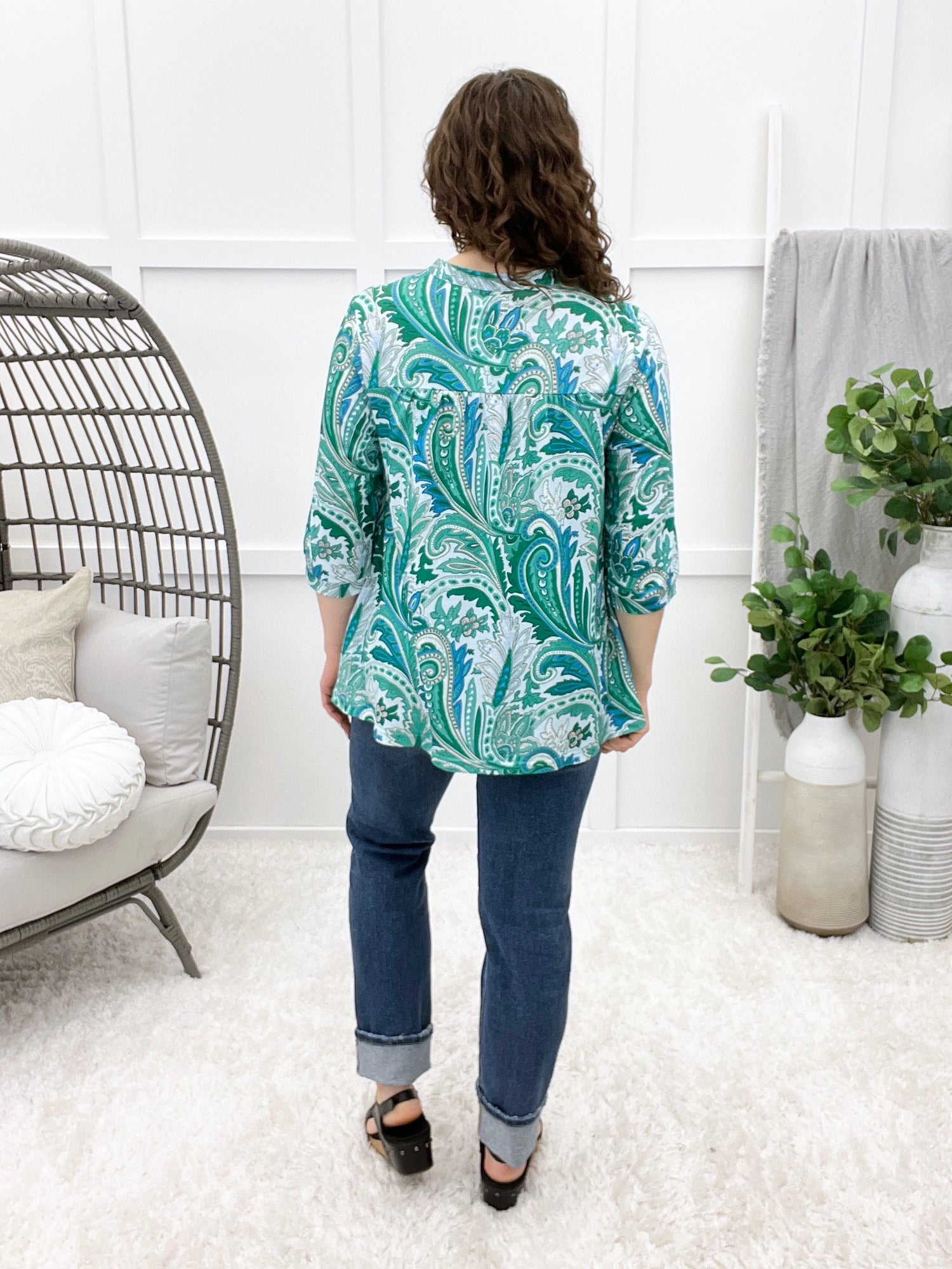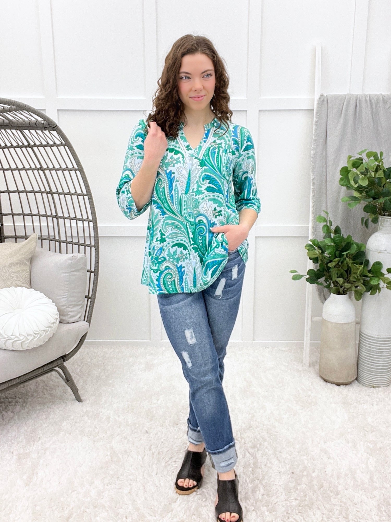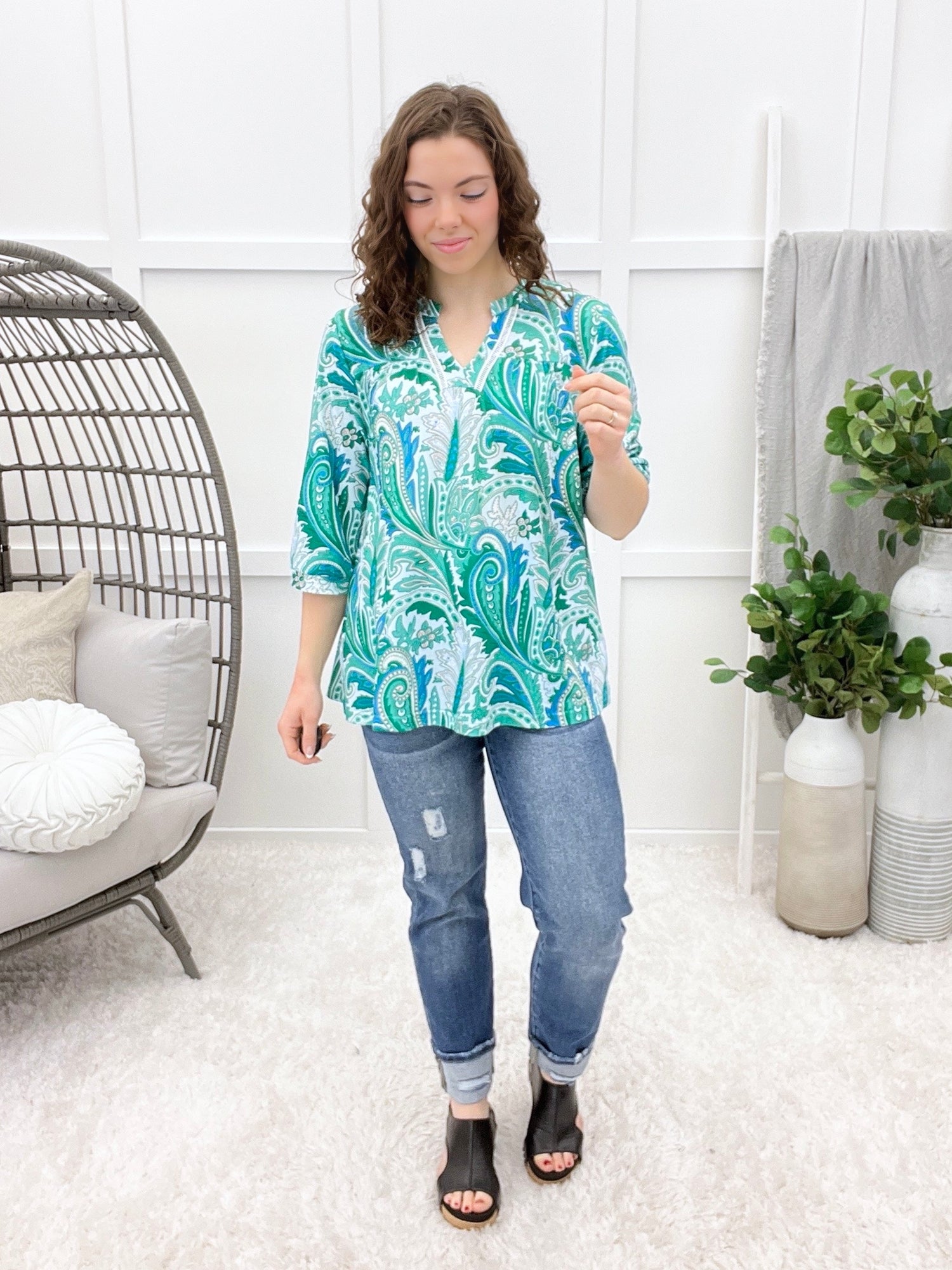 This is that easygoing, feel-good top you’ll reach for on busy mornings and slow afternoons alike. The relaxed silhouette features breezy 3/4 sleeves, a soft paisley-inspired print, and delicate lace trim that adds just the right touch of charm. Made from a soft, breathable, comfortable fabric, it’s designed for all-day wear and is machine washable, so it’s as practical as it is pretty.