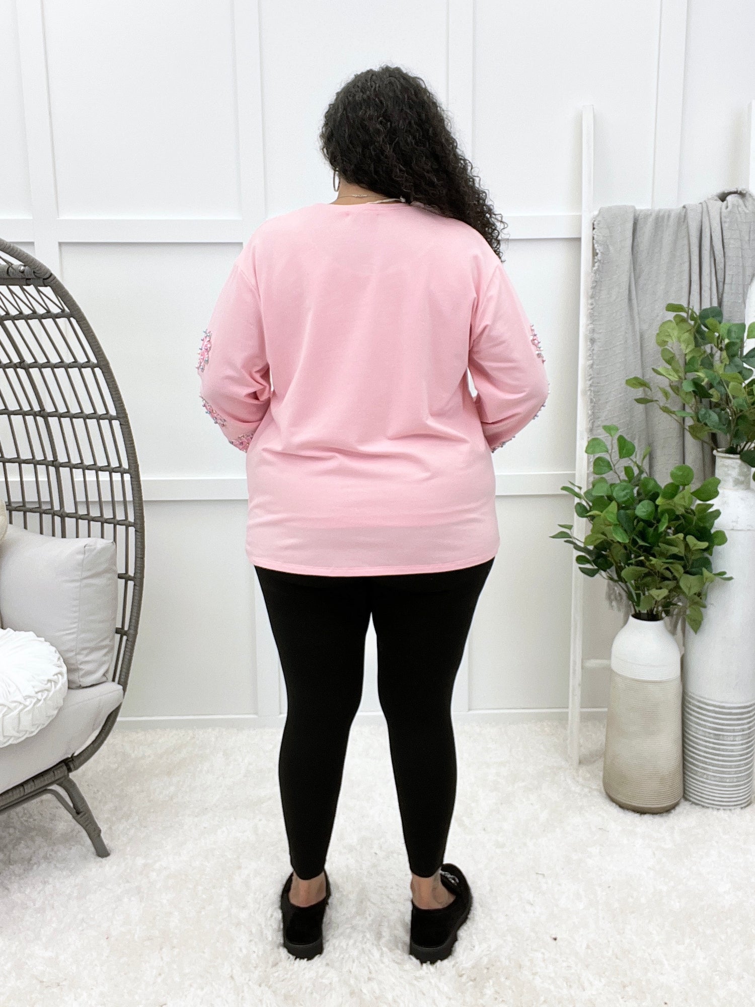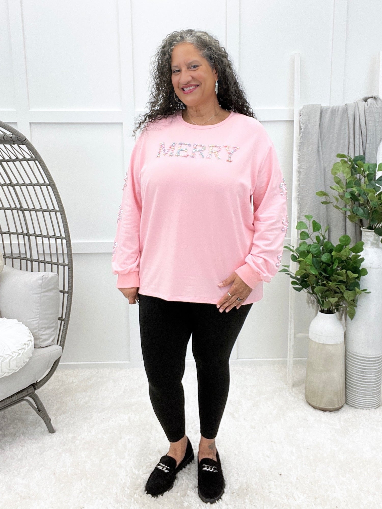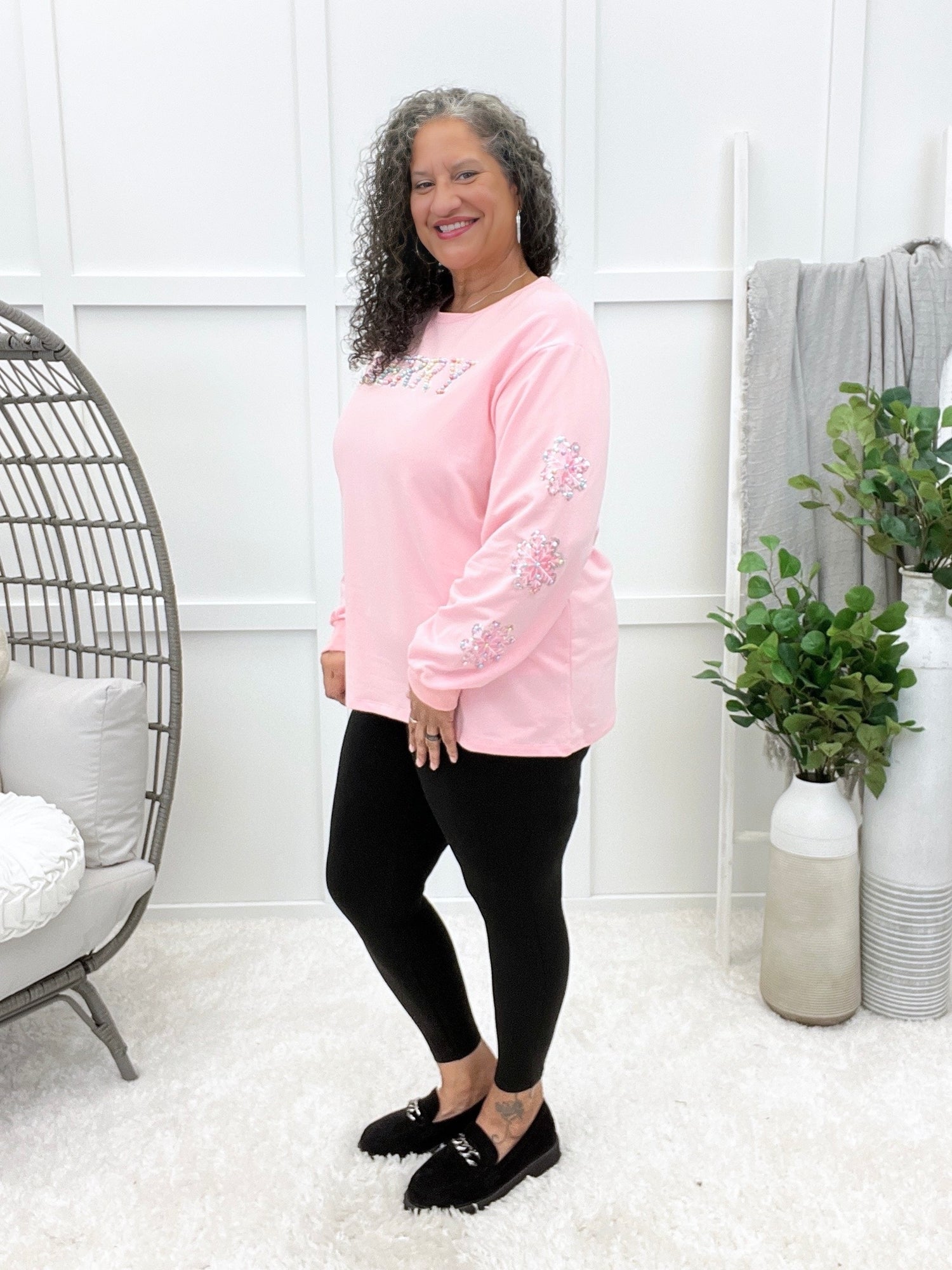 Add a touch of cozy sparkle to your winter wardrobe with this charming top. Crafted with a relaxed fit and soft stretch, it features a pearl-accented “Merry” design across the front and dainty snowflake patches on the sleeves. The perfect mix of comfort and festive flair, it’s a must-have for the holiday season.