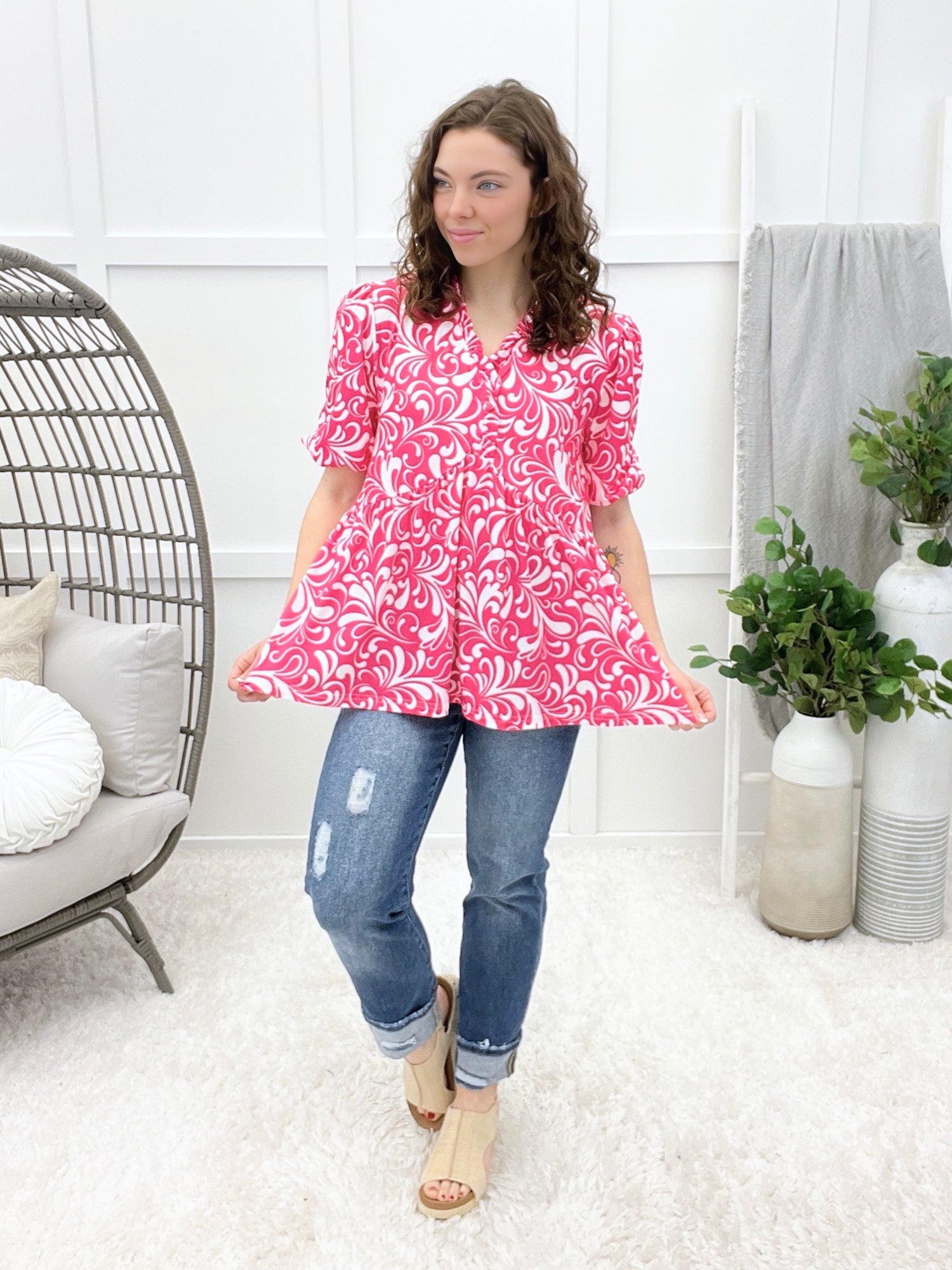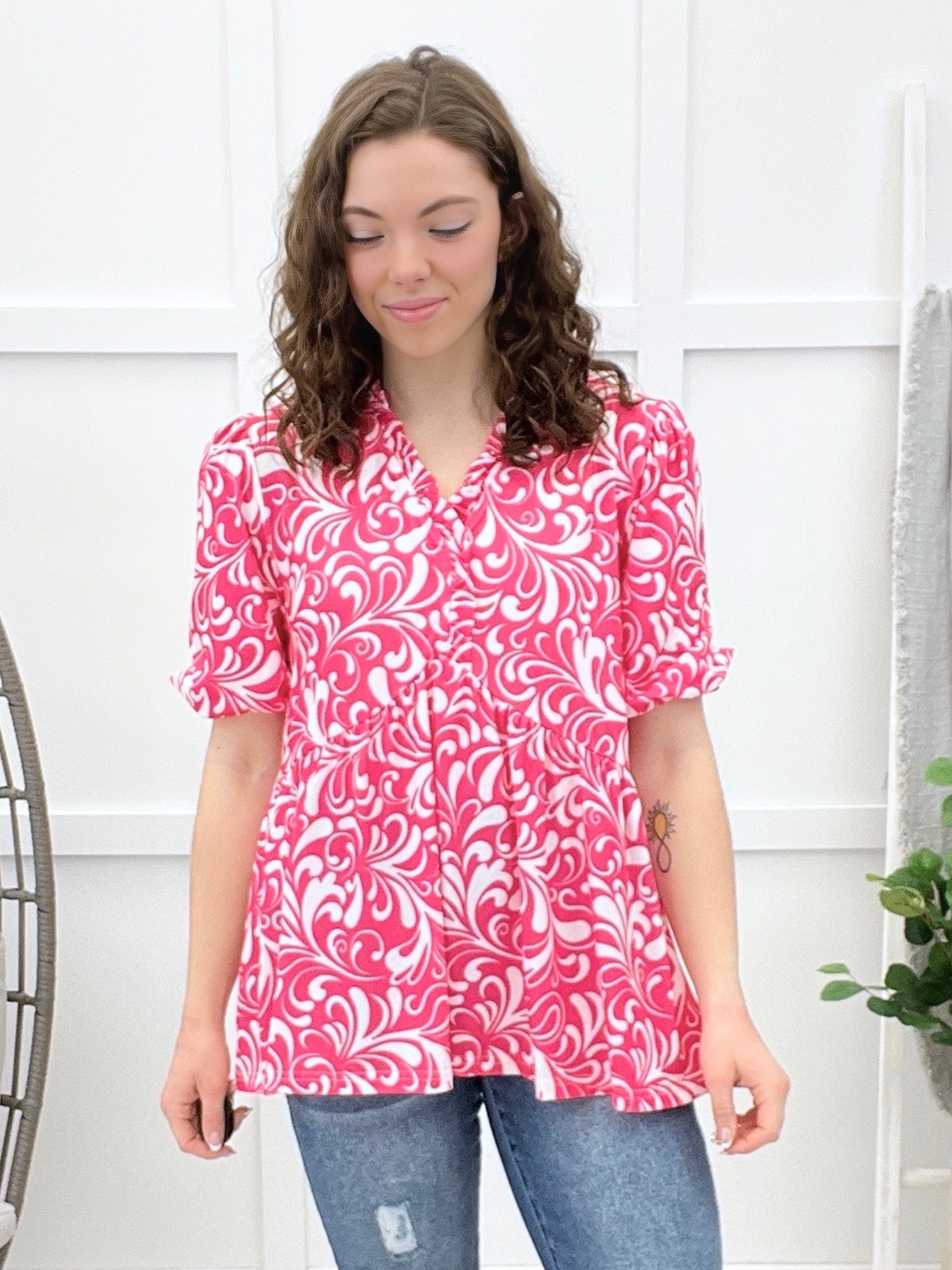 Add a pop of cheerful charm to your day with this top, a feel-good favorite that’s equal parts sweet and easygoing. The paisley floral print brings a playful vibe, while the puff short sleeves and babydoll silhouette create a flattering, floaty fit that’s perfect for everyday wear. It’s the kind of top that instantly brightens your outfit and your mood.