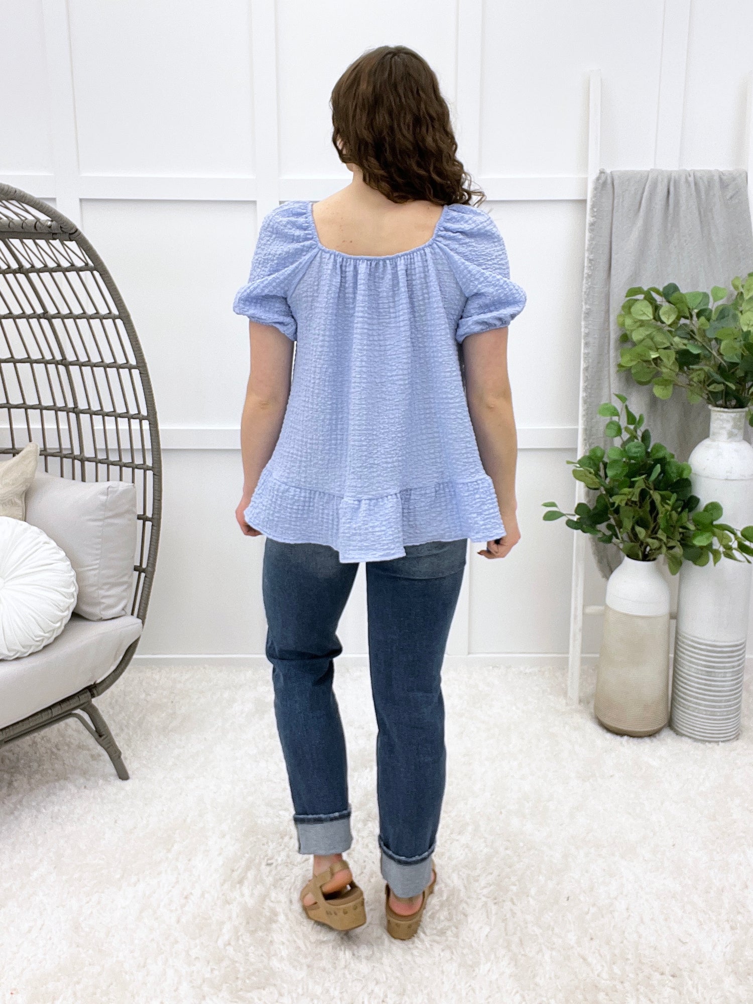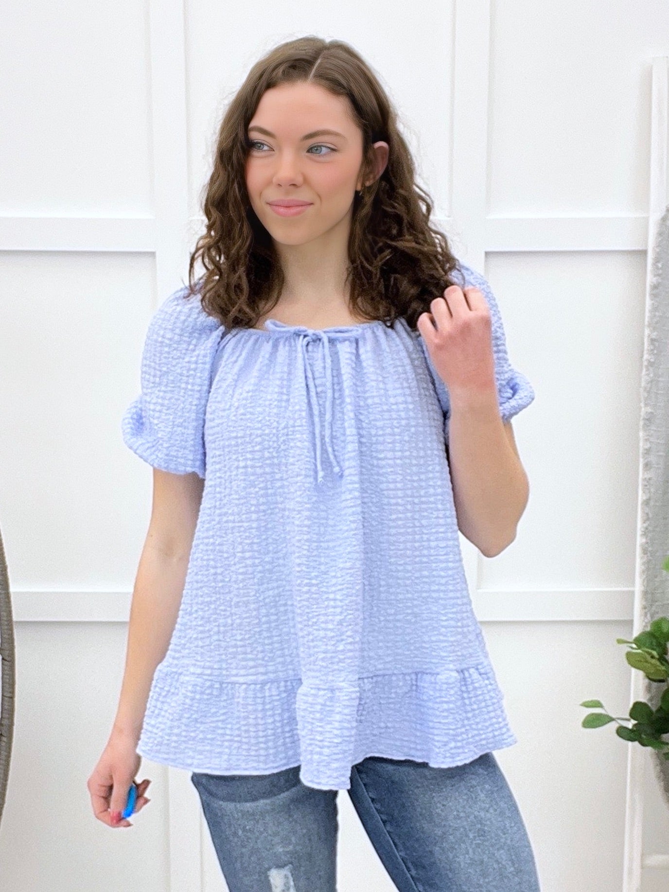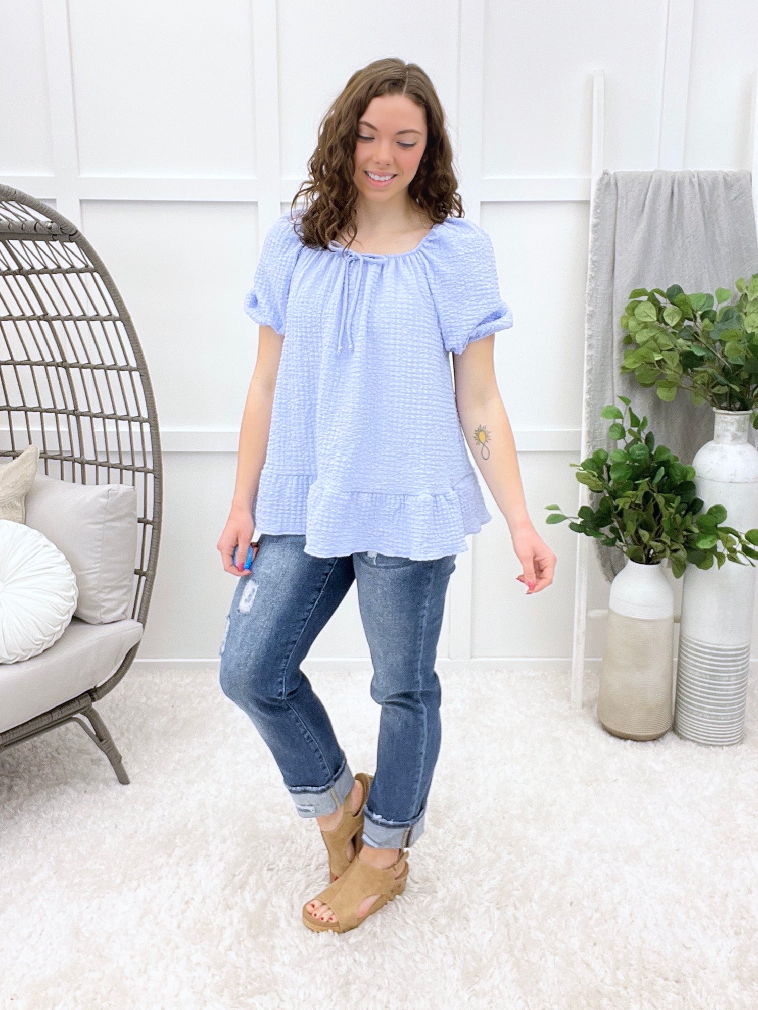 Sweet and feminine with just the right amount of charm, this textured knit top is an instant favorite. The puff sleeves, square neckline, and front tie add a flattering touch, while the ruffle hem keeps it playful. Perfect for brunch, date nights, or casual outings paired with denim or skirts.