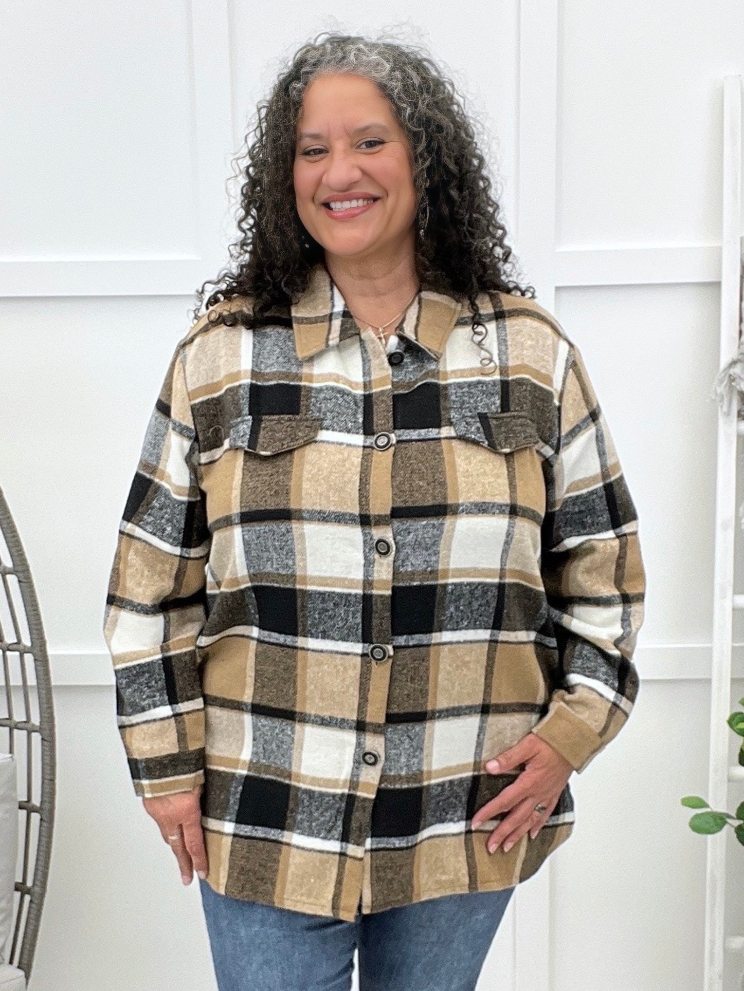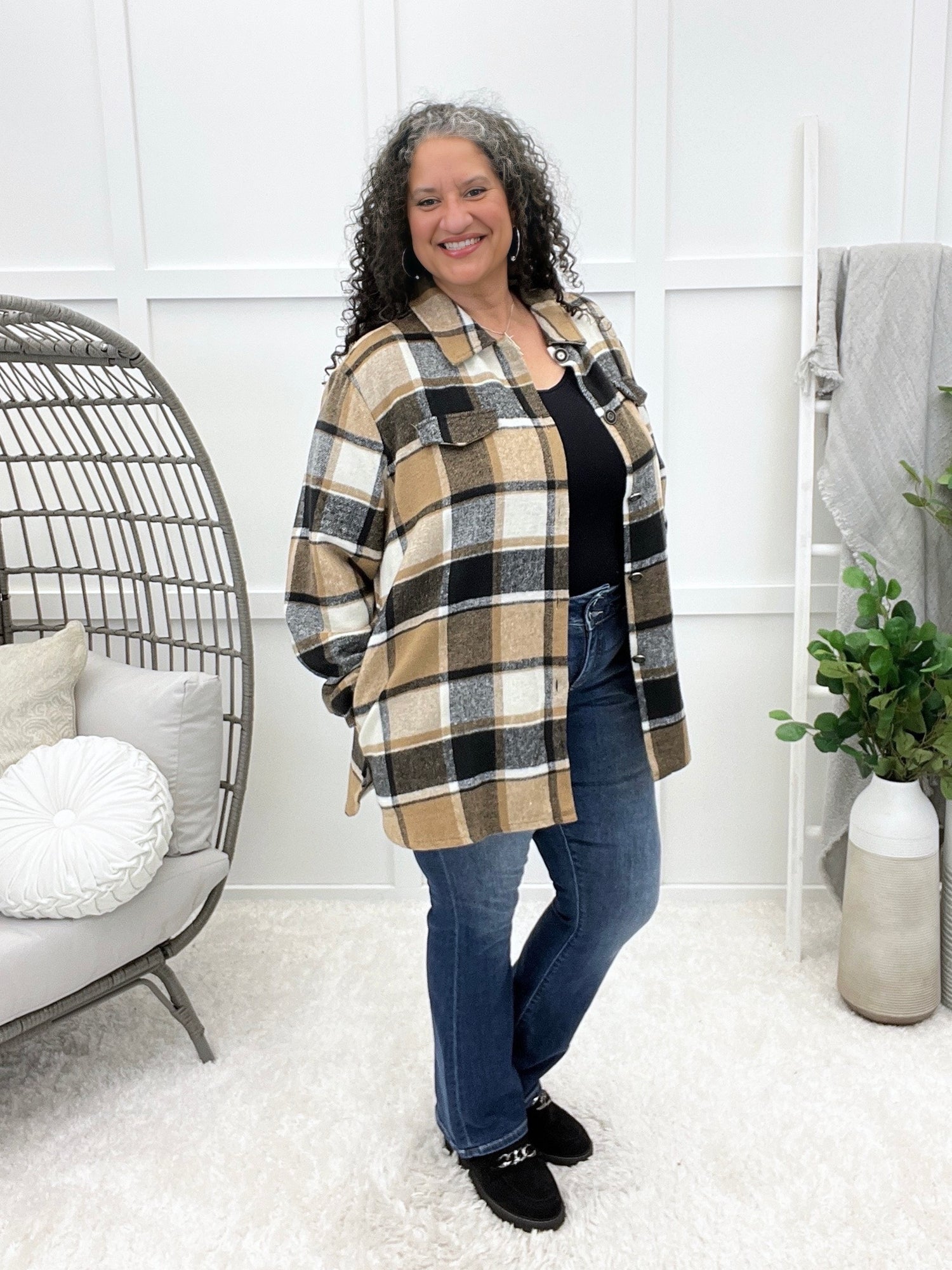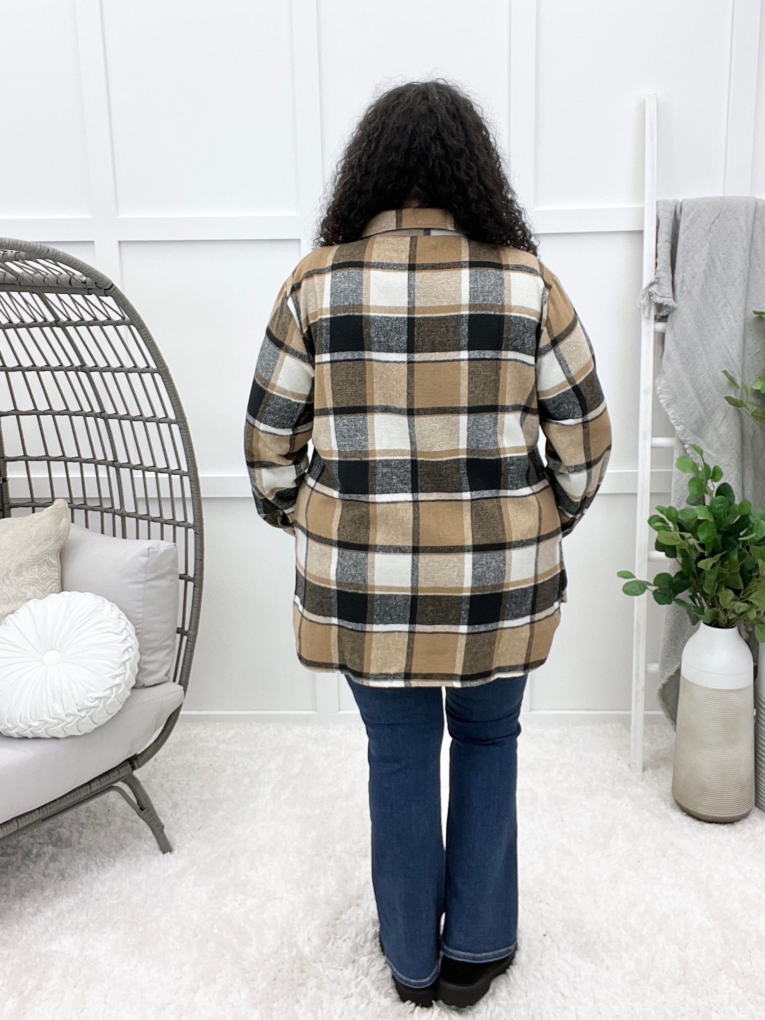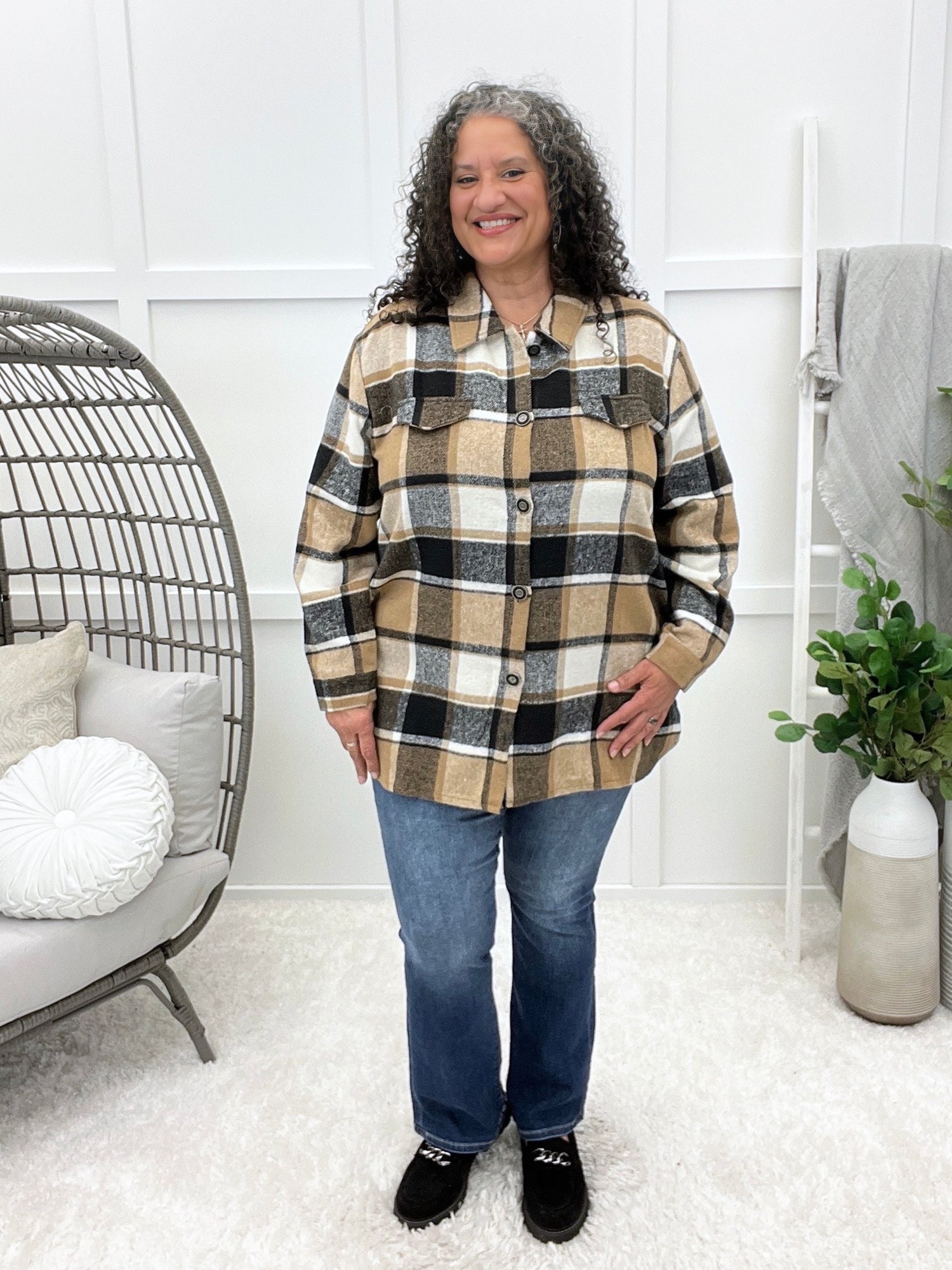 The Pull Me Close Shacket is the perfect outerwear piece, blending the structure of a shirt with the warmth of a jacket. It features a classic plaid pattern and a functional button front closure for easy layering. Complete with convenient pockets, this shacket is a stylish and versatile essential for cooler weather.