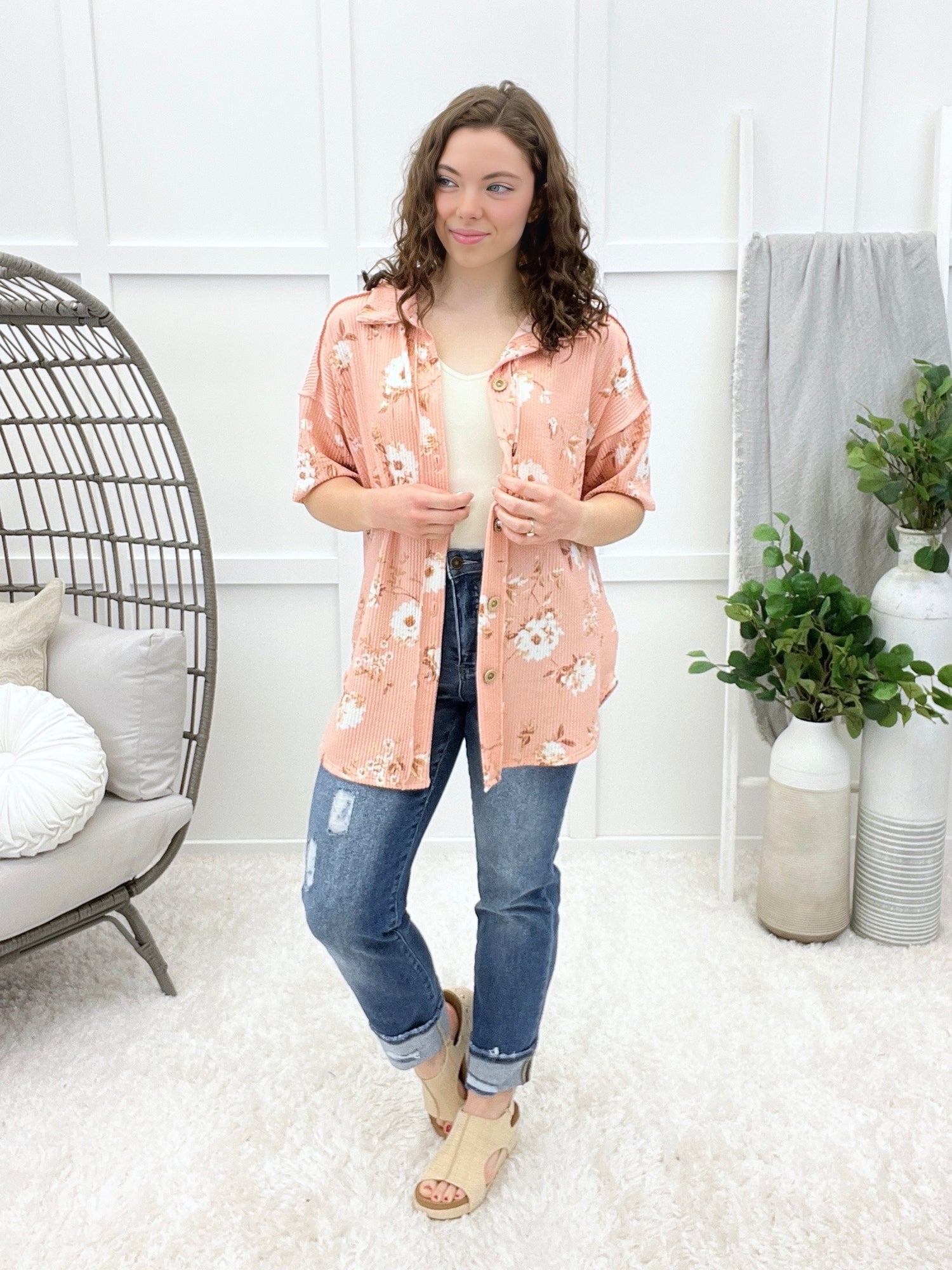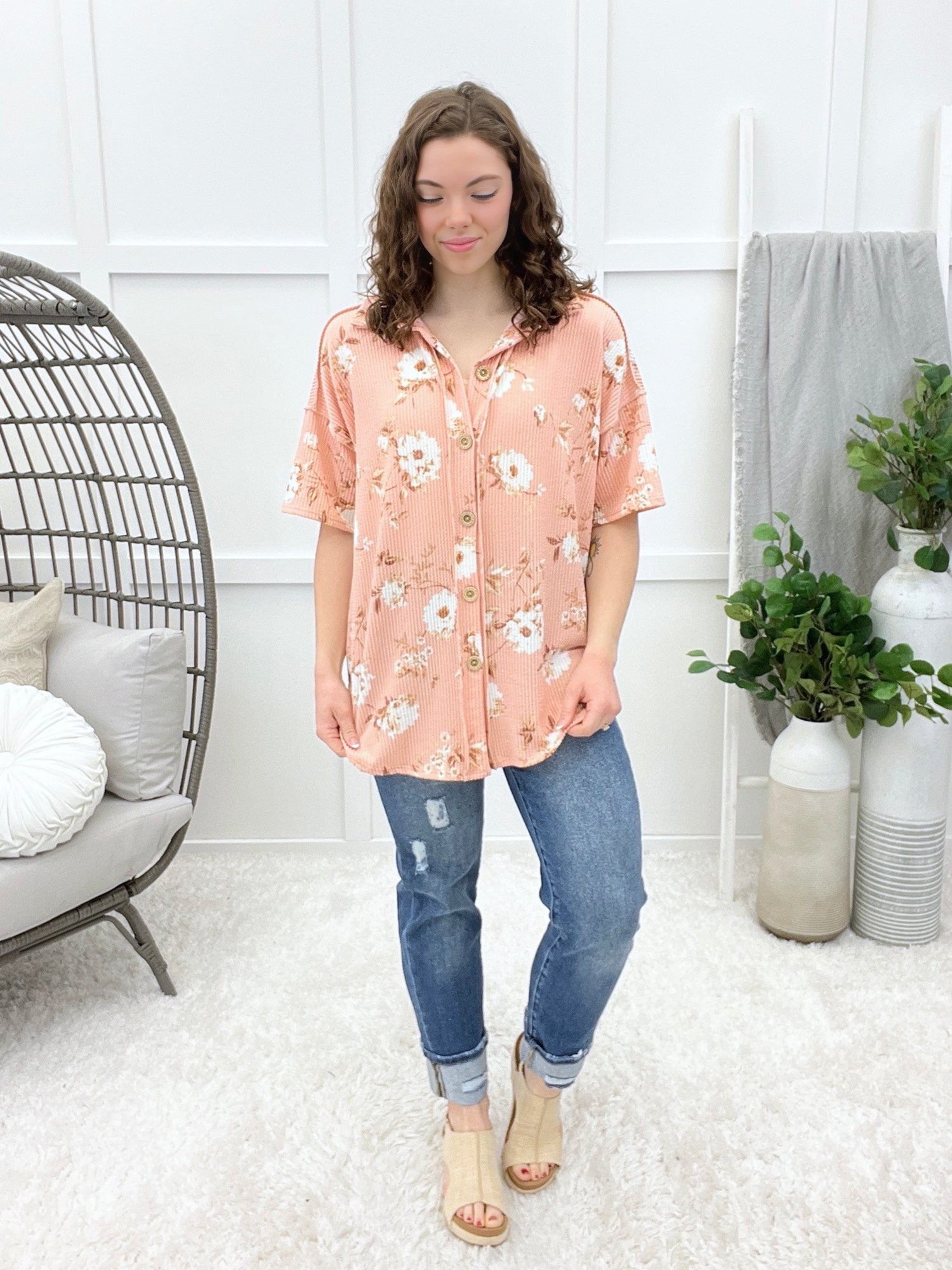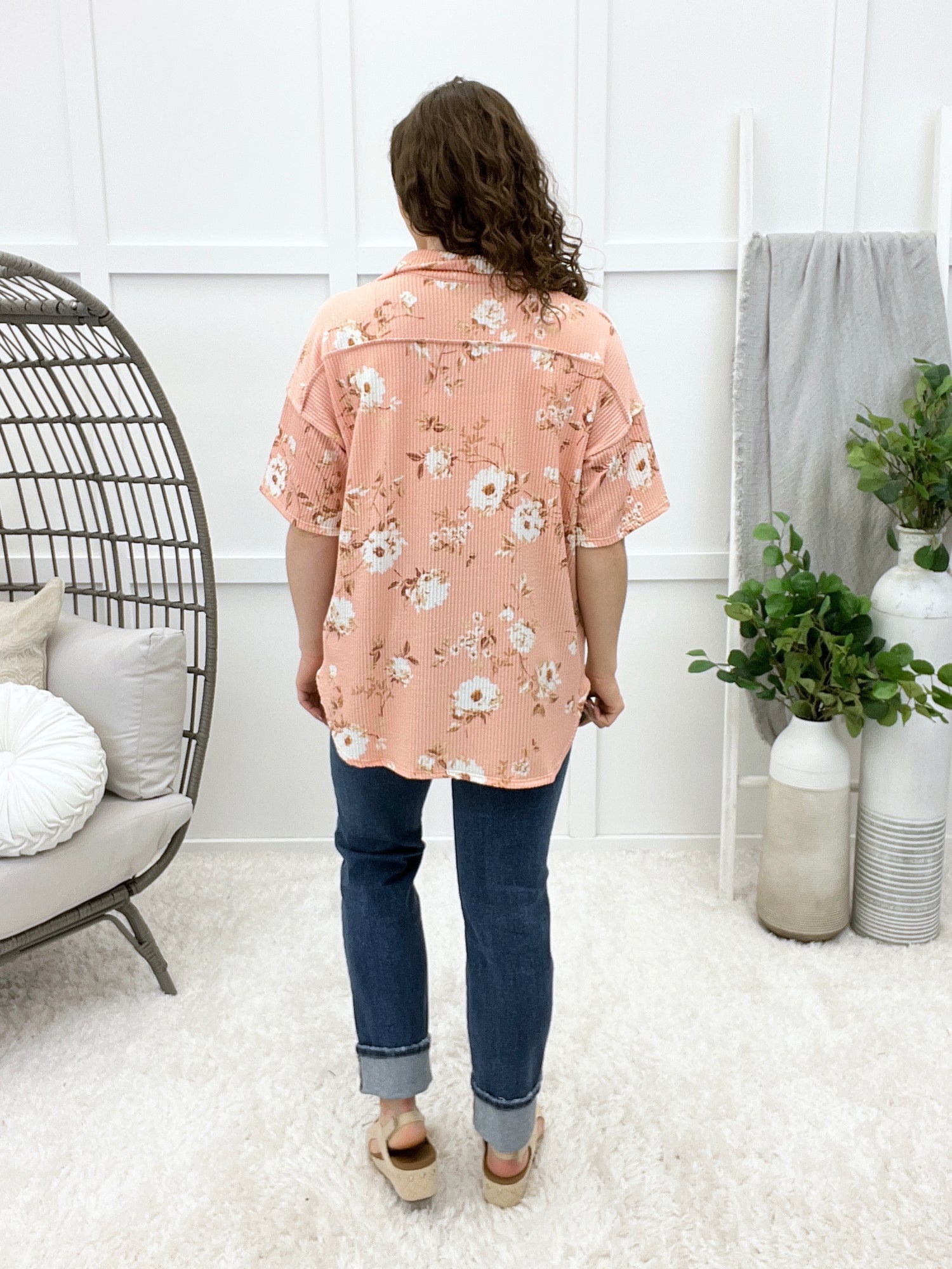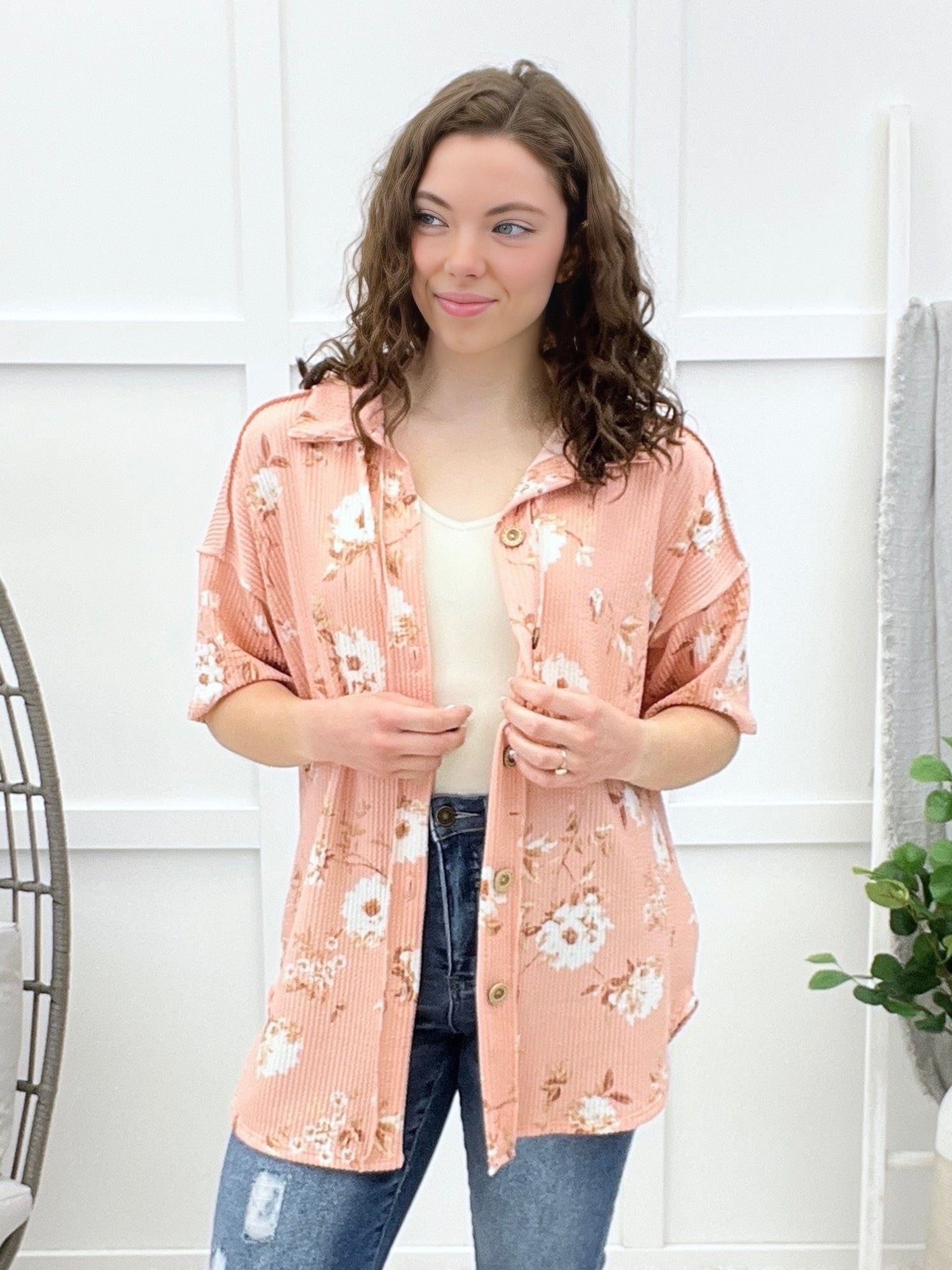 This short-sleeve button-down top features a classic collar, floral pattern, and front pocket detail for an easy everyday look. Designed in a ribbed fabric with a relaxed feel, it blends comfort with casual charm. Pair it with denim and casual shoes for weekend errands, lunch dates, or laid-back outings.