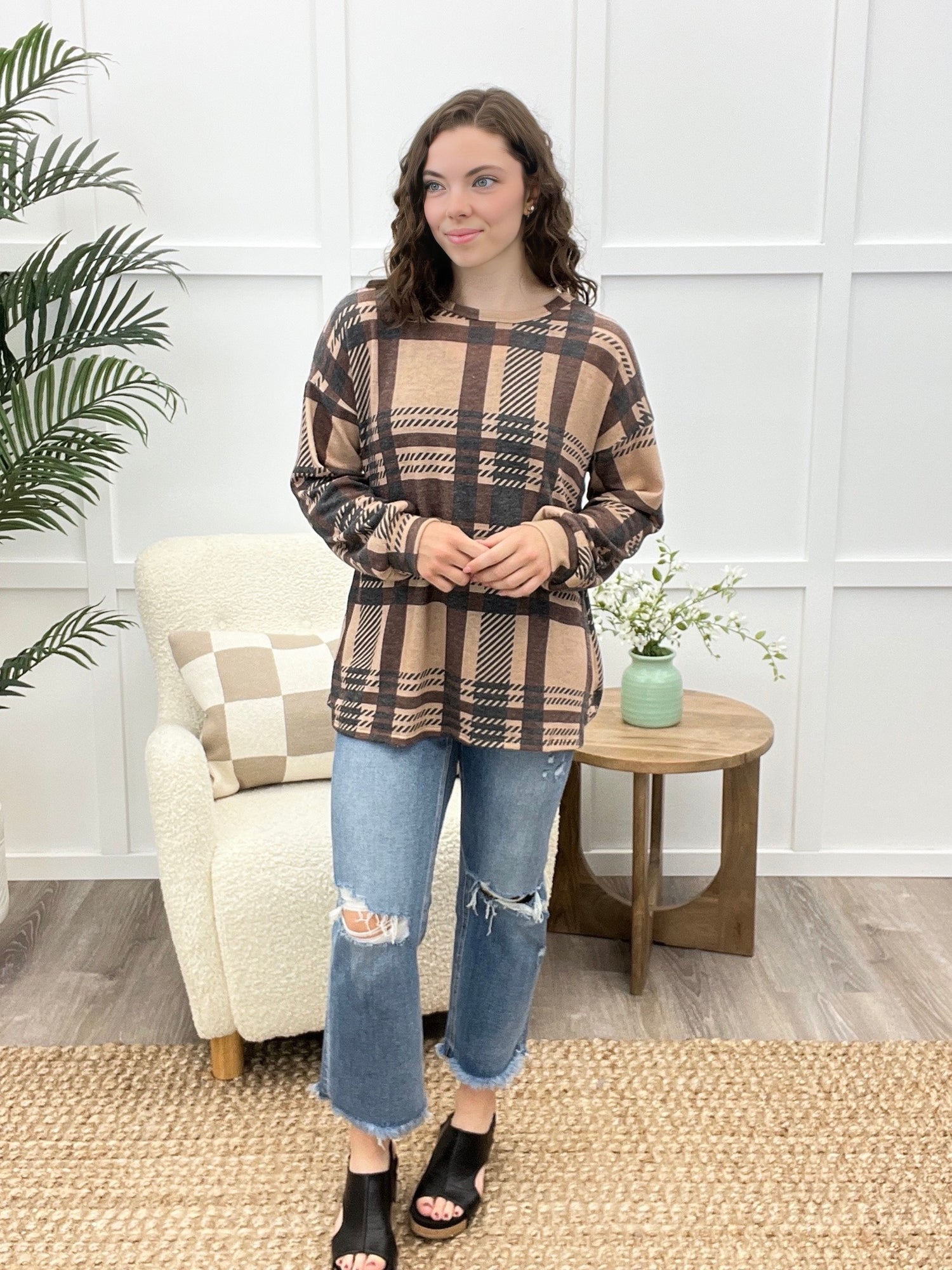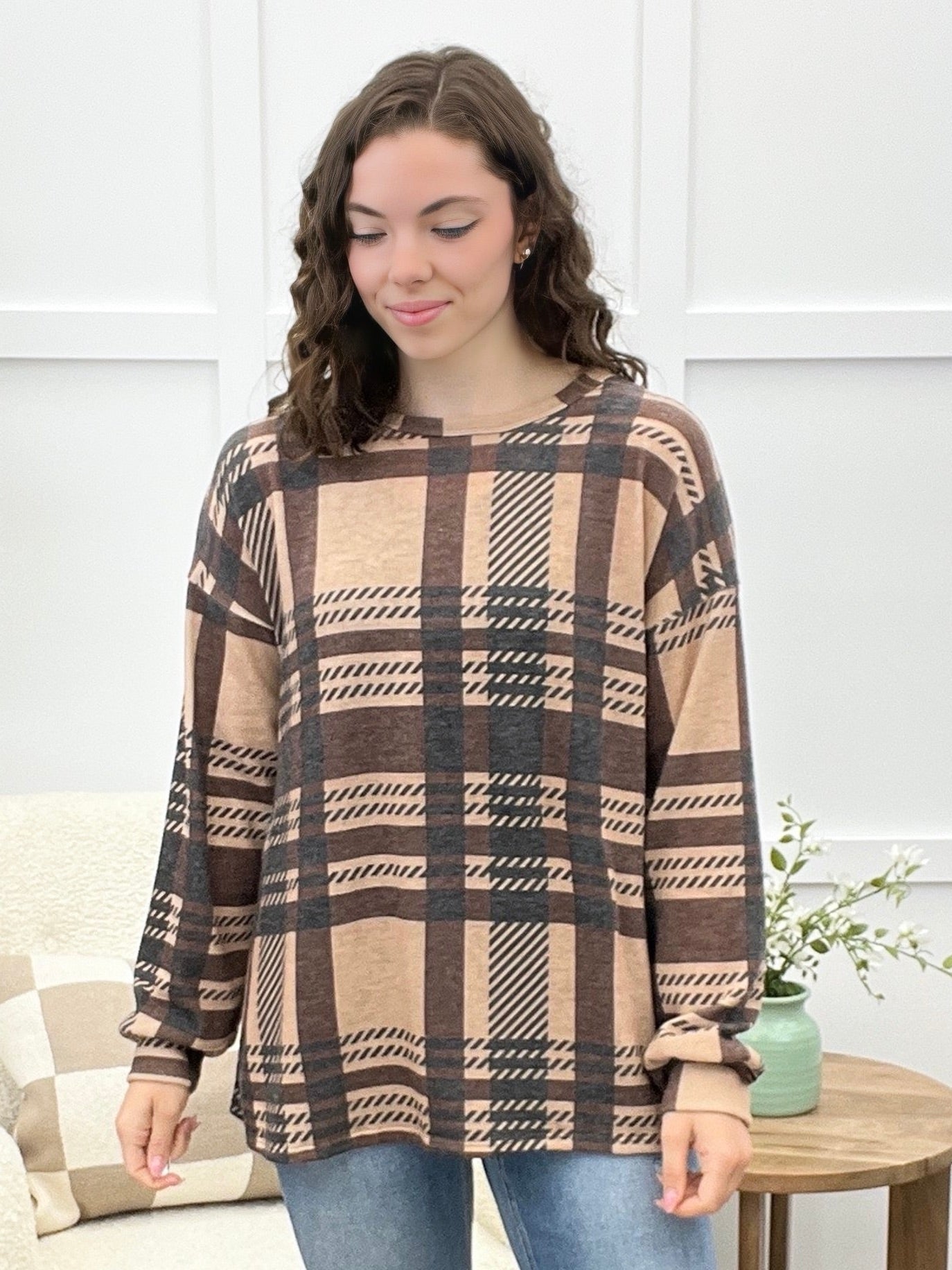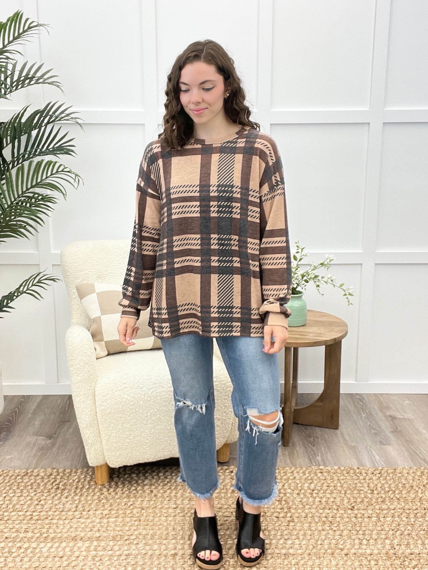 Long puff sleeves, a round neck, and a bold plaid print make this top your cozy-season essential with a stylish twist. Its relaxed fit pairs perfectly with skinny jeans, ankle boots, and a chunky scarf for a comfy yet pulled-together look. Whether you're heading to brunch or curling up with a latte, this top brings the charm.
