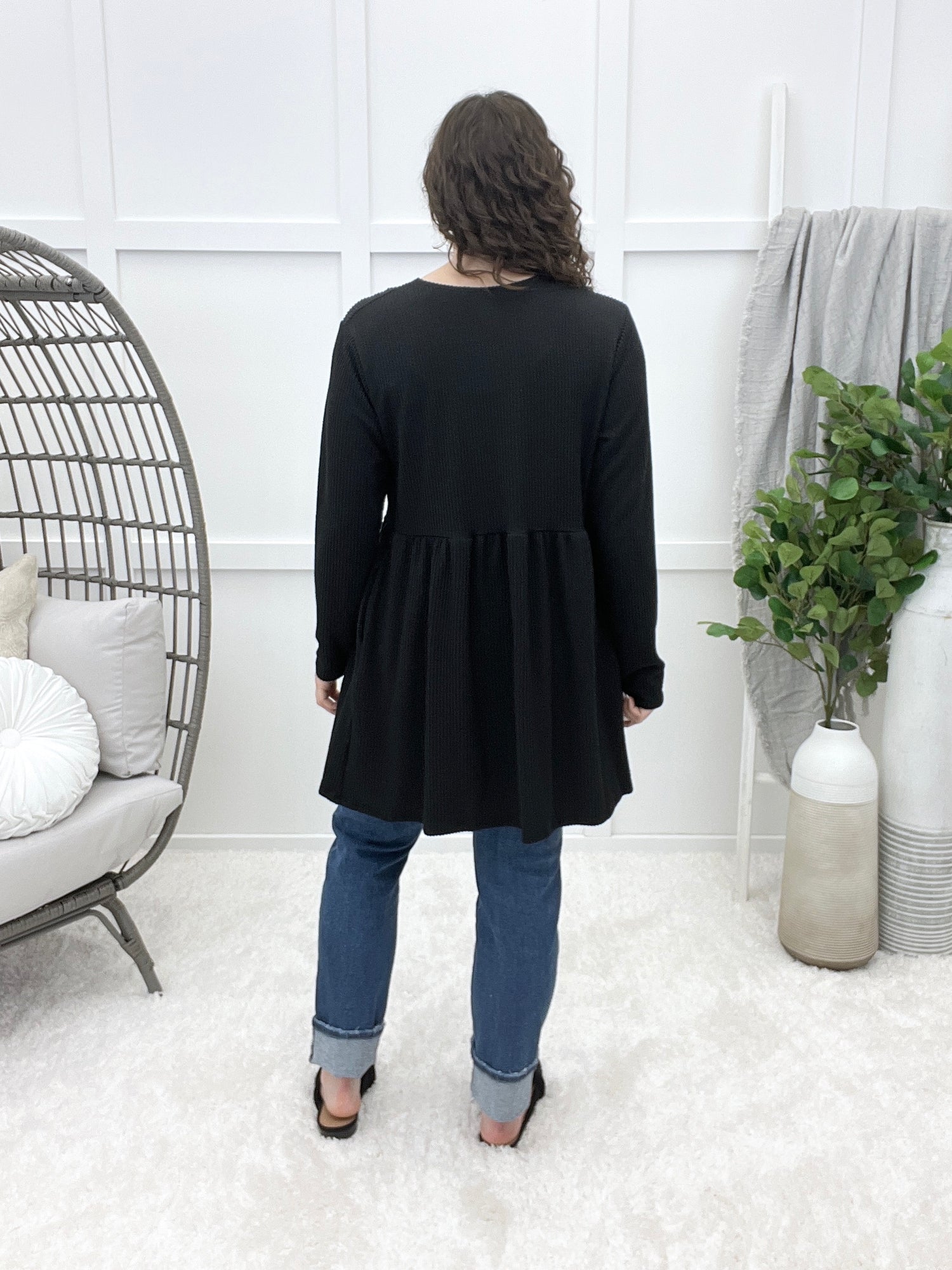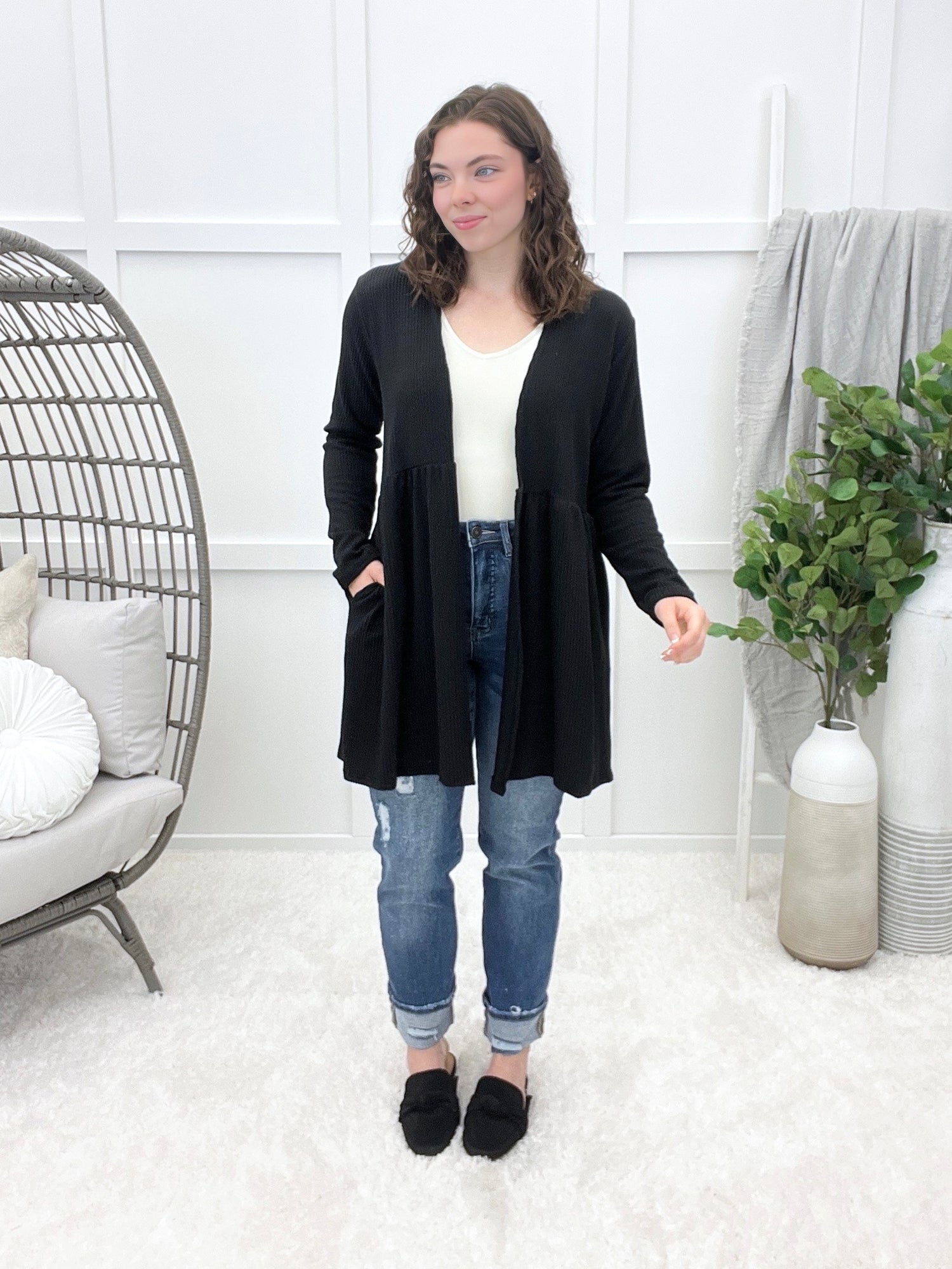Meet your new layering BFF—this long sleeve urban ribbed cardigan brings cozy vibes with a playful twist thanks to its ruffled open front and handy side pockets. Toss it over a turtleneck and high-waisted jeans for a coffee date or layer it with a midi dress and boots for a stroll through town. Whether you're running errands or heading to brunch, this cardi adds the perfect touch of texture and warmth to your everyday look.