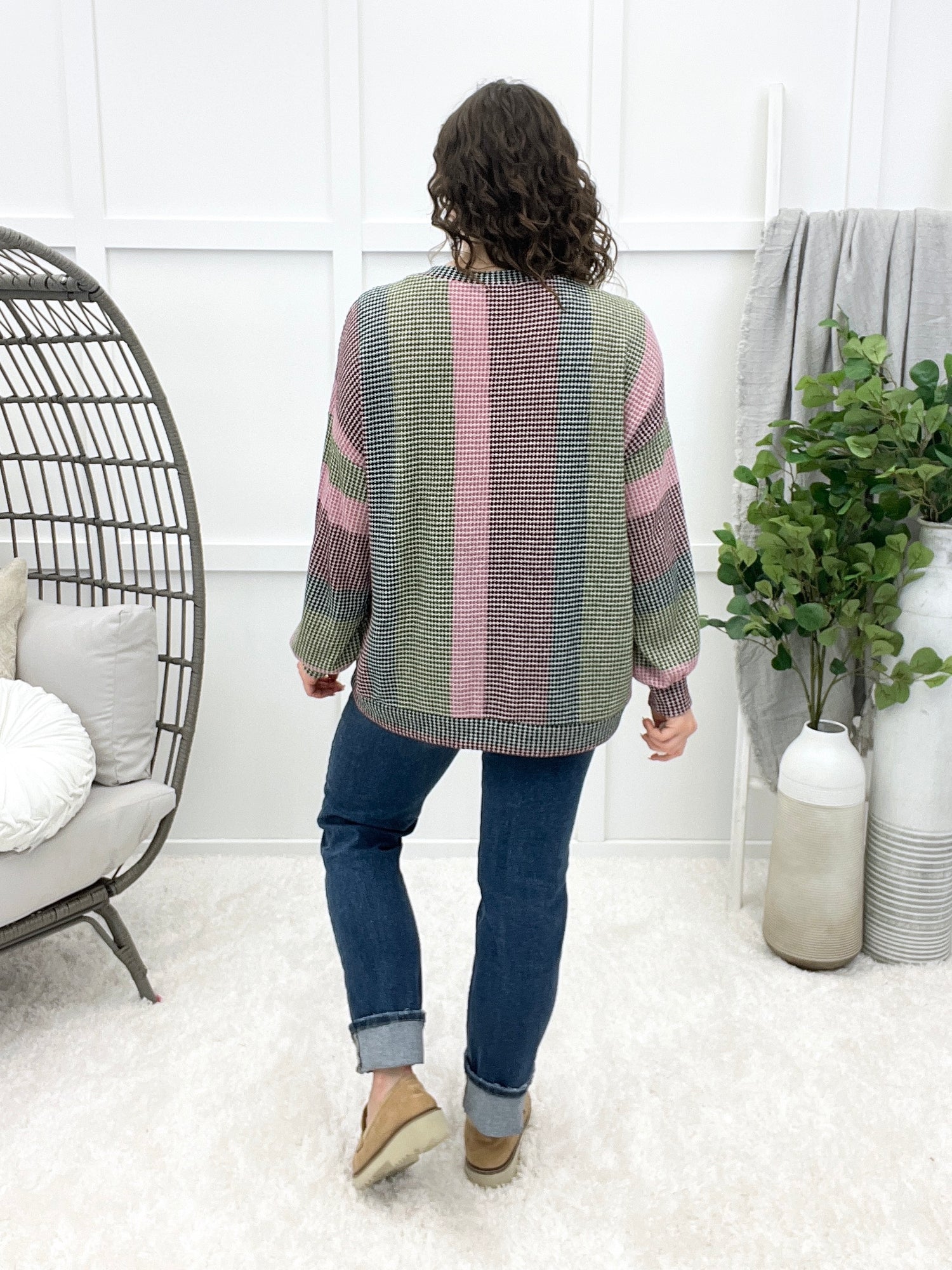 Classic with a playful twist. This cozy round neck sweater features a textured waffle knit and vibrant multi-color stripes, bringing a modern flair to your wardrobe. The oversized loose fit and soft knit create effortless comfort, perfect for a casual coffee run or a breezy evening stroll, making “just threw it on” look effortlessly stylish.