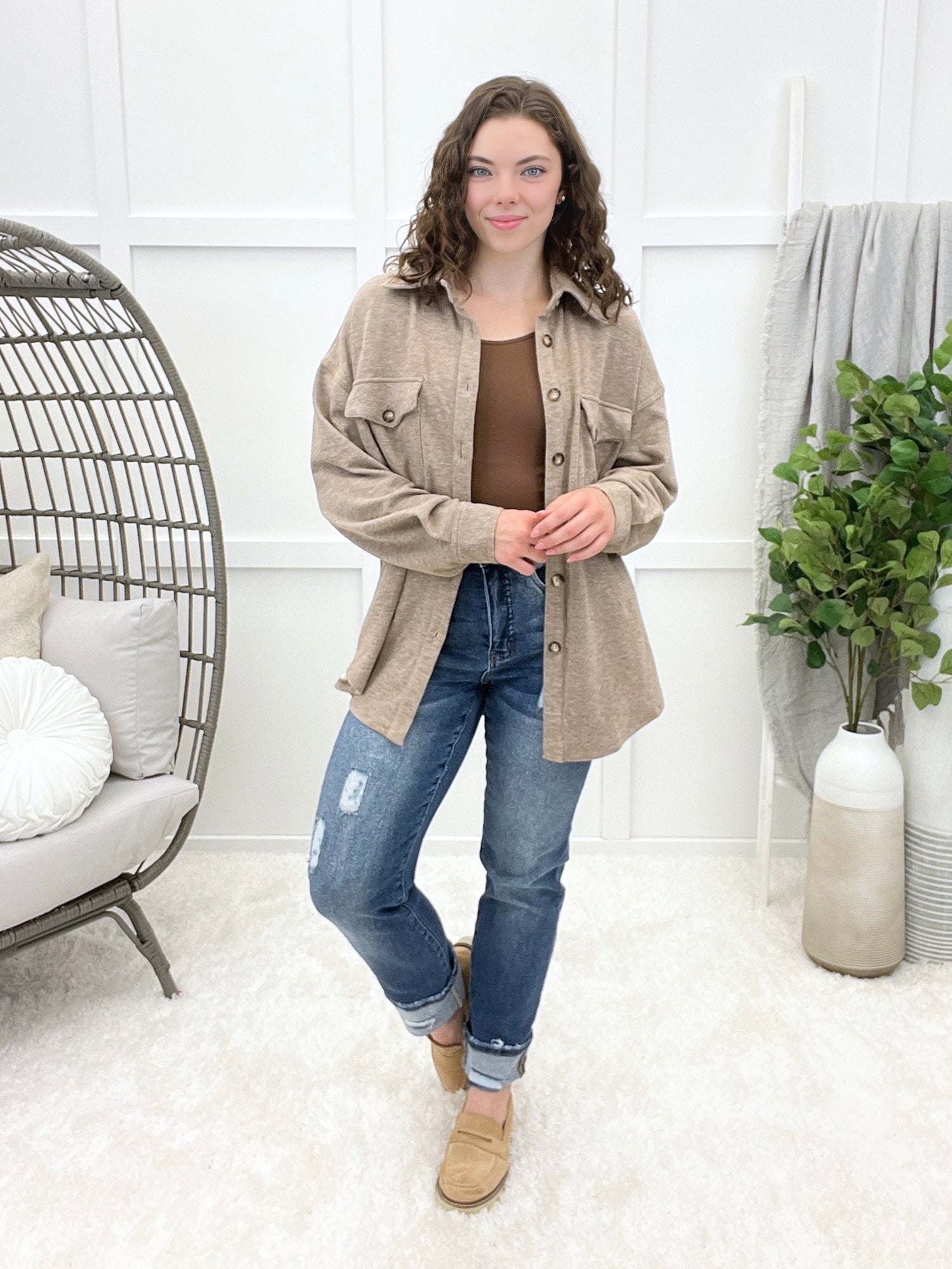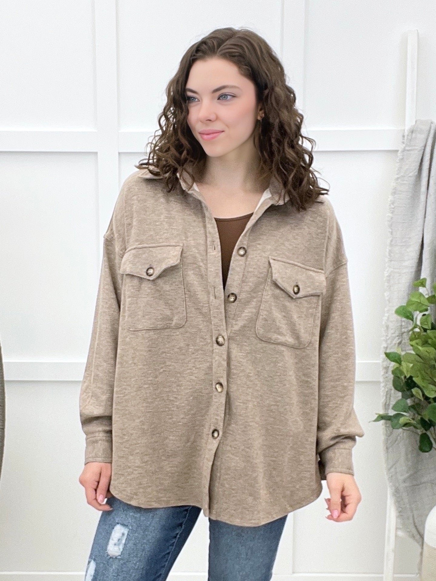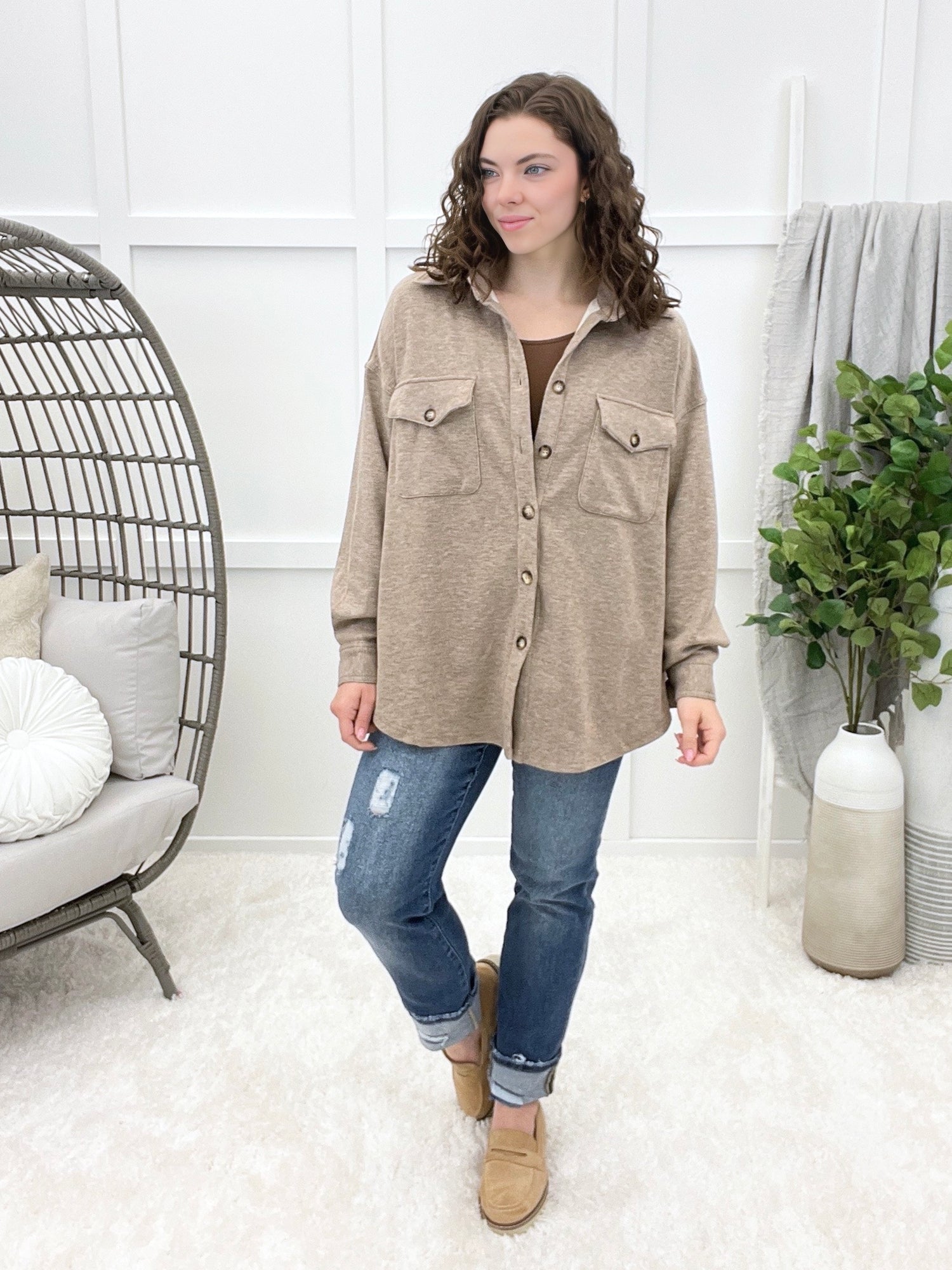 This solid knit shacket is the perfect blend of shirt and jacket, with cozy fleece fabric and a true-to-size fit. The patch pockets and a button-down front give it that laid-back, utility vibe. Layer it over a tee or sweater for an easy, go-anywhere look!