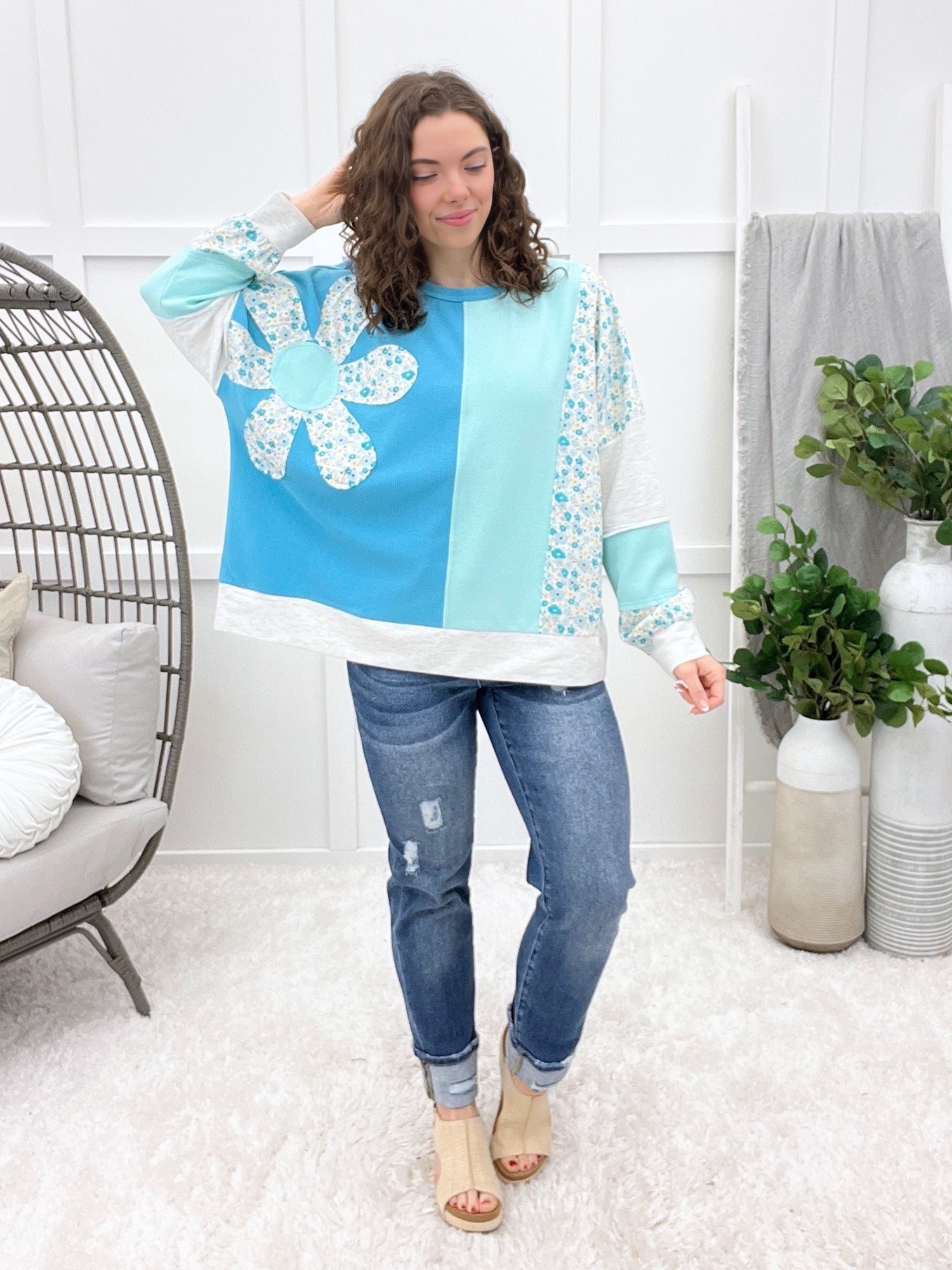 This top is a feel-good favorite! Featuring a round neckline, bubble long sleeves, and a gorgeous floral print, it’s finished with the sweetest woven flower patch detail on a solid textured fabric for the perfect extra pop. Cute, comfy, and easy to style for everyday wear or dressing up!