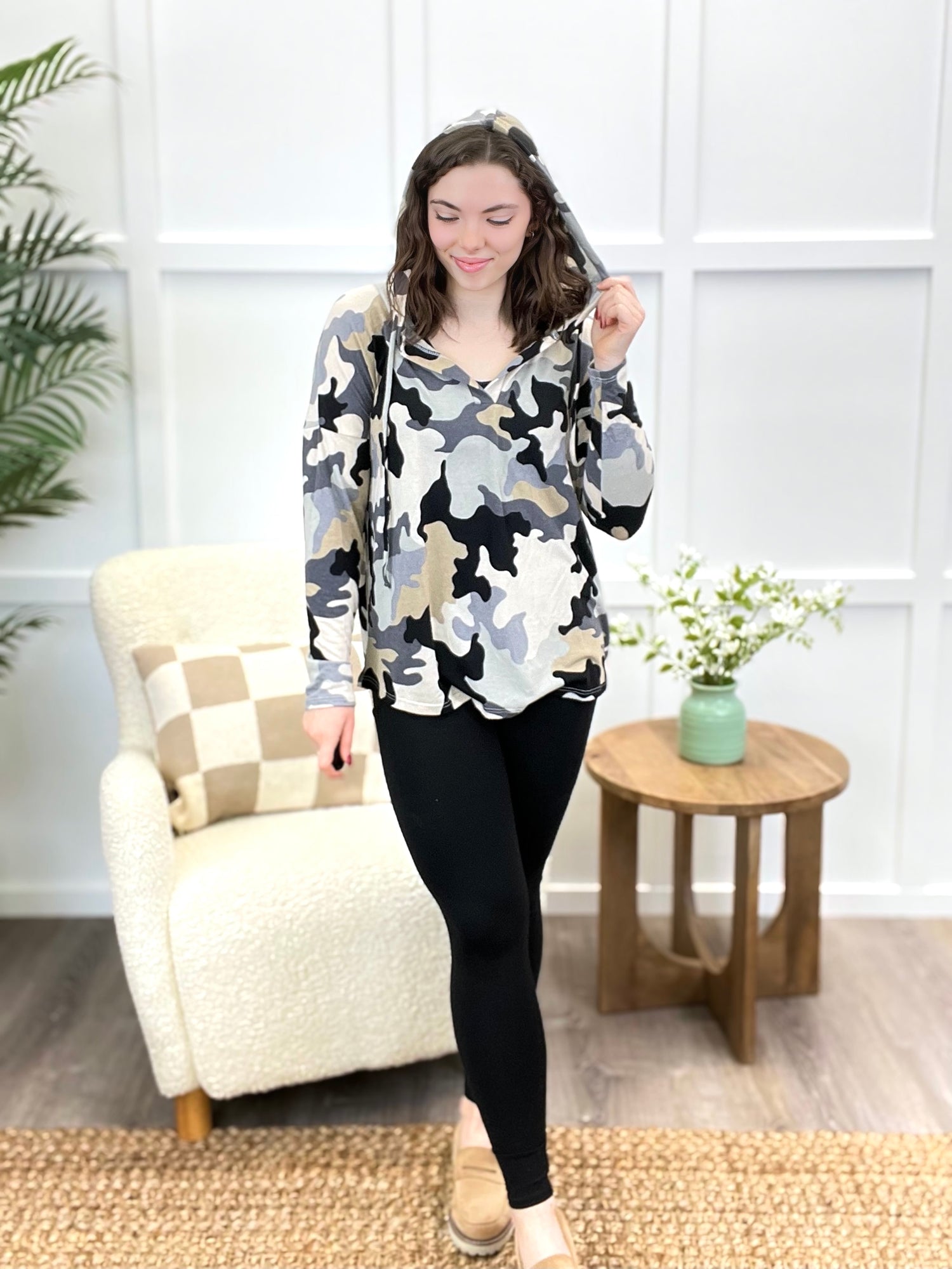 This is a casual, long-sleeve hoodie featuring an all-over camo print in neutral tones, including beige, taupe, cream, and black, giving it a soft, versatile, and contemporary vibe. It has a relaxed fit with a drawstring hood and a flattering V-neckline that adds a stylish edge to the casual look